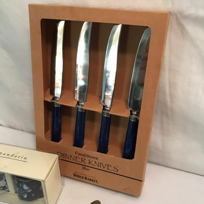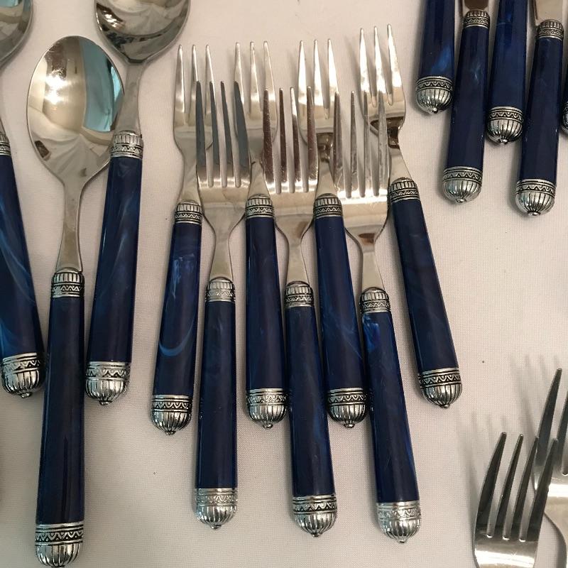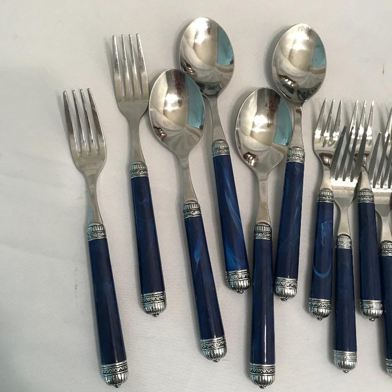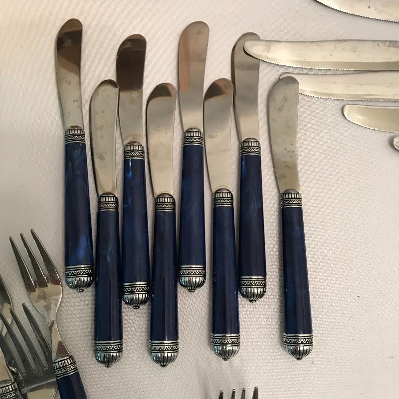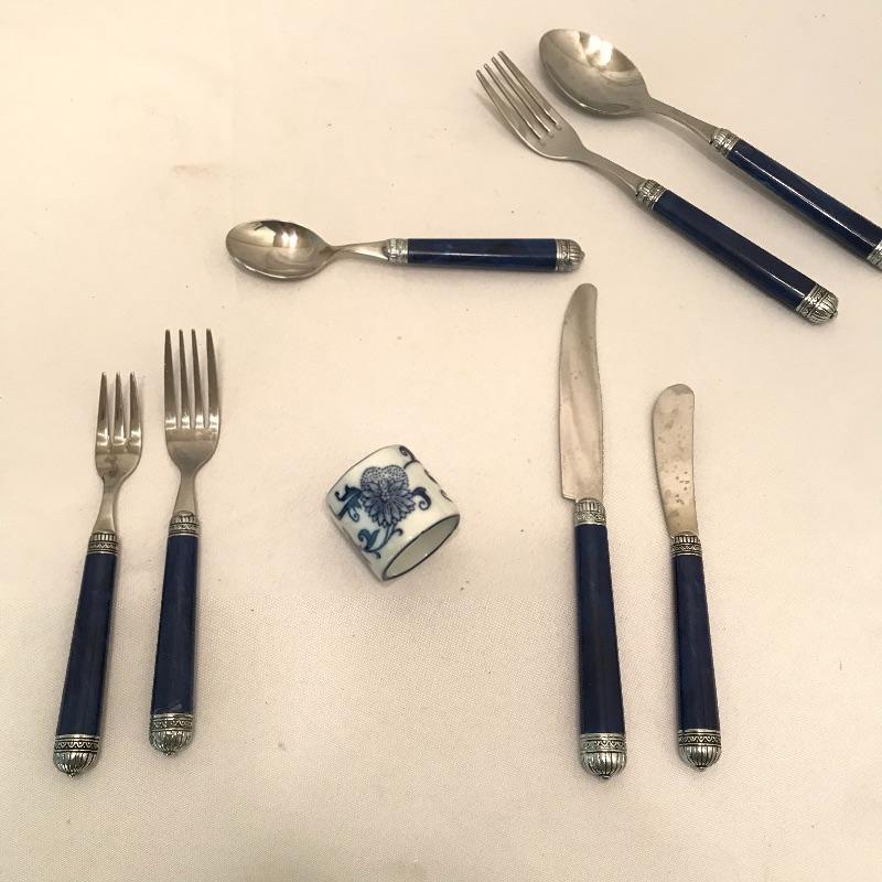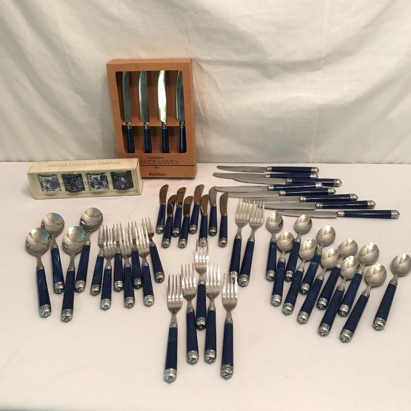 Bring a bit of deep blue to your next meal! Here’s a unique collection of flatware with marble like designed flatware. Four dinner knives from World Market are still boxes. Collection includes twelve dinner knives (including the four still packaged), eight butter knives, eight dinner forks, four salad forks, eleven coffee spoons, four larger serving spoons and two larger forks. We’ve also added four like new porcelain Mandarin Napkin Rings packaged from Pier One. See photos. Shipping available