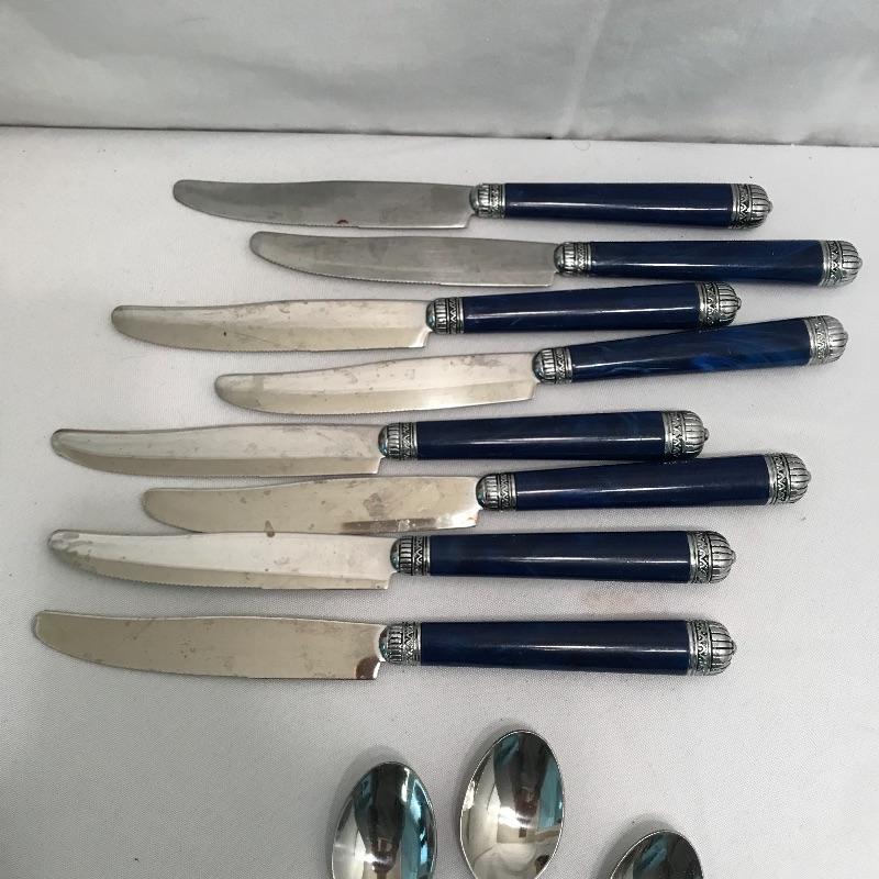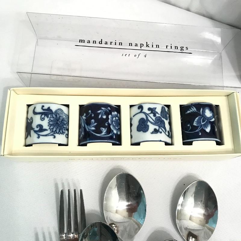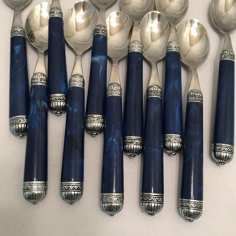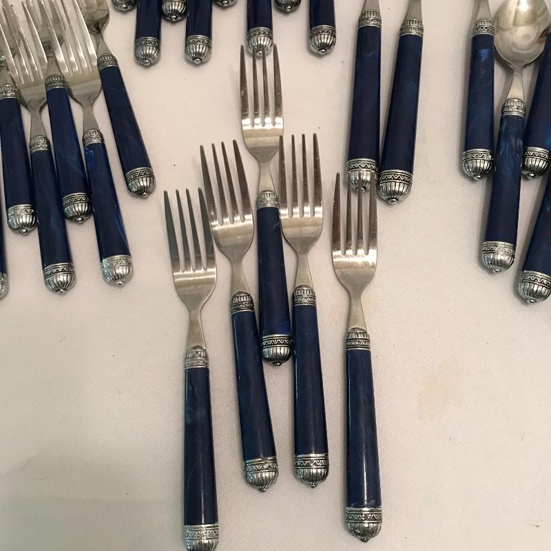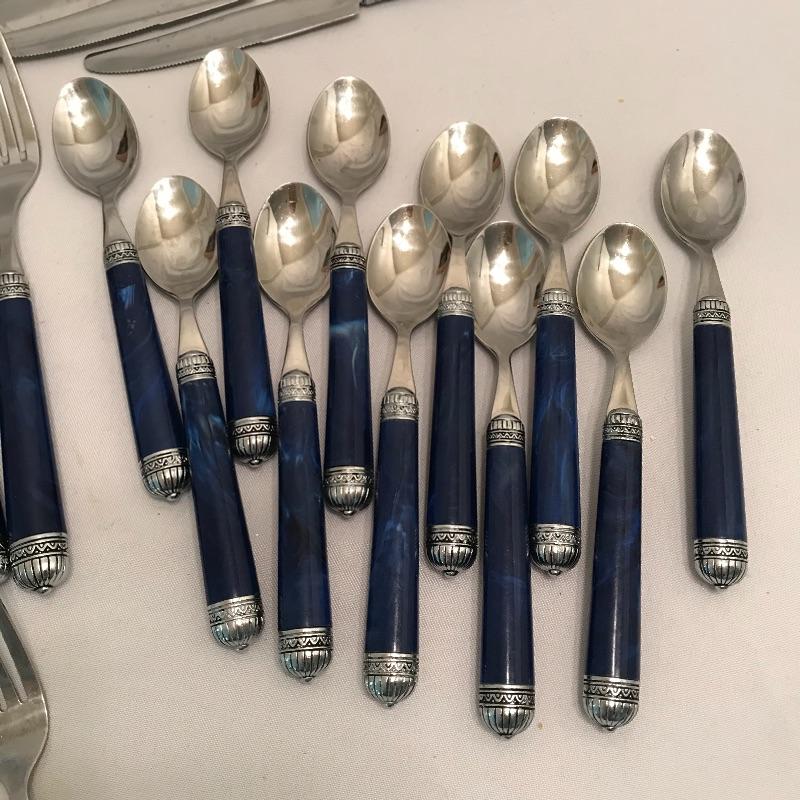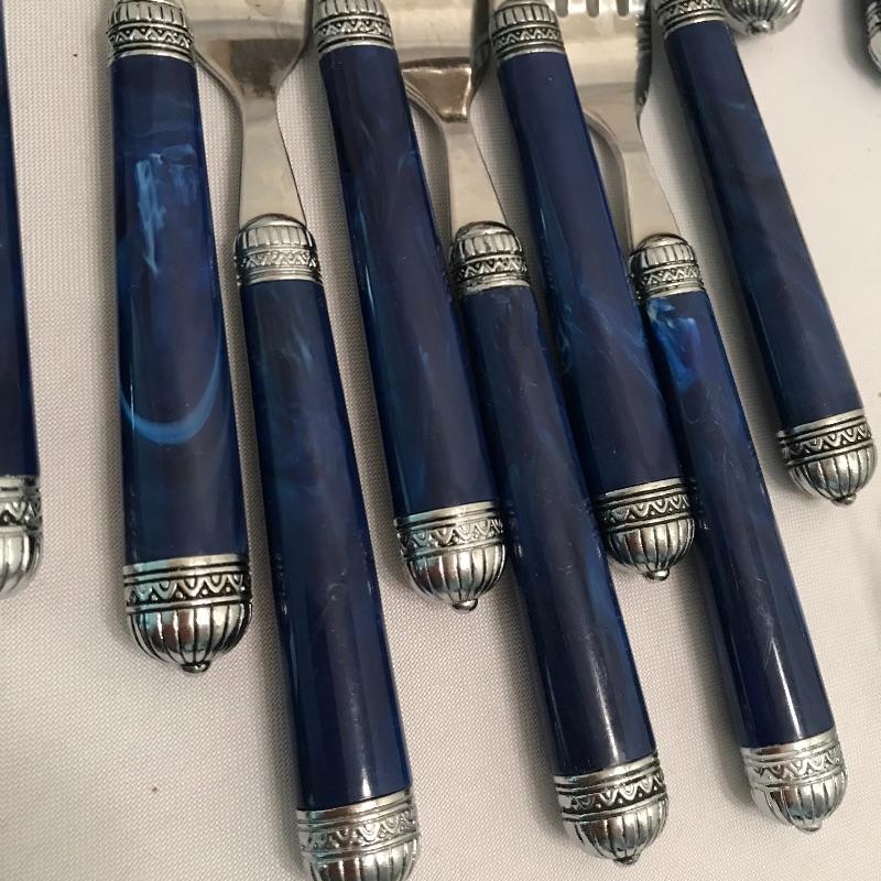 Bring a bit of deep blue to your next meal! Here’s a unique collection of flatware with marble like designed flatware. Four dinner knives from World Market are still boxes. Collection includes twelve dinner knives (including the four still packaged), eight butter knives, eight dinner forks, four salad forks, eleven coffee spoons, four larger serving spoons and two larger forks. We’ve also added four like new porcelain Mandarin Napkin Rings packaged from Pier One. See photos. Shipping available