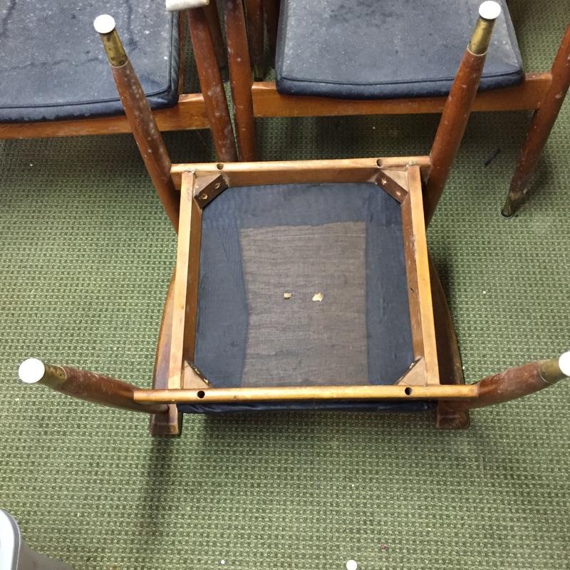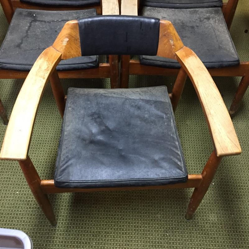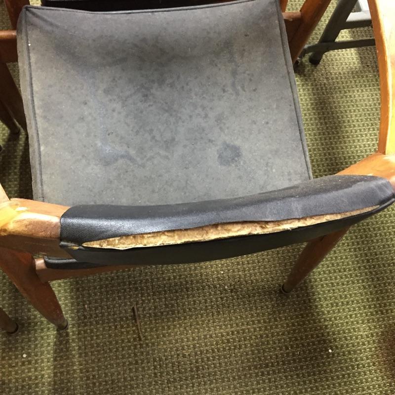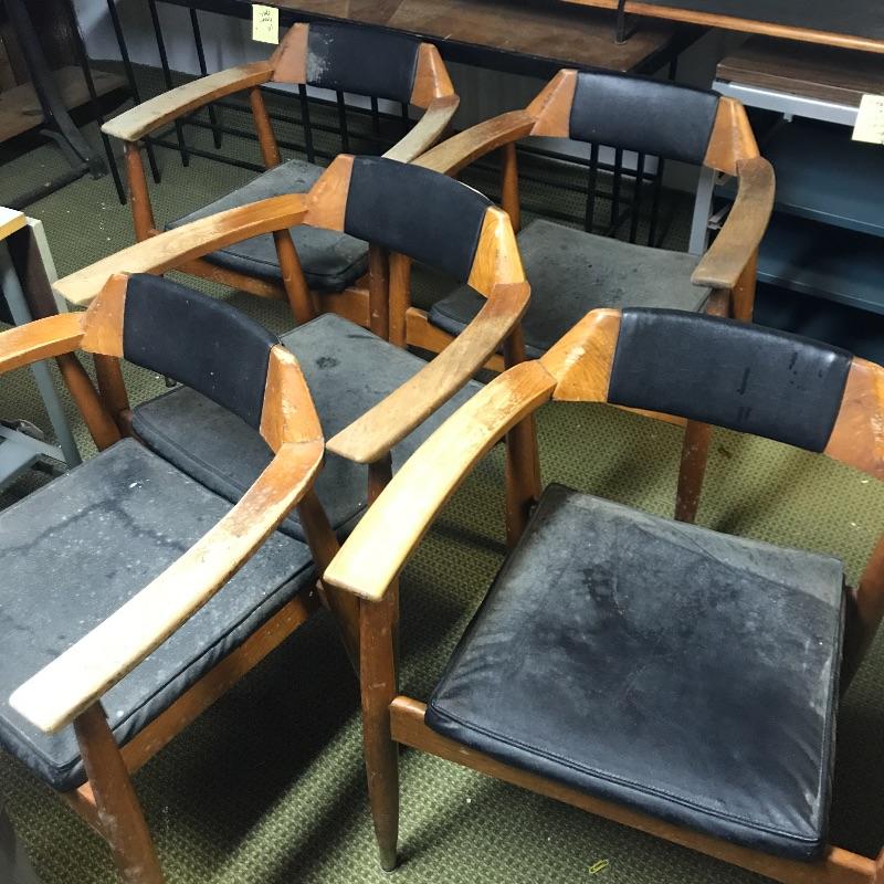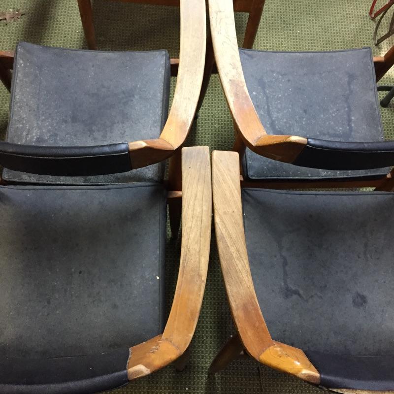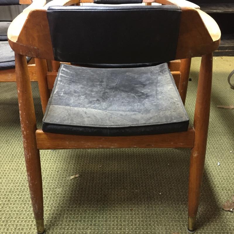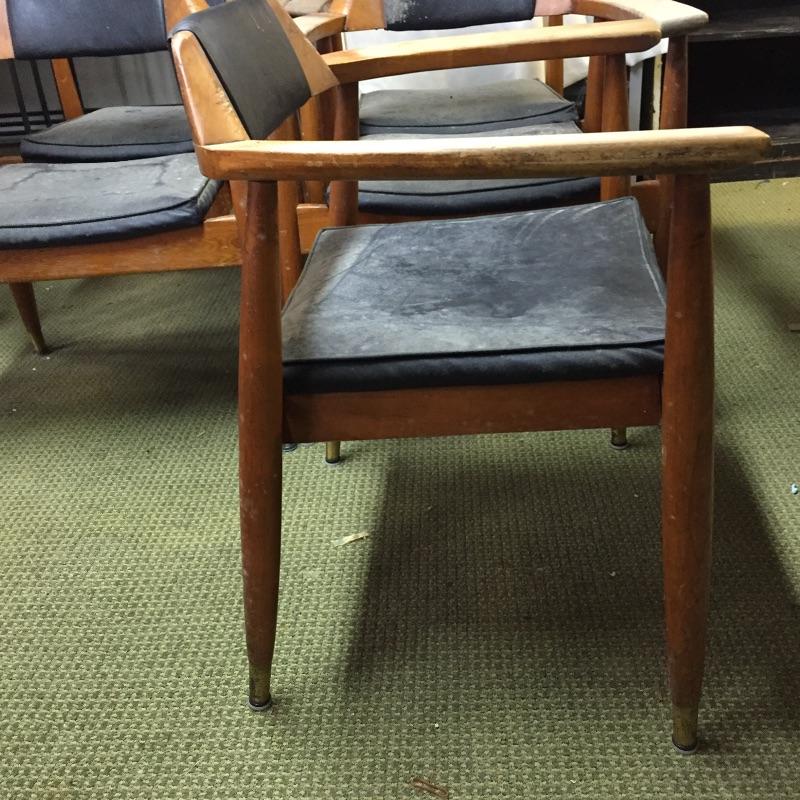 Set of five Mid Century Modern chairs. Chairs need a good clean and the finish is worn on most arms and one back has split in black vinyl upholstery but are solid chairs. Chairs measure 25.5” x 19” x 28”. Seat height 16”.