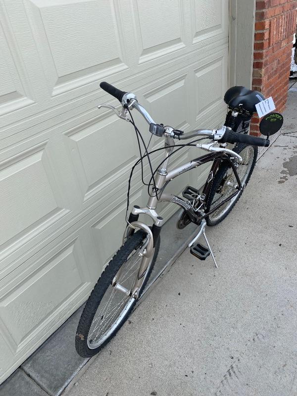 VERY NICE MENS DIAMONDBACK MOUNTAIN BIKE. LARGE 20-WILDWOOD DIAMONDBACK BIKE. HAS SHIMANO GEARS WITH REVOSHIFT FOR EASY GEAR CHANGING,TEKTRO BRAKES, A SUNLITE BAG ON BOTTOM OF SEAT, AVENIR SEAT AND PEDALS. IT IS IN GOOD CONDITION.