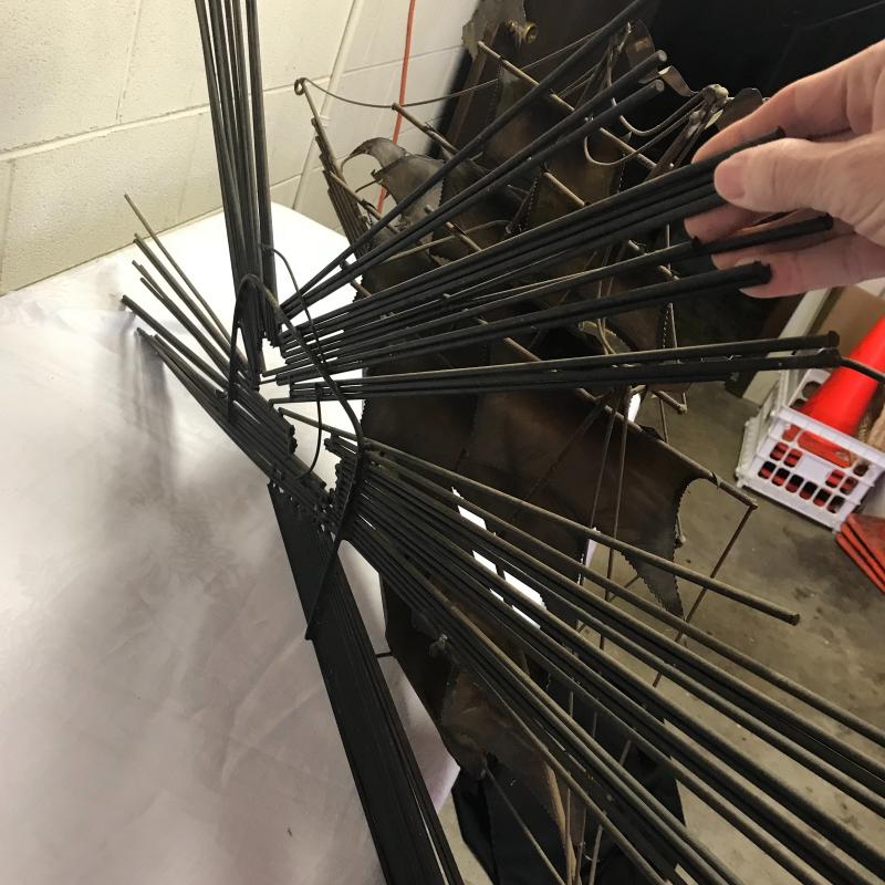 Large wall hanging art made from several metals including brass, aluminum, soldering pieces and more. Piece is quite weighty and solid. Outside approx measurements are 50” x30” x12”. Available for local pick up in Asheville, NC only.