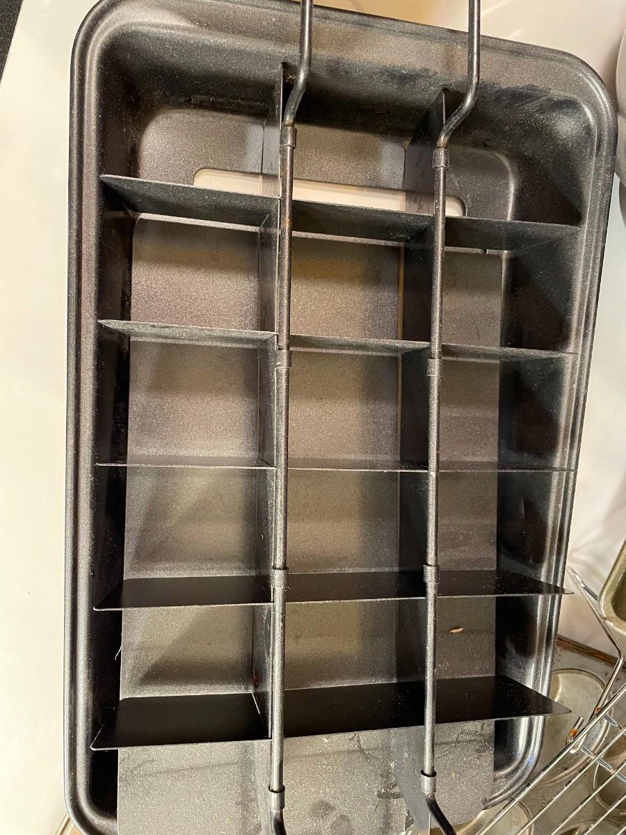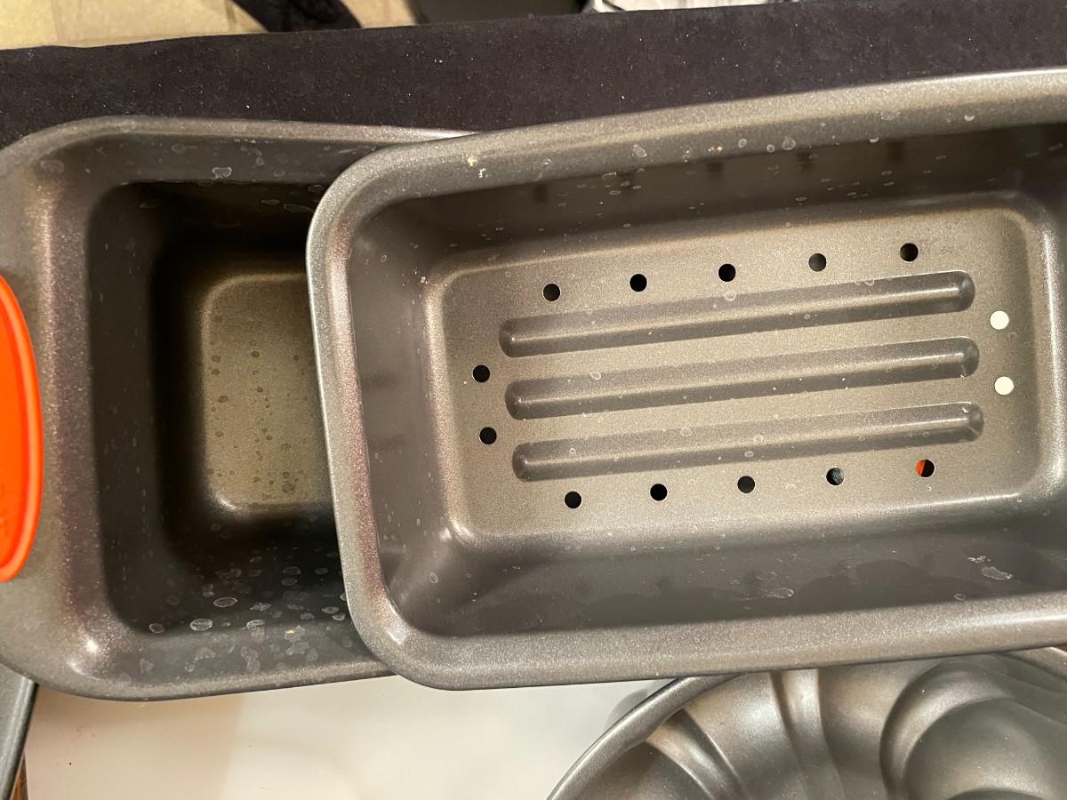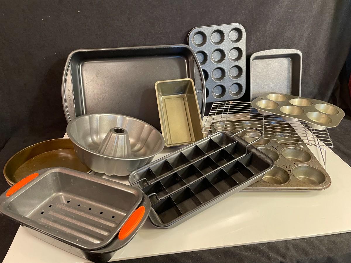 Divided Brownie Pan, Rachael Ray Meatloaf Pan, cake pans, Cooling Meatloaf Pan, 3 Muffin Pans, Loaf Pan and Fluted Pan.