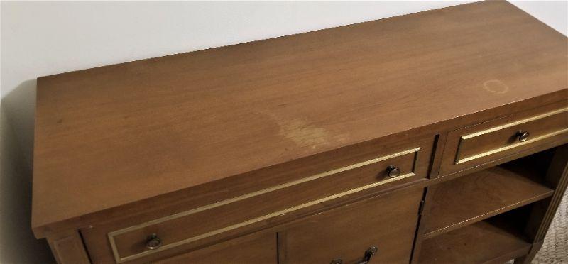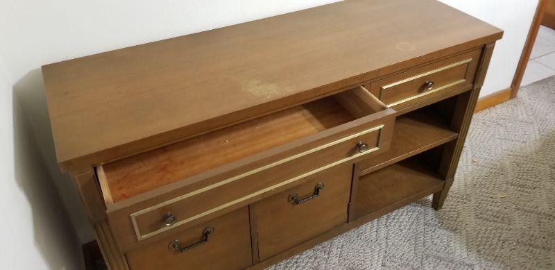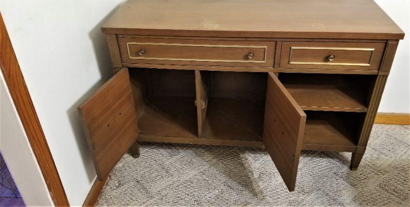 This piece matches the Buffet and China Cabinet listed earlier. No maker's mark. Top has some boo-boos. 4 feet wide, 17" deep, 30" tall. Lots of storage underneath, 2 drawers. This would actually be a good cabinet to set a large flat screen tv on, with room underneath for components, etc.