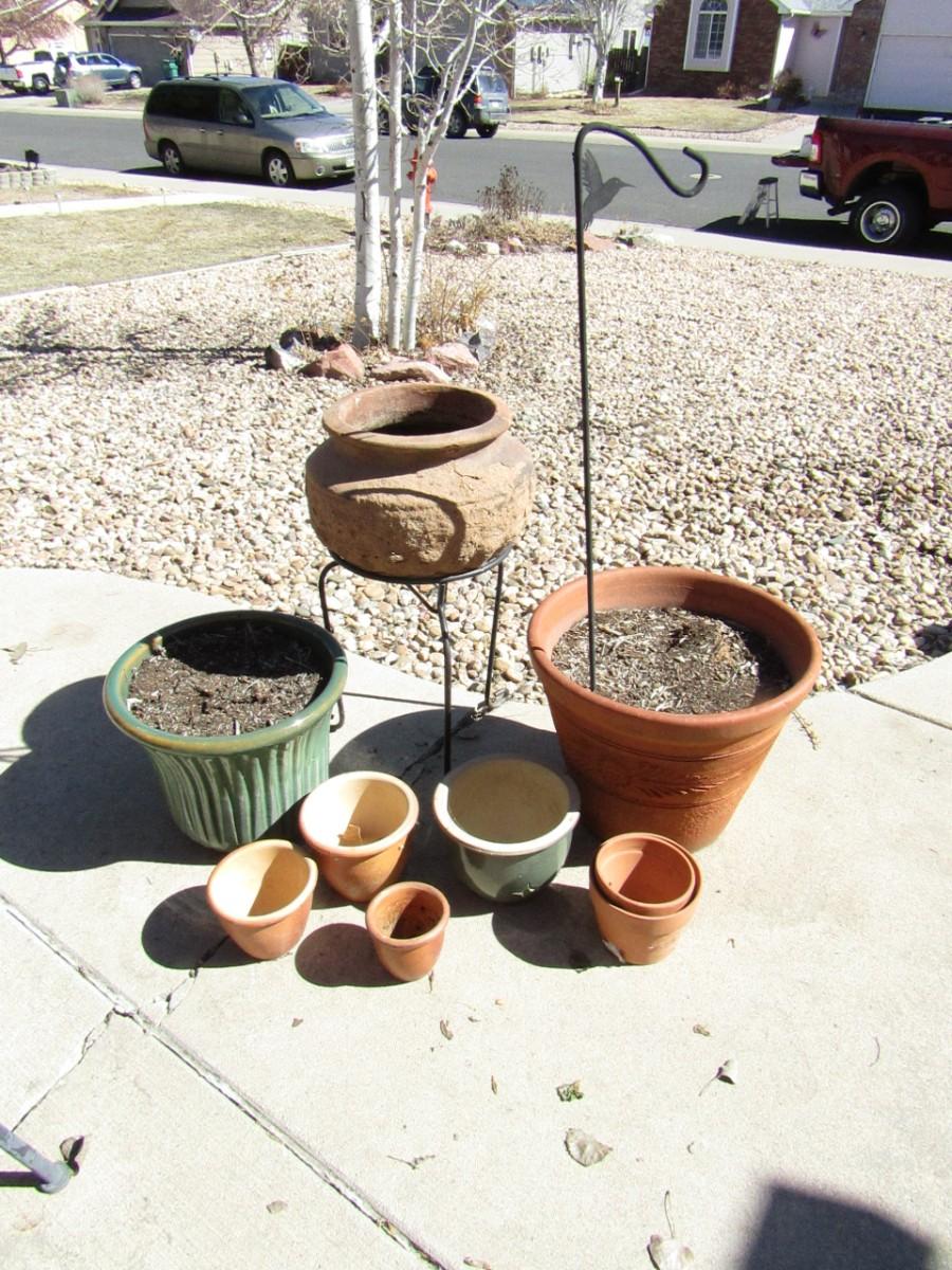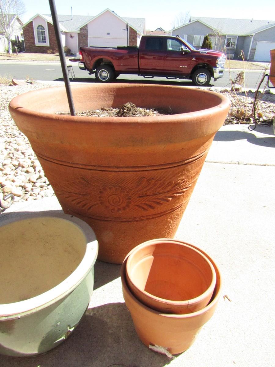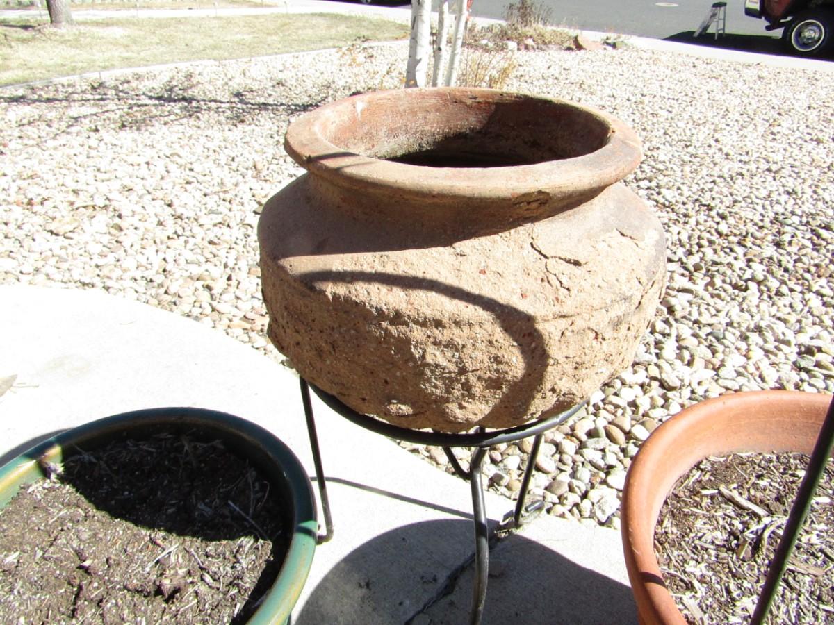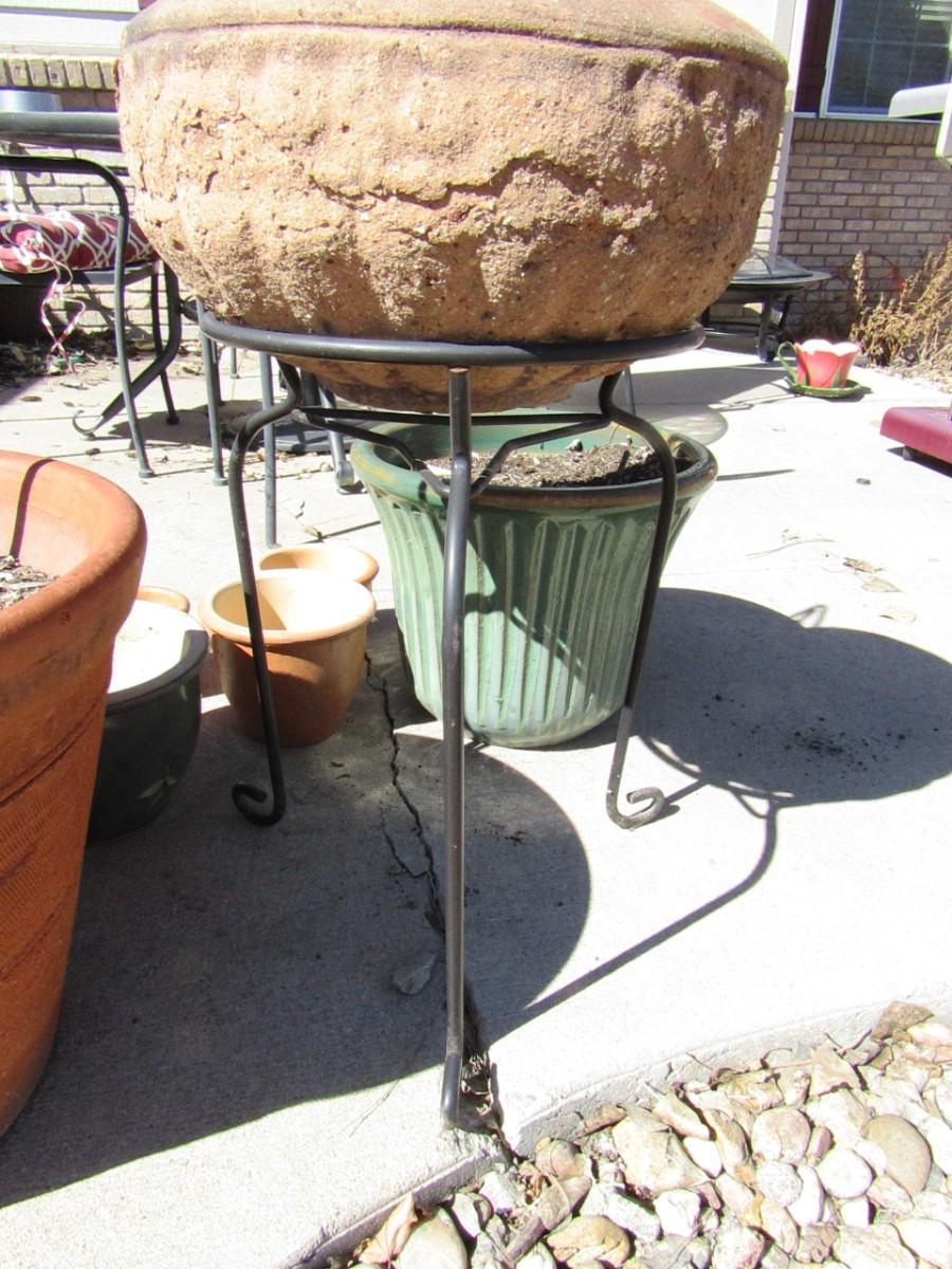 PLANT STAND 20". TALL, VARIETY OF FLOWER POTS & A SHORT SHEPHERDS HOOK.