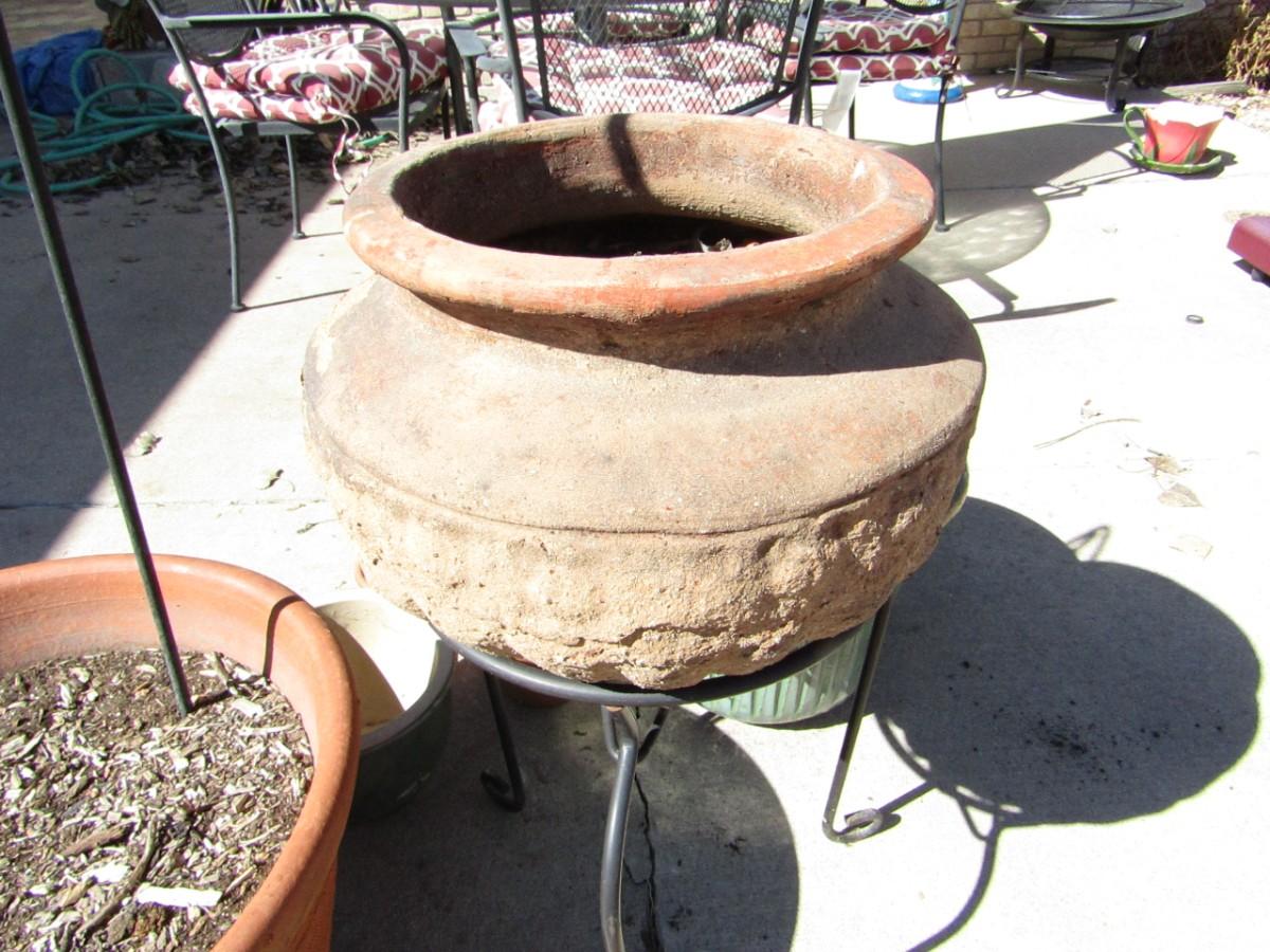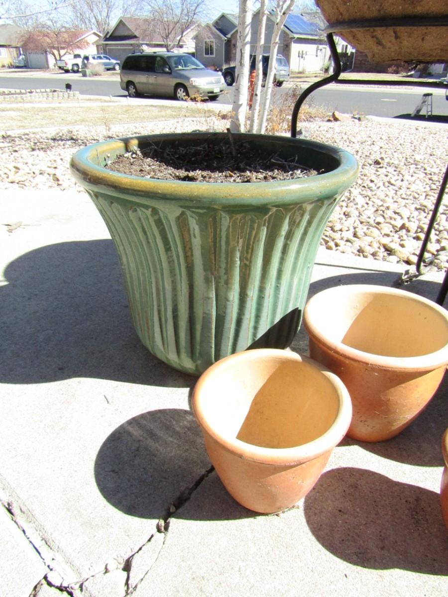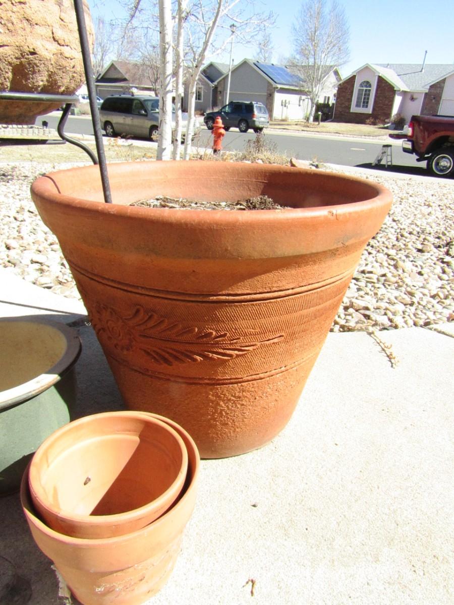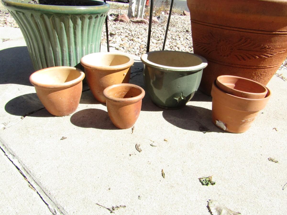 PLANT STAND 20". TALL, VARIETY OF FLOWER POTS & A SHORT SHEPHERDS HOOK.