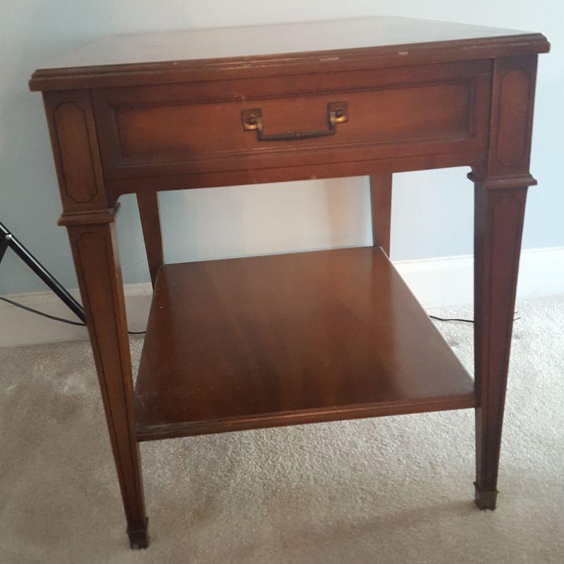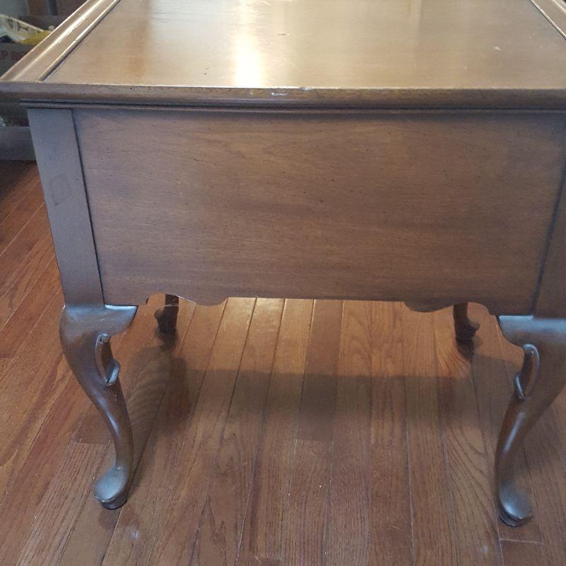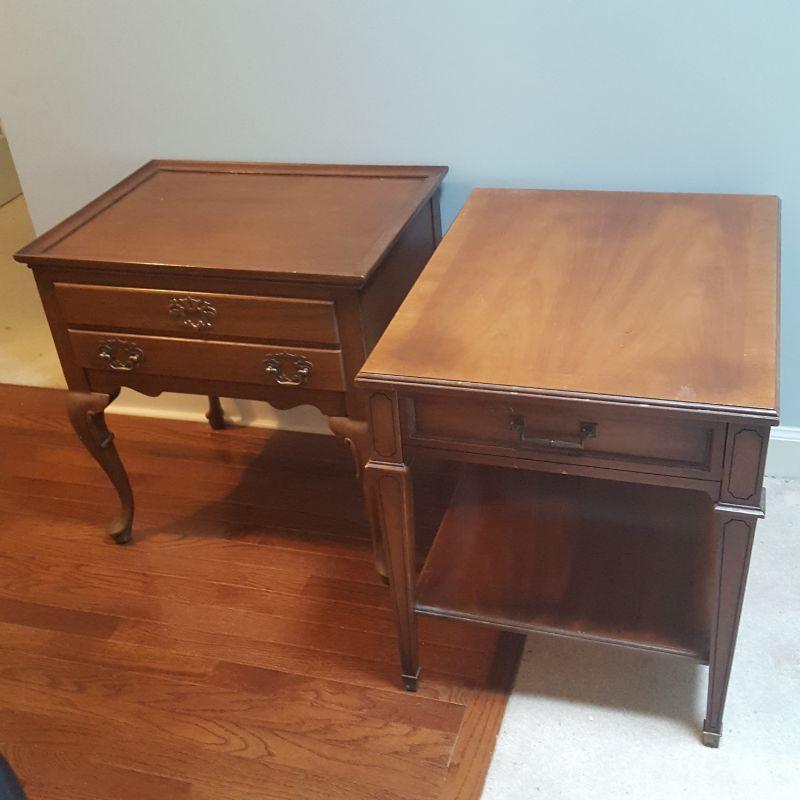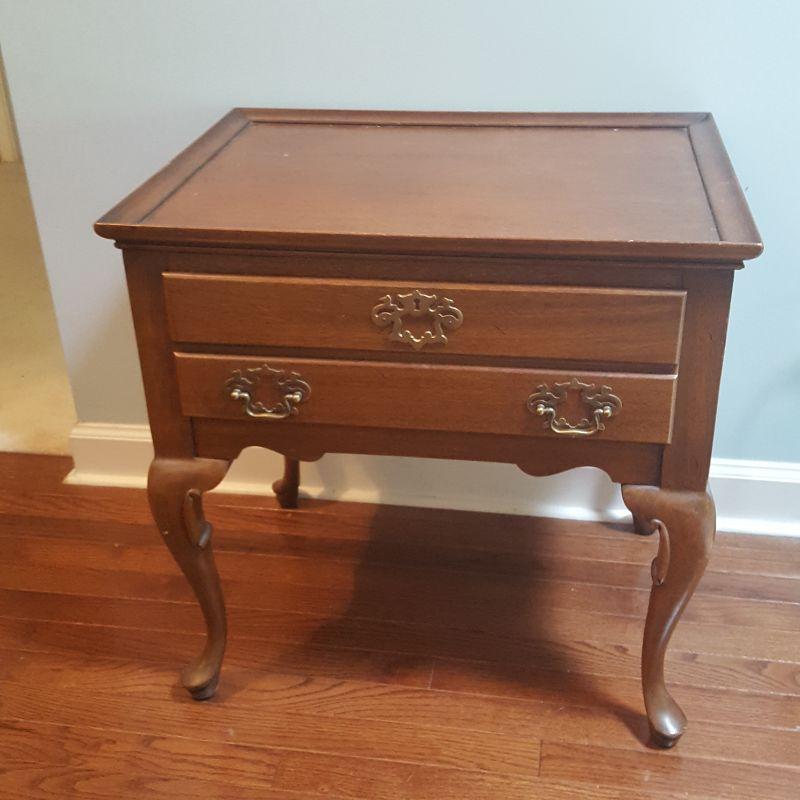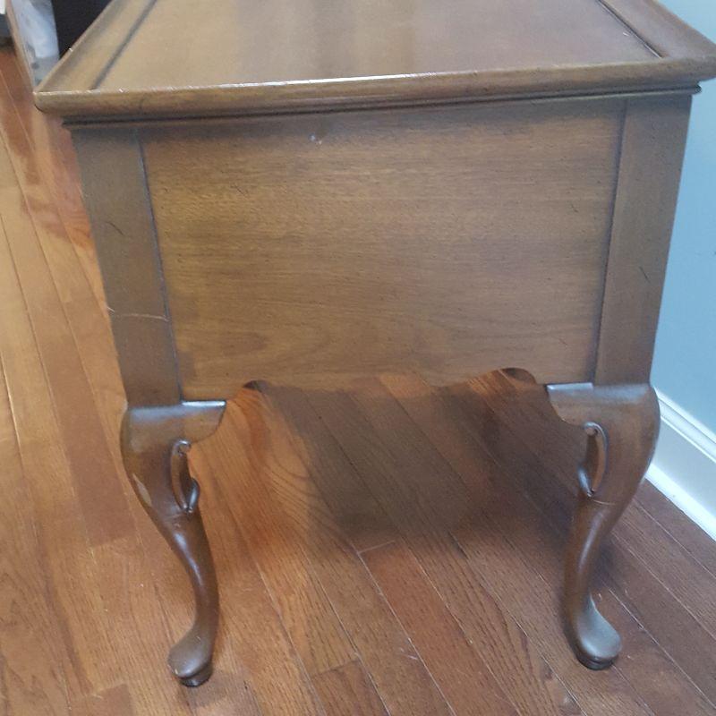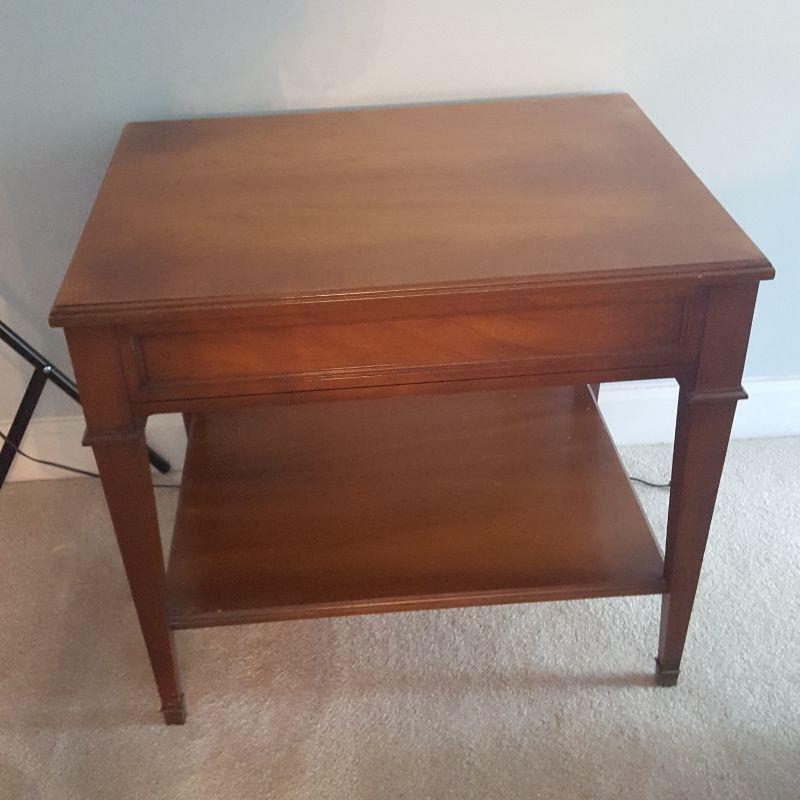 This lot comes with two nice looking end tables, both featuring dove tail drawers. The first one is made of mahogany and has beautiful Edwardian style details, see pictures. There are two minor scratches on it, see pictures. It measures 24 x 18 x 24 in. The second one is made by Heritage and has a more worn table top. This table measures 20 x 26 x 23 in