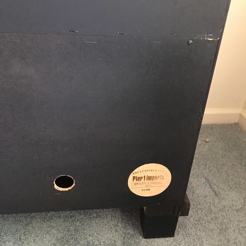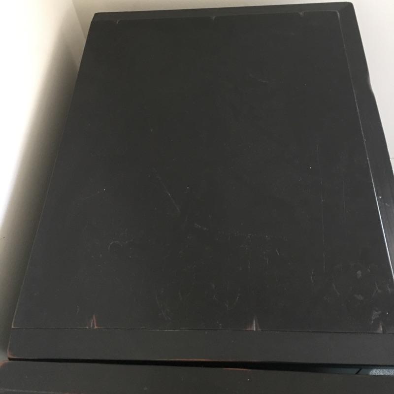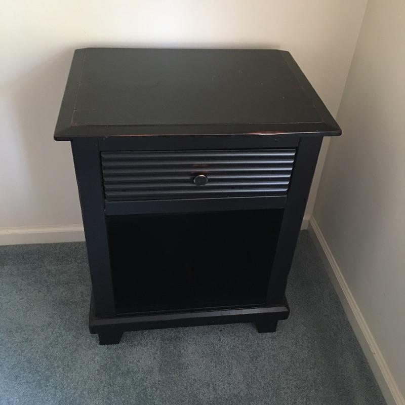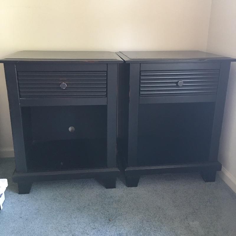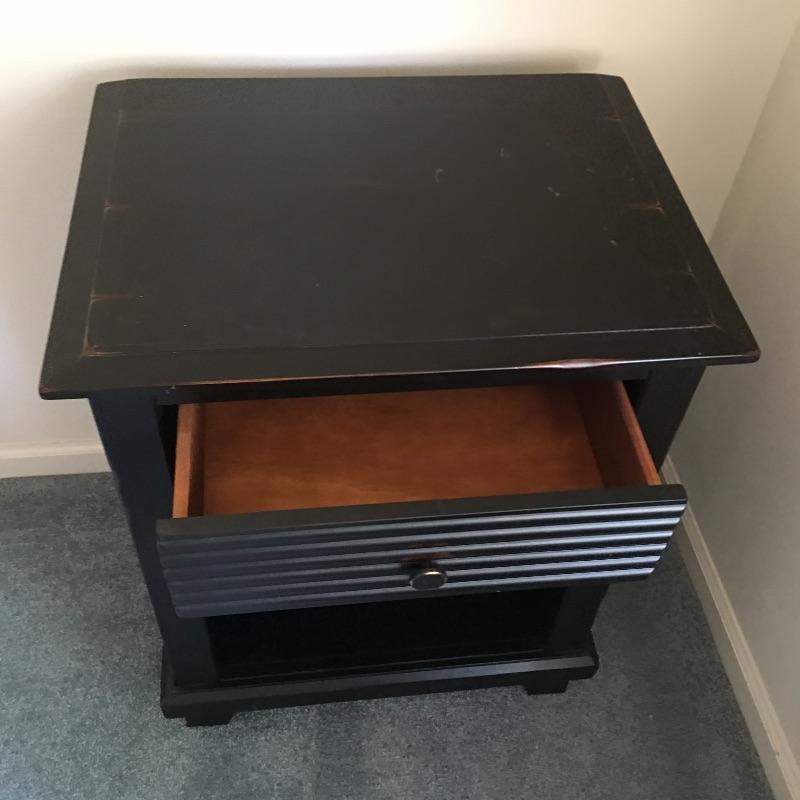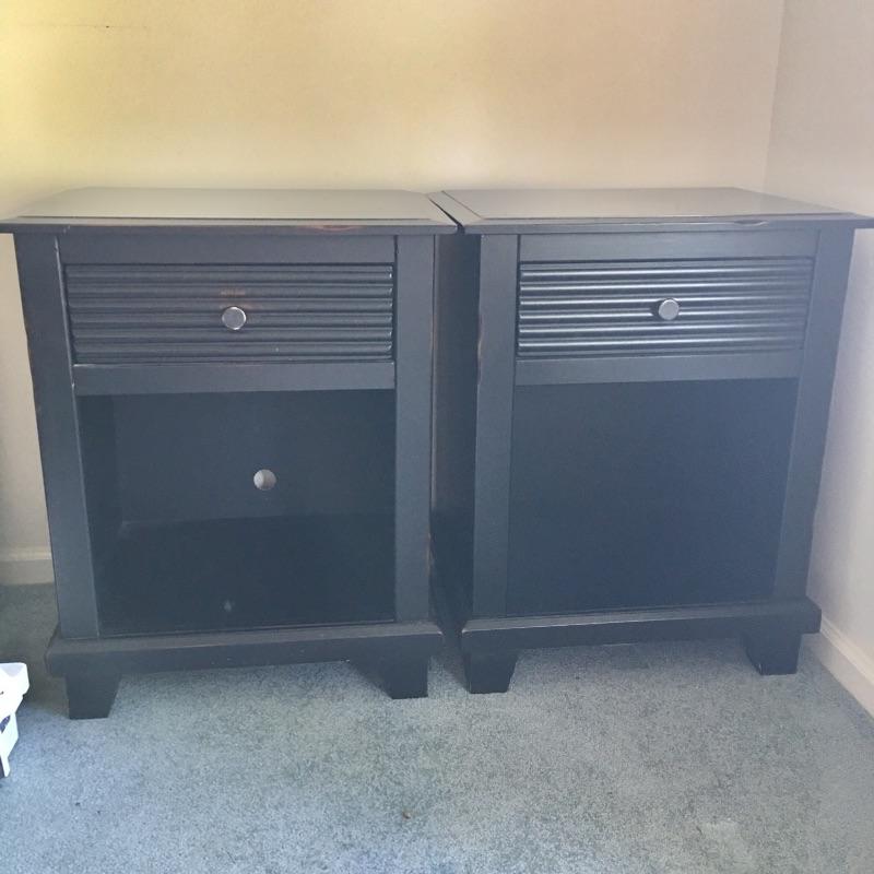 Pair of Pier One sleek black side tables both with a drawer apiece and space underneath for storage. Tables measure 17” x 22.75” x 28”.