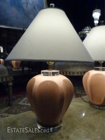 LOT 117: PAIR VINTAGE CERAMIC AND LUCITE LAMPS, LUCITE BASES, FINIALS, AND ACCENTS, FLUTED CERAMIC BODY, EXCELLENT CONDITION, 29"H, SKU6132.04