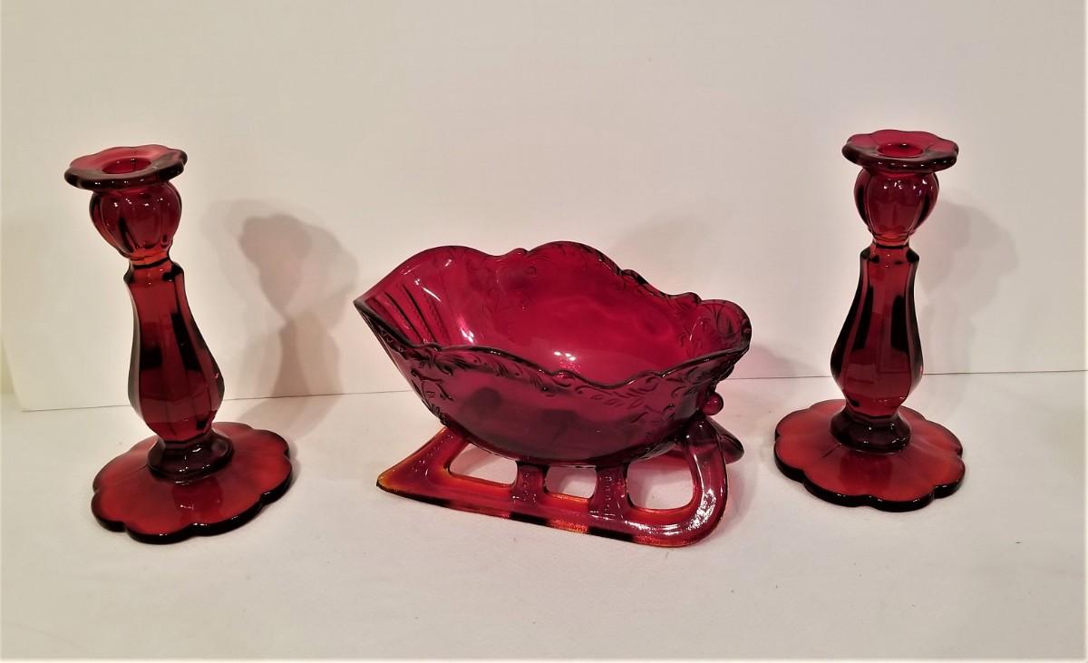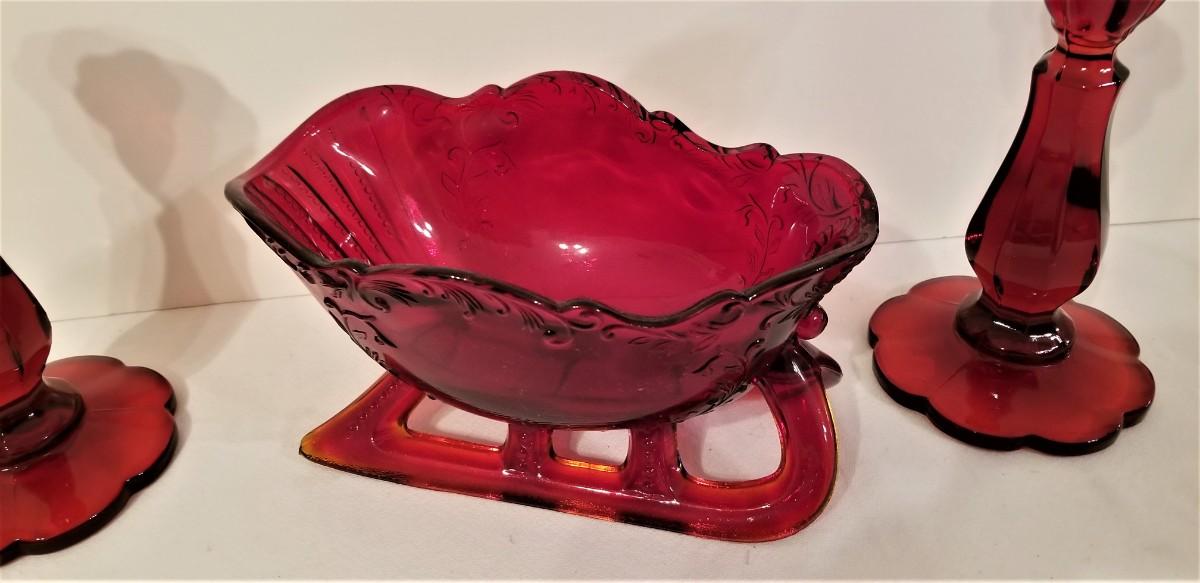 Deep Ruby Red Glass Sleigh and Candlesticks - would make a great centerpiece container for the holidays. Good condition. Candlesticks are 8.5" tall, sleigh is 9.5" across by 5" tall.