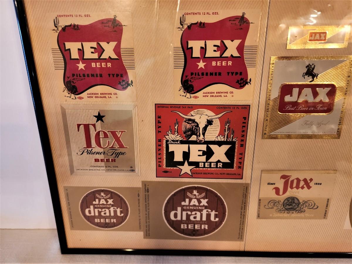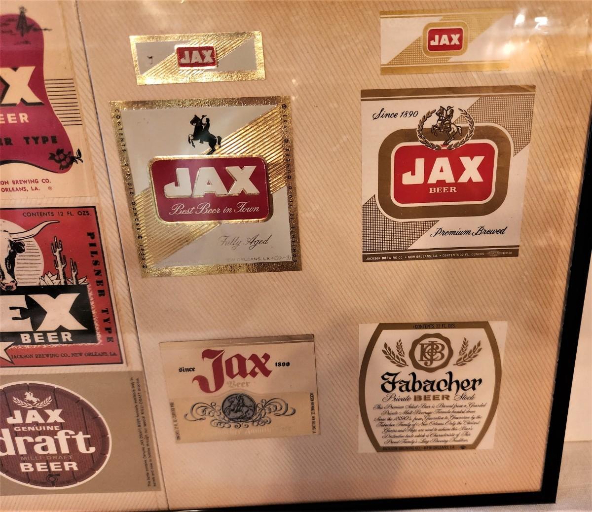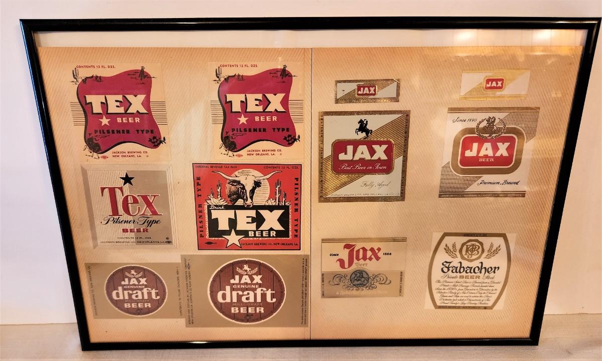 Unused Jax Draft, Jax, Tex, and Fabacher beer labels in frame - 10 in all. Frame measures 18" x 12".