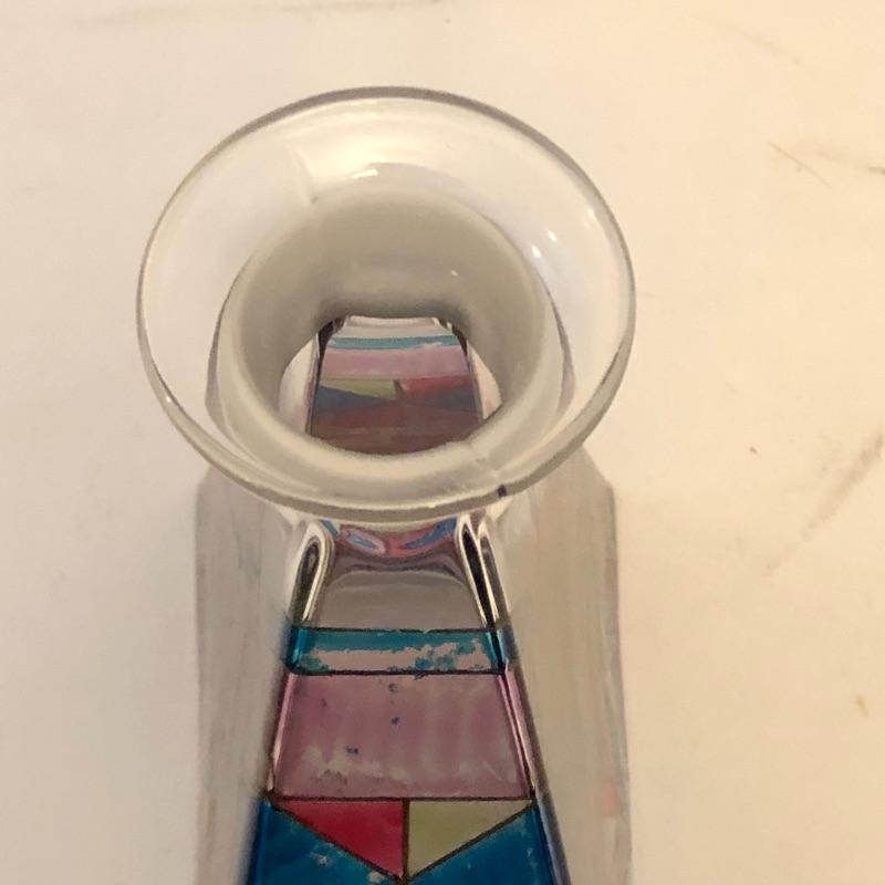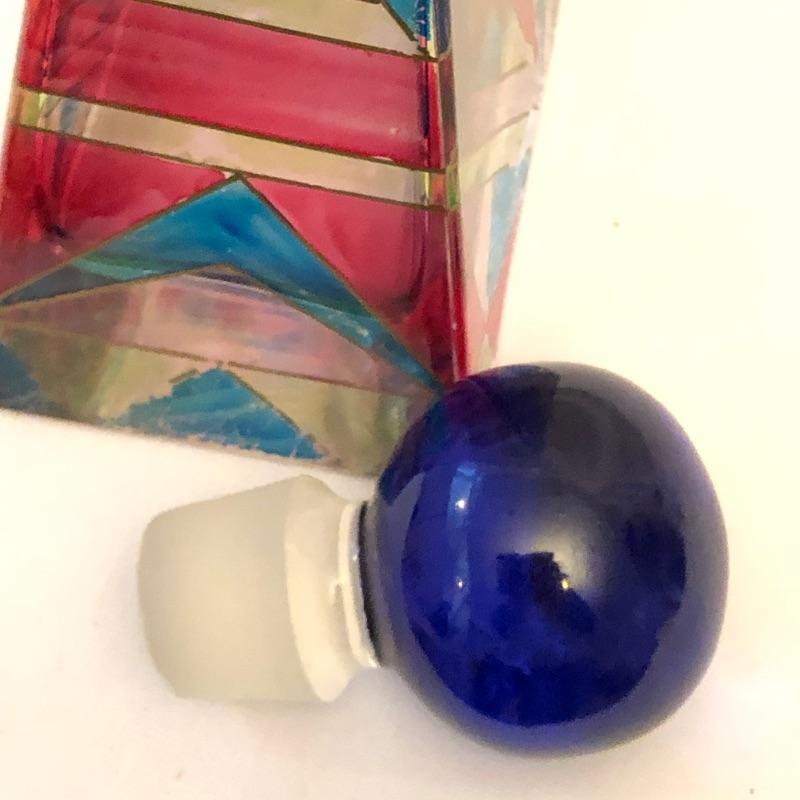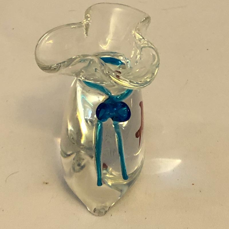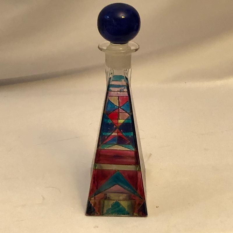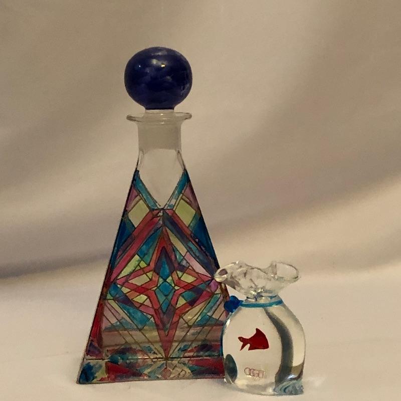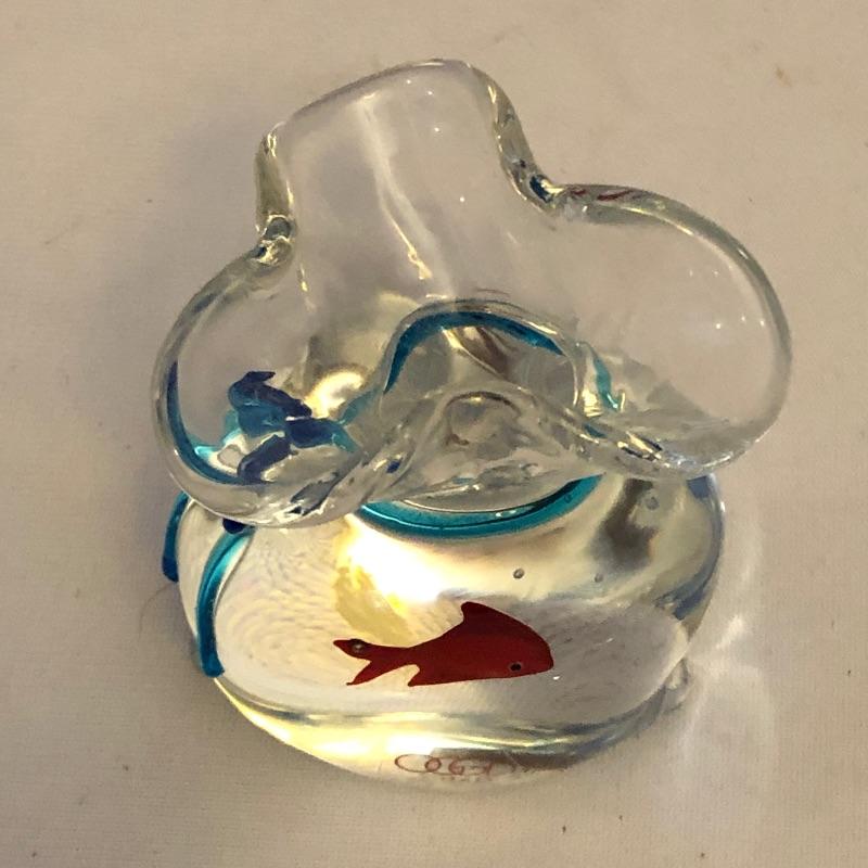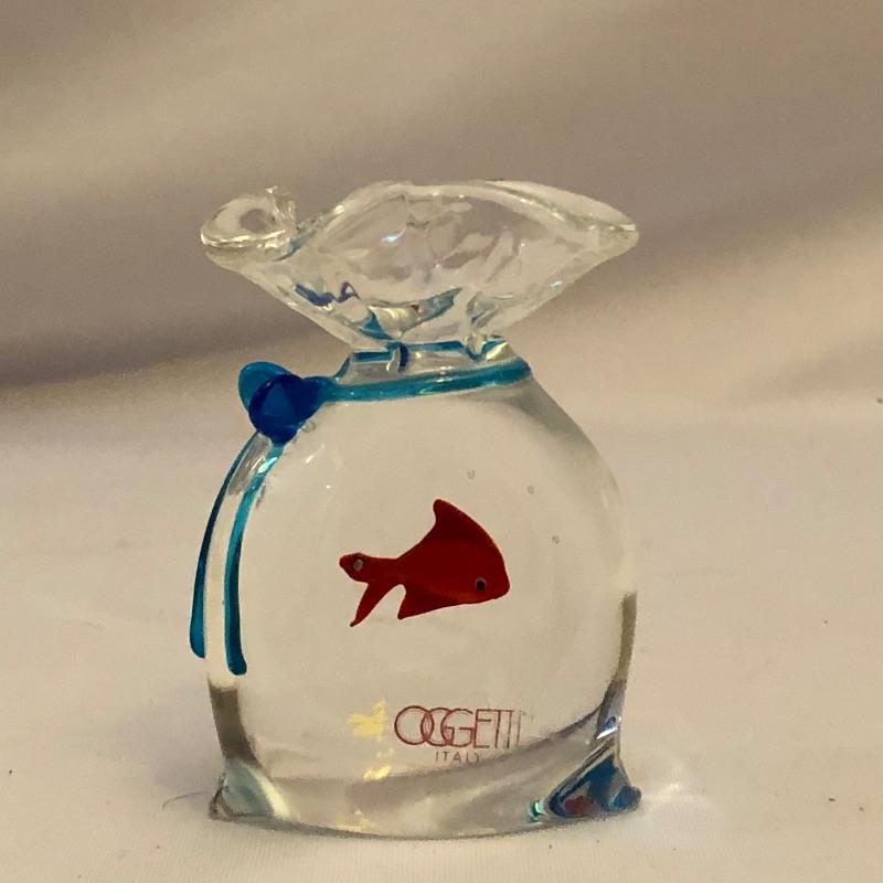 Bold and interesting colored glass decanter and a signed Oggetti decorative glass fish piece from Italy.