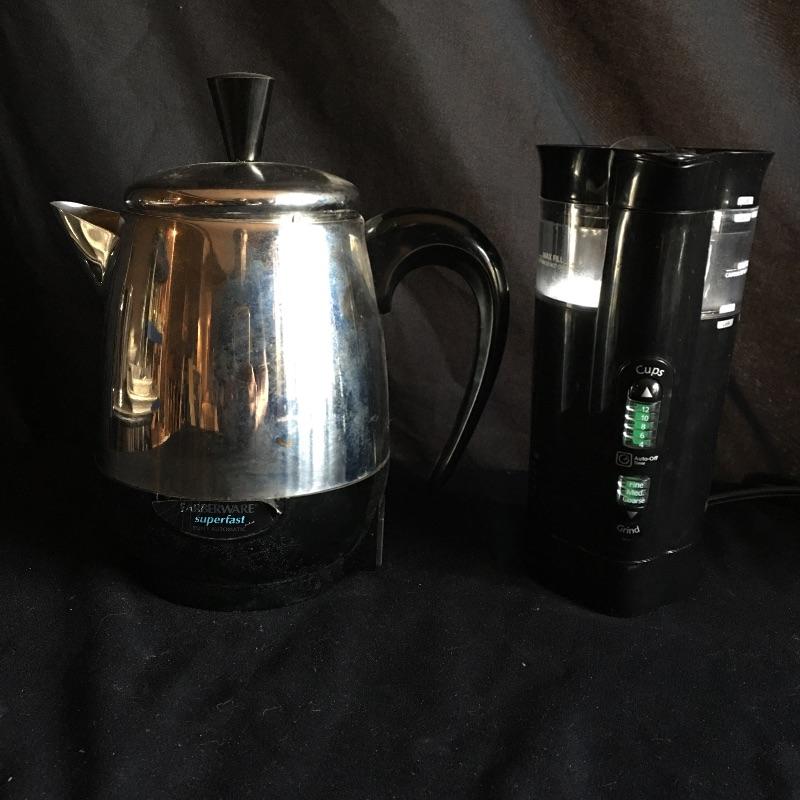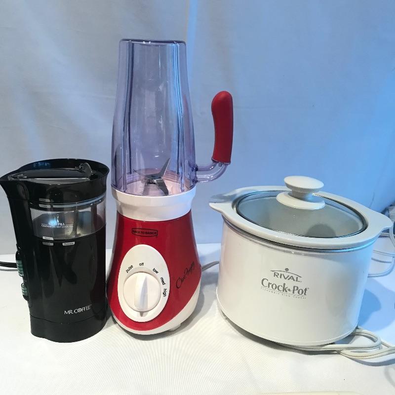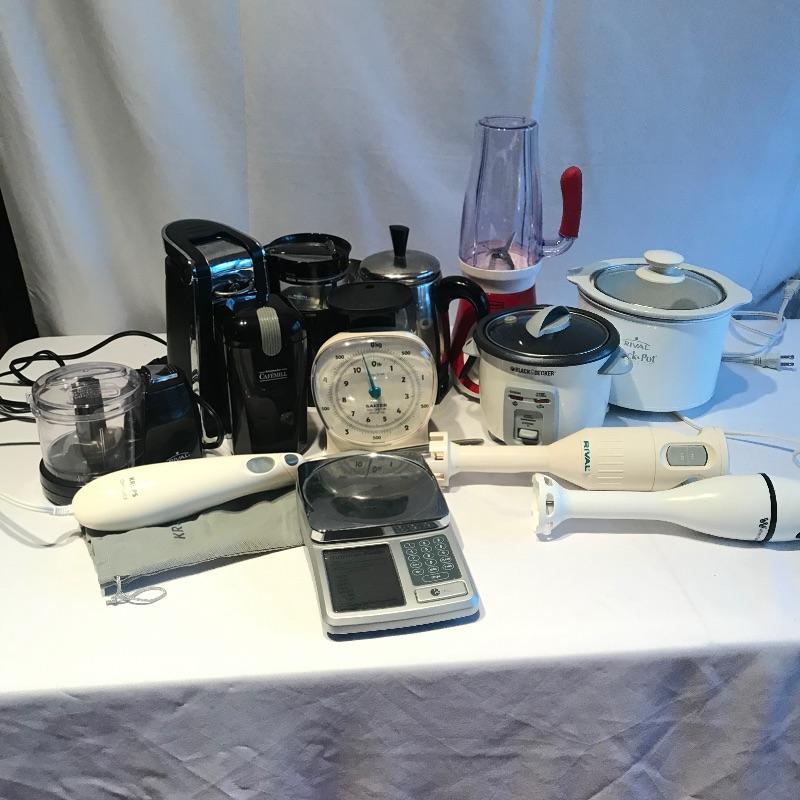 This large collection of kitchen appliances includes Rival Crock Pot, Farberware percolating coffee pot, Black and Decker slow cooker, Mr Coffee grinder, Hamilton Beach can opener, Back to Basics Blender, Krups electric knife, scales and more. All items powered on when tested.