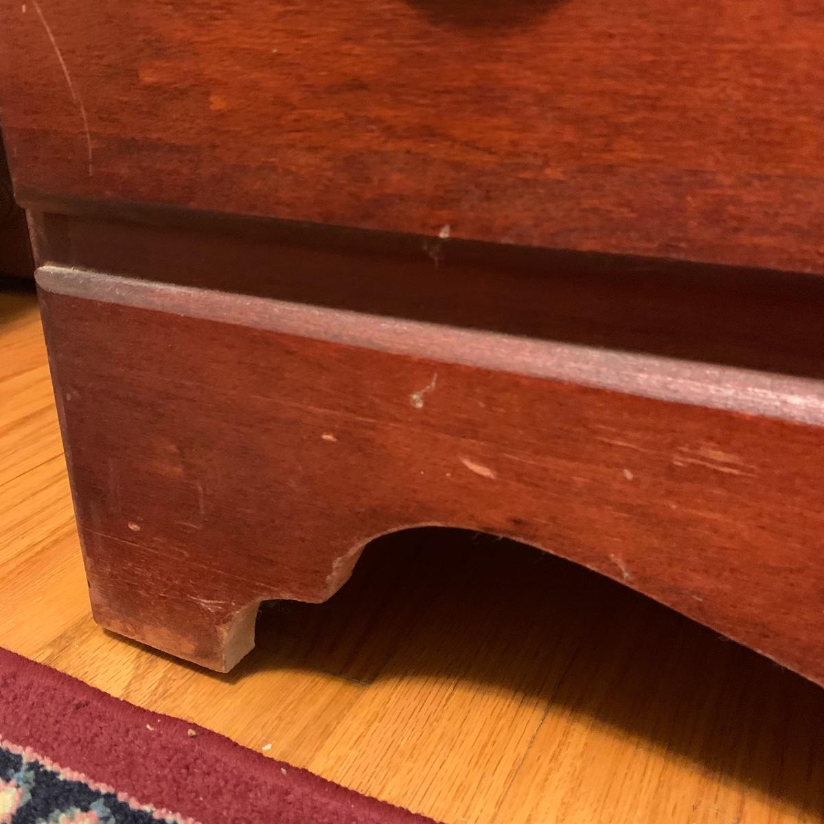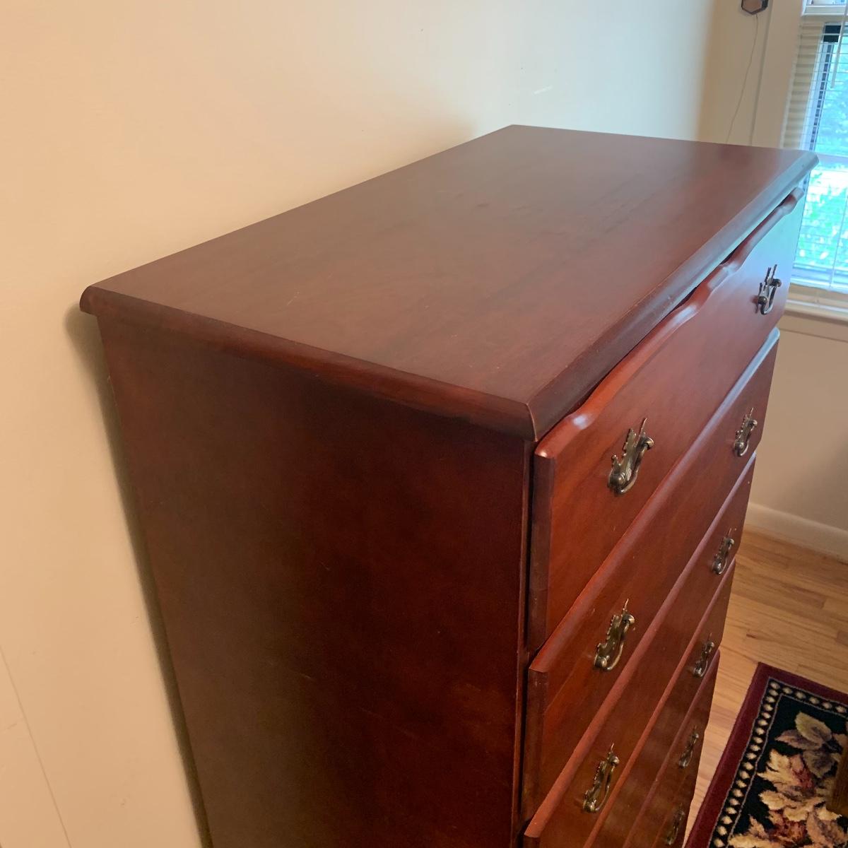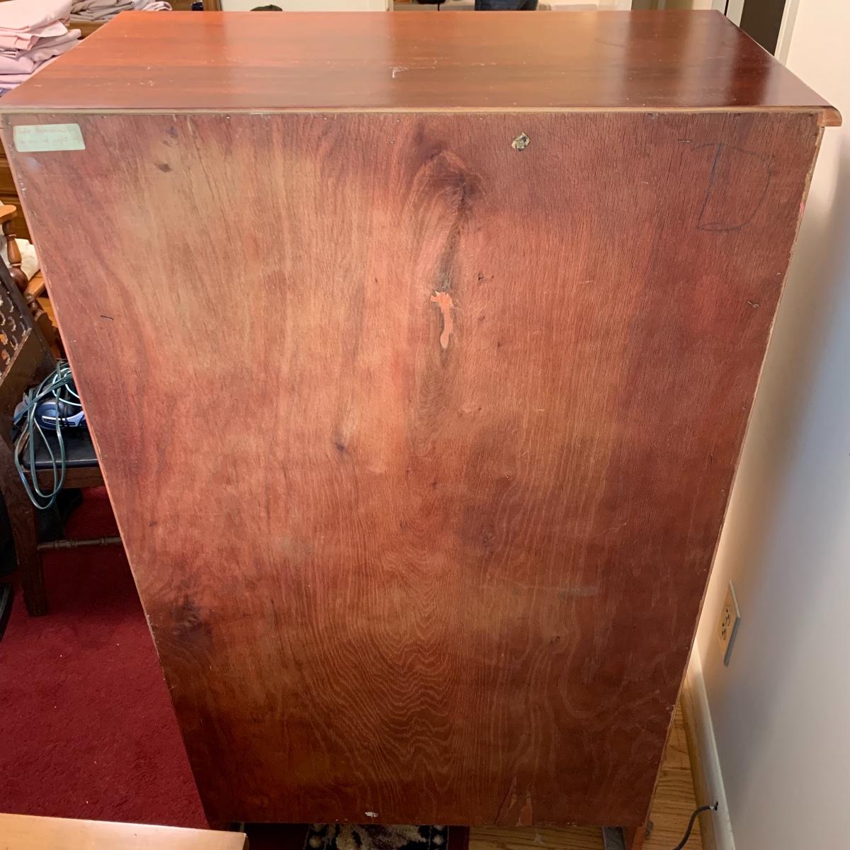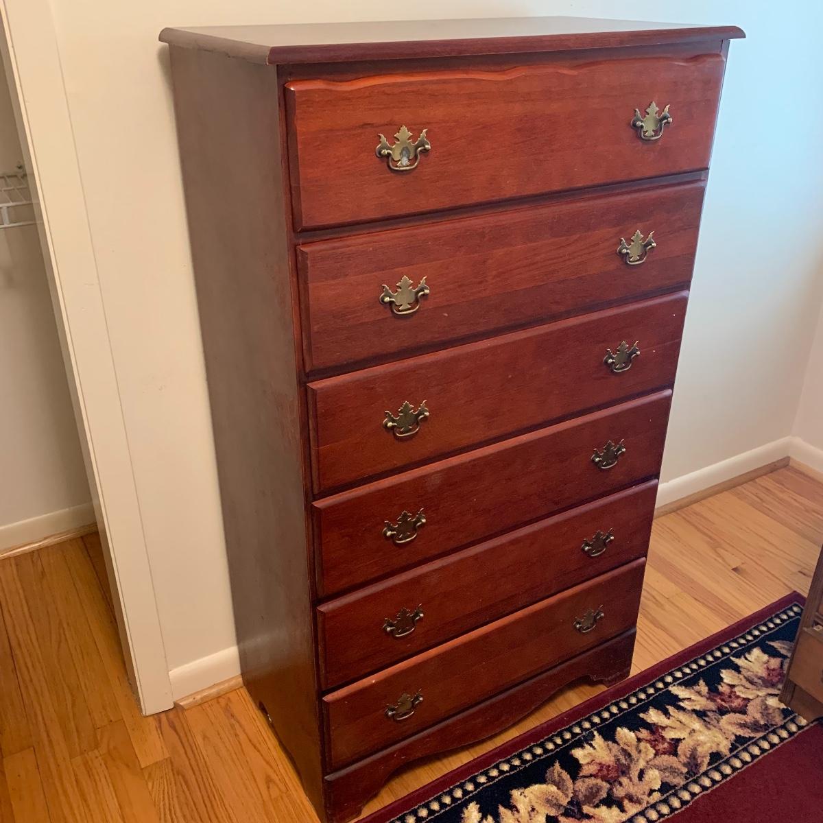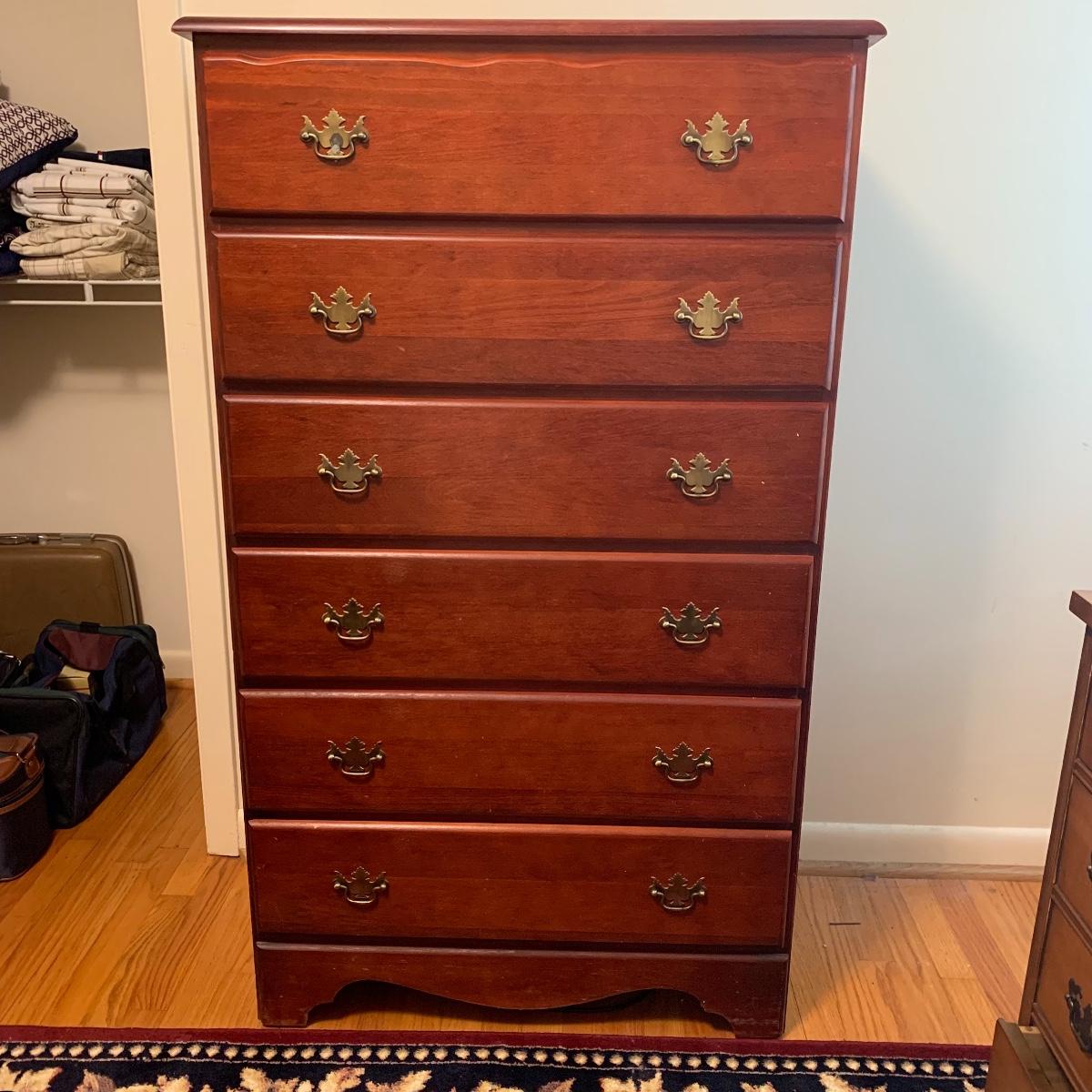 This wooden chest of drawers has six big dovetailed drawers to hold a variety of clothing. The top drawer has a decorative scalloped edge. Each drawer has two metal handles. One of the handles on the top drawer has a rust stain. All drawers glide smoothly. The chest measures 31” x 17” x 52.5”. It shows some wear on the top surface and edges. No makers mark is visible. Local pickup only.