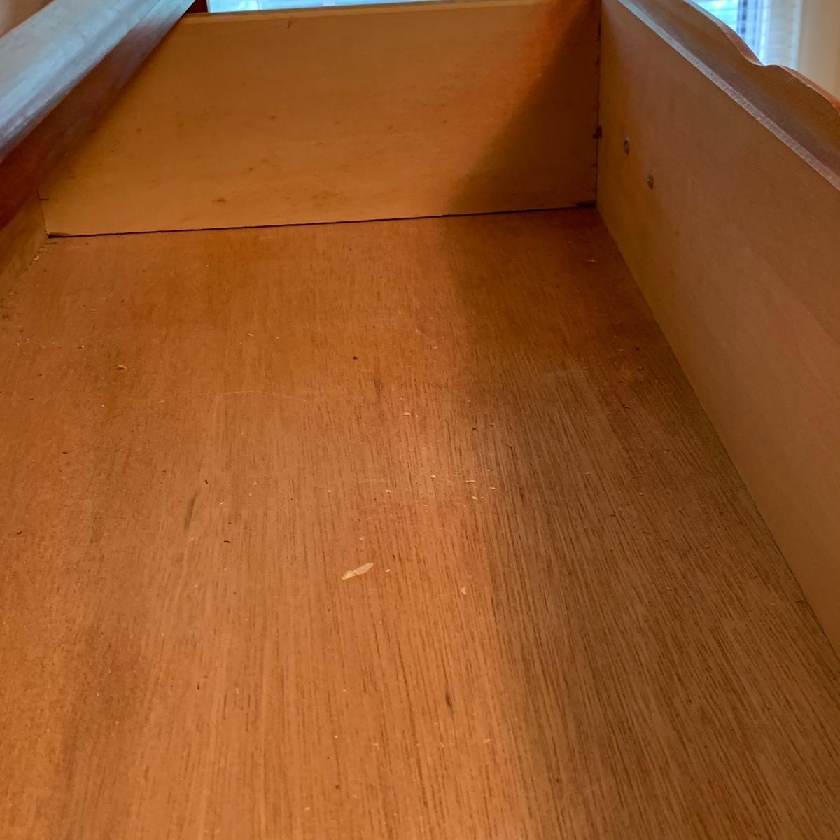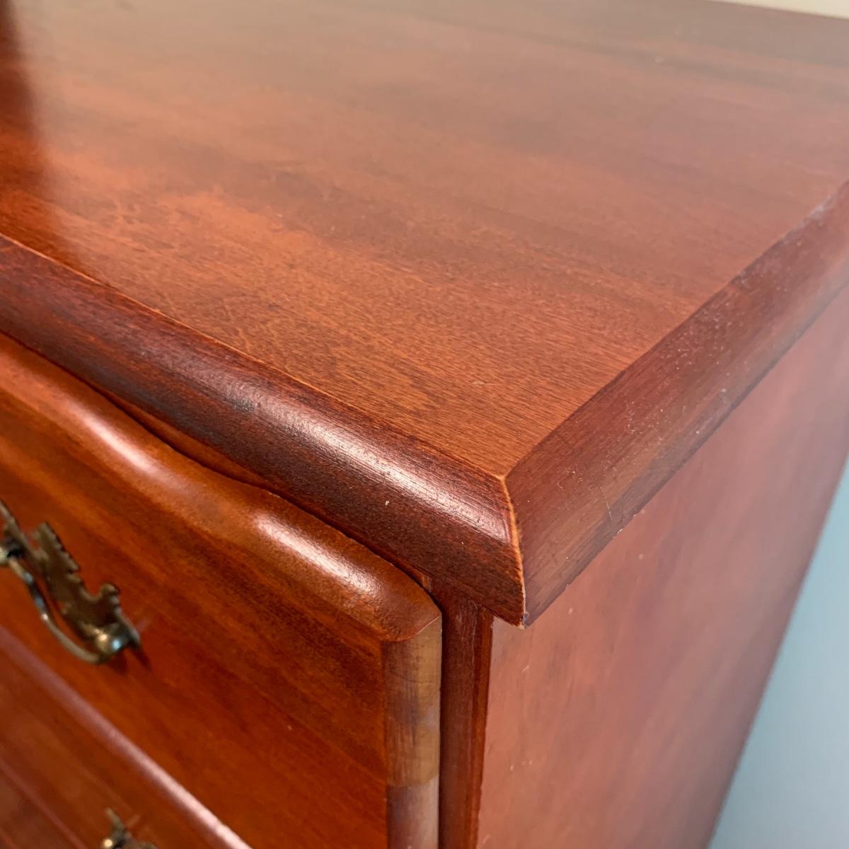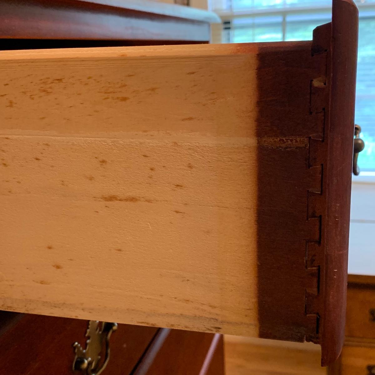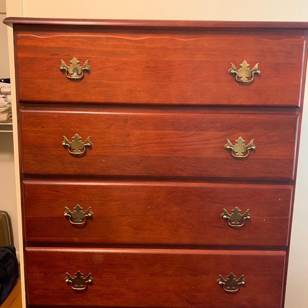 This wooden chest of drawers has six big dovetailed drawers to hold a variety of clothing. The top drawer has a decorative scalloped edge. Each drawer has two metal handles. One of the handles on the top drawer has a rust stain. All drawers glide smoothly. The chest measures 31” x 17” x 52.5”. It shows some wear on the top surface and edges. No makers mark is visible. Local pickup only.