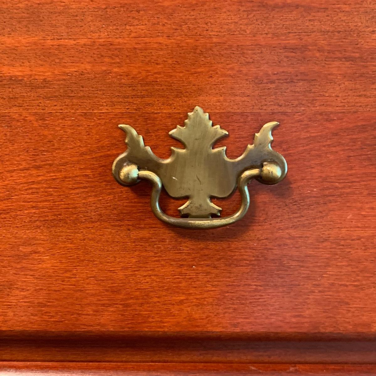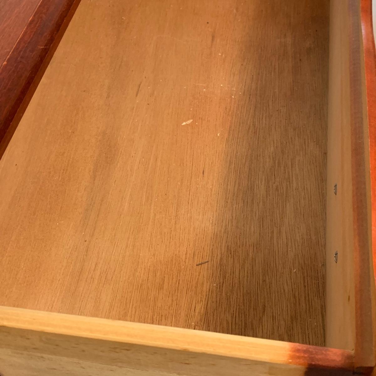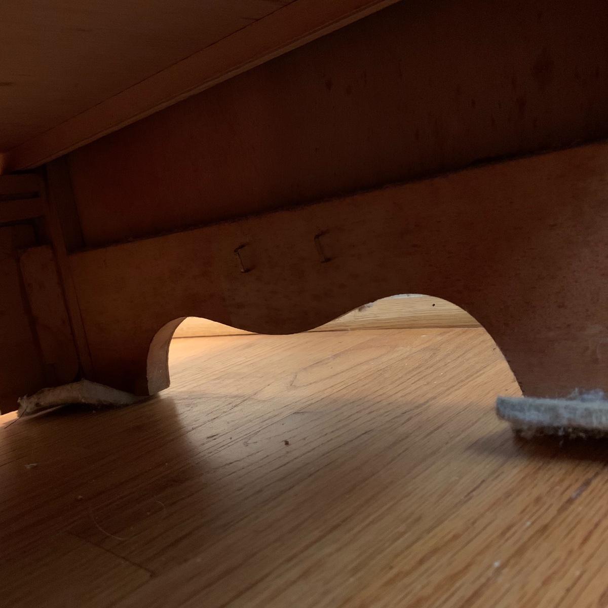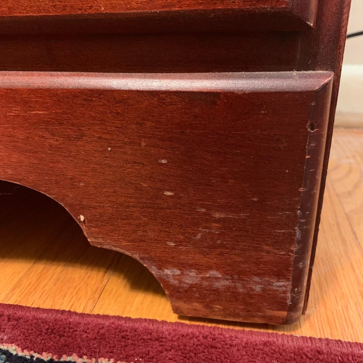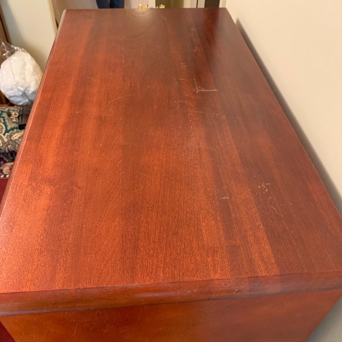 This wooden chest of drawers has six big dovetailed drawers to hold a variety of clothing. The top drawer has a decorative scalloped edge. Each drawer has two metal handles. One of the handles on the top drawer has a rust stain. All drawers glide smoothly. The chest measures 31” x 17” x 52.5”. It shows some wear on the top surface and edges. No makers mark is visible. Local pickup only.