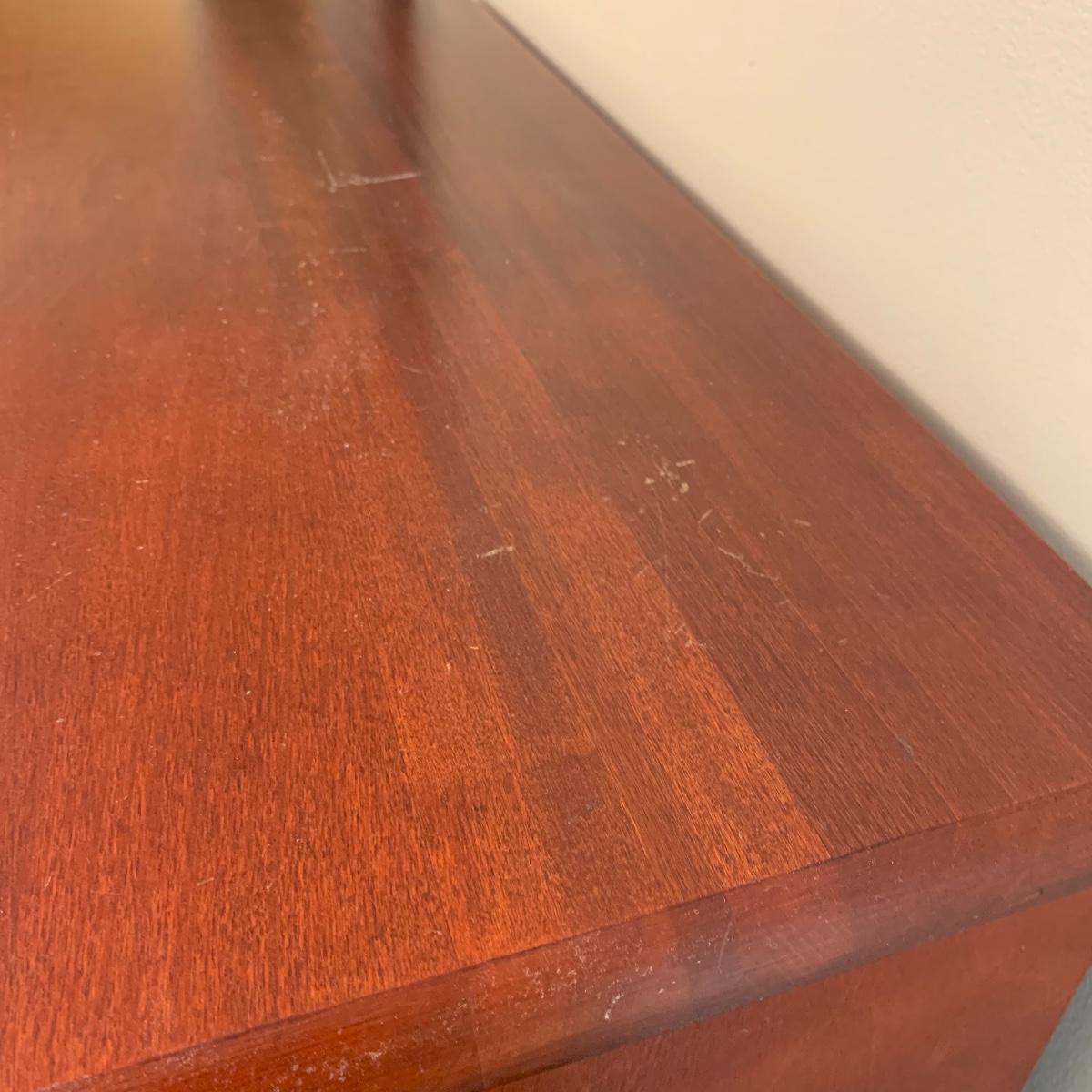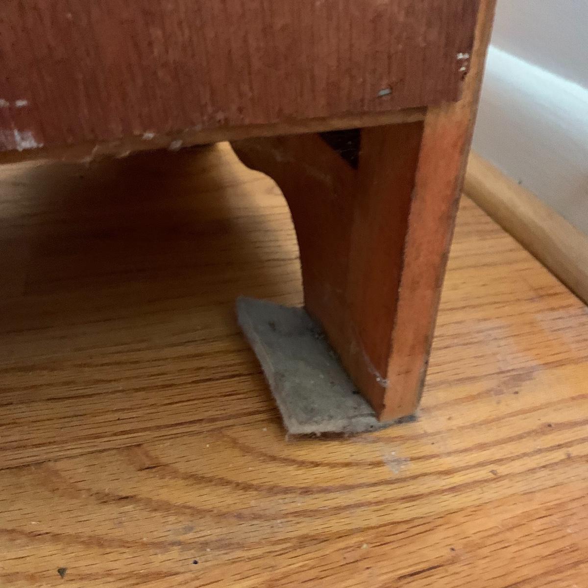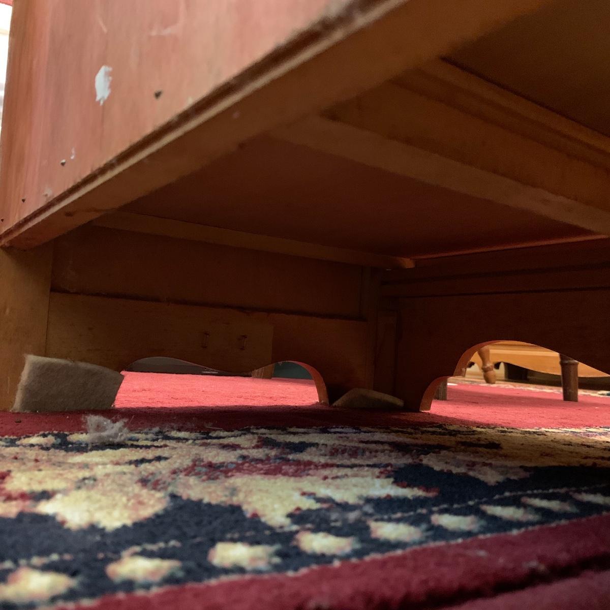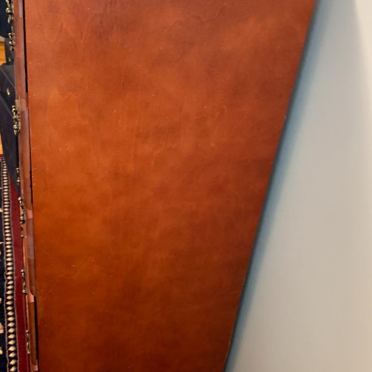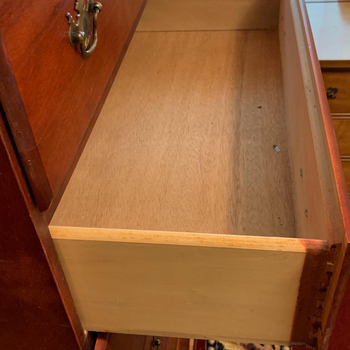 This wooden chest of drawers has six big dovetailed drawers to hold a variety of clothing. The top drawer has a decorative scalloped edge. Each drawer has two metal handles. One of the handles on the top drawer has a rust stain. All drawers glide smoothly. The chest measures 31” x 17” x 52.5”. It shows some wear on the top surface and edges. No makers mark is visible. Local pickup only.
