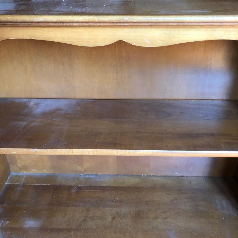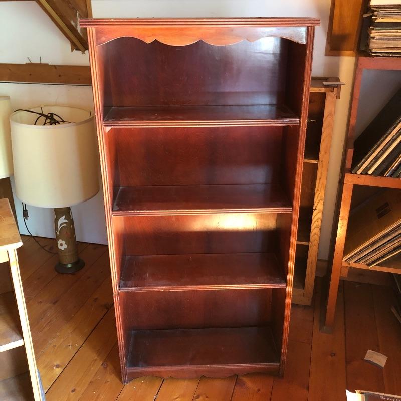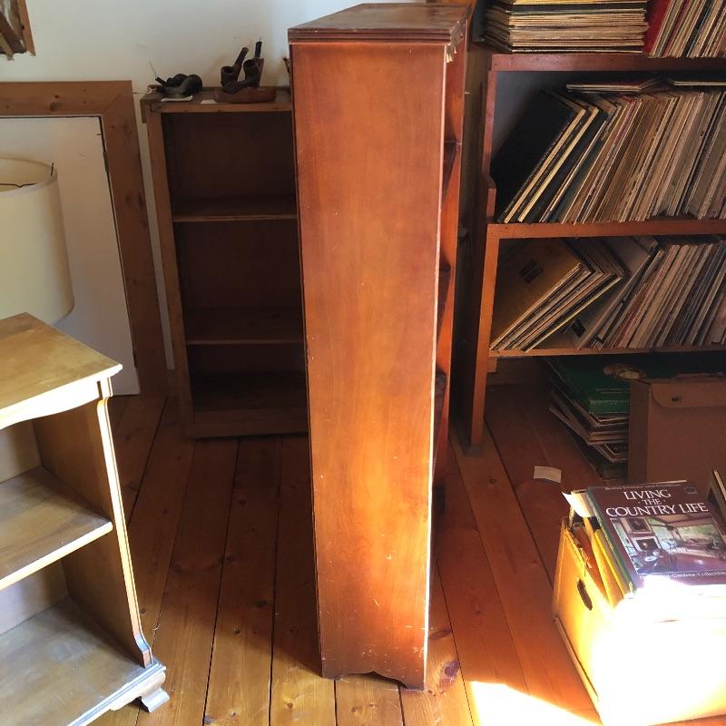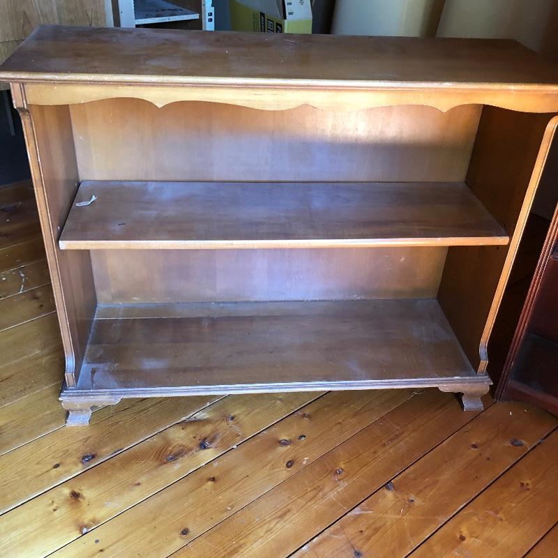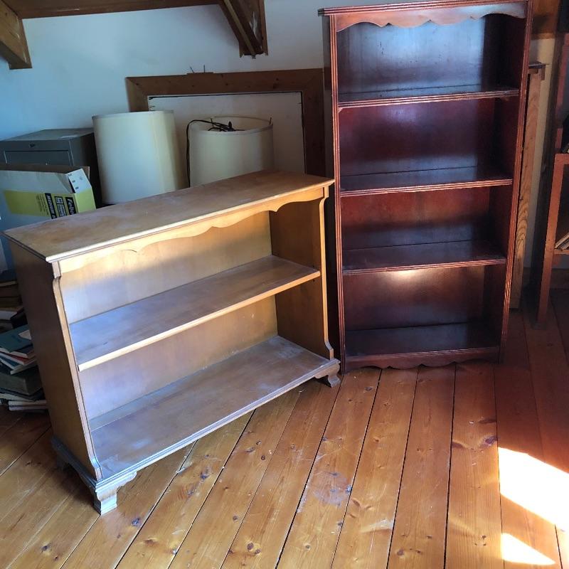 Add some valuable storage options to your home or office with these two sets of wooden shelves. The tallest measures 8.5” x 24” x 48” and is a reddish brown color with 4 shelves. The shorter unit is a lighter walnut colored wood with two shelves and measures 12” x 36” x 29”. Both units have some minor scuff marks that are shown in images.