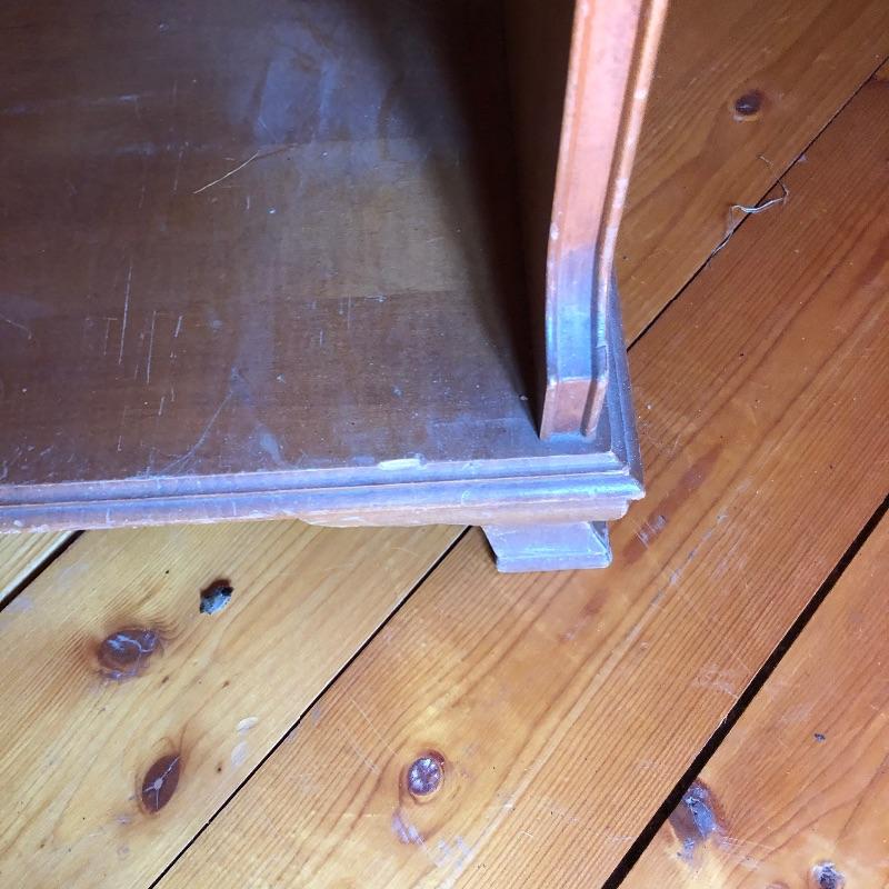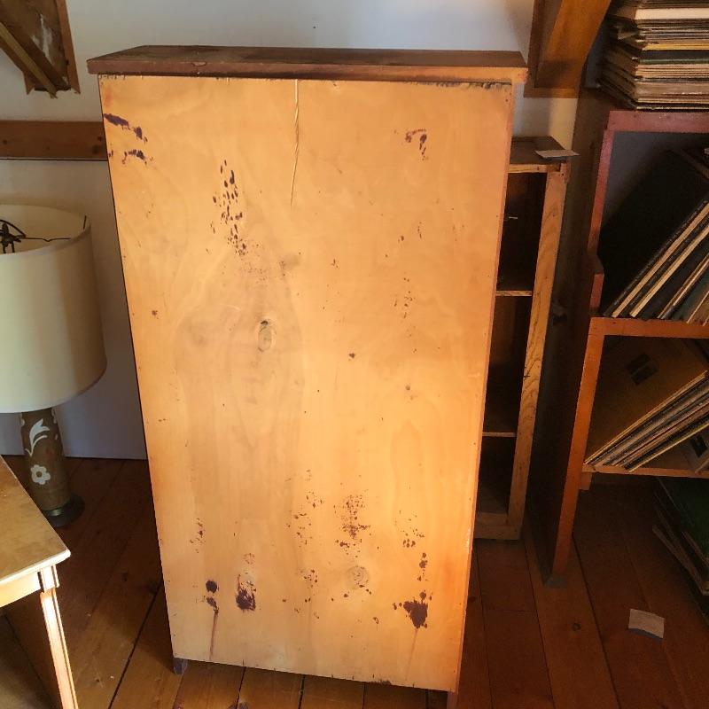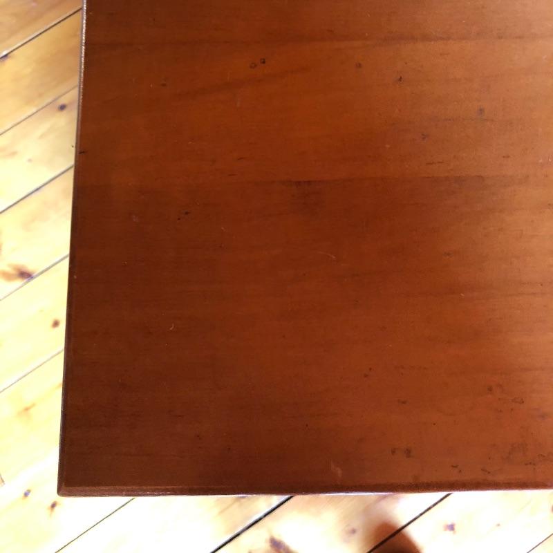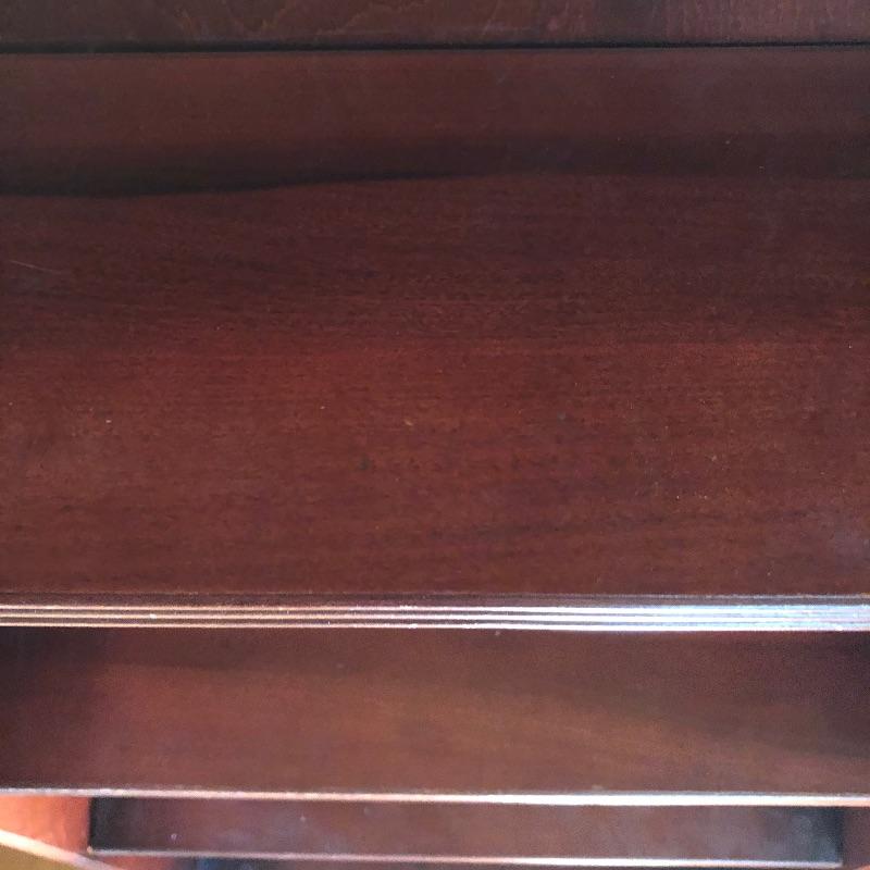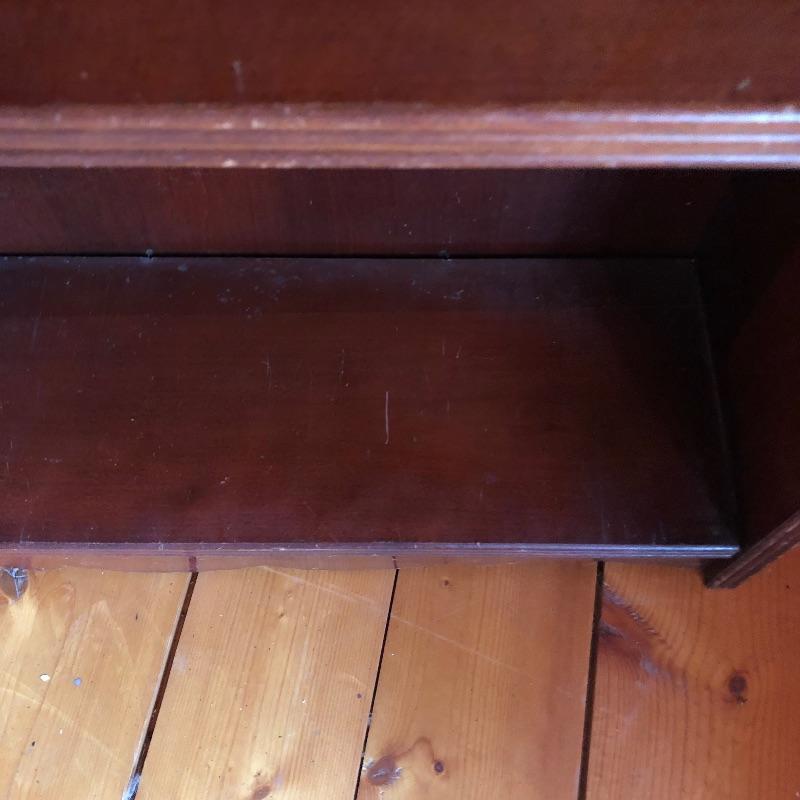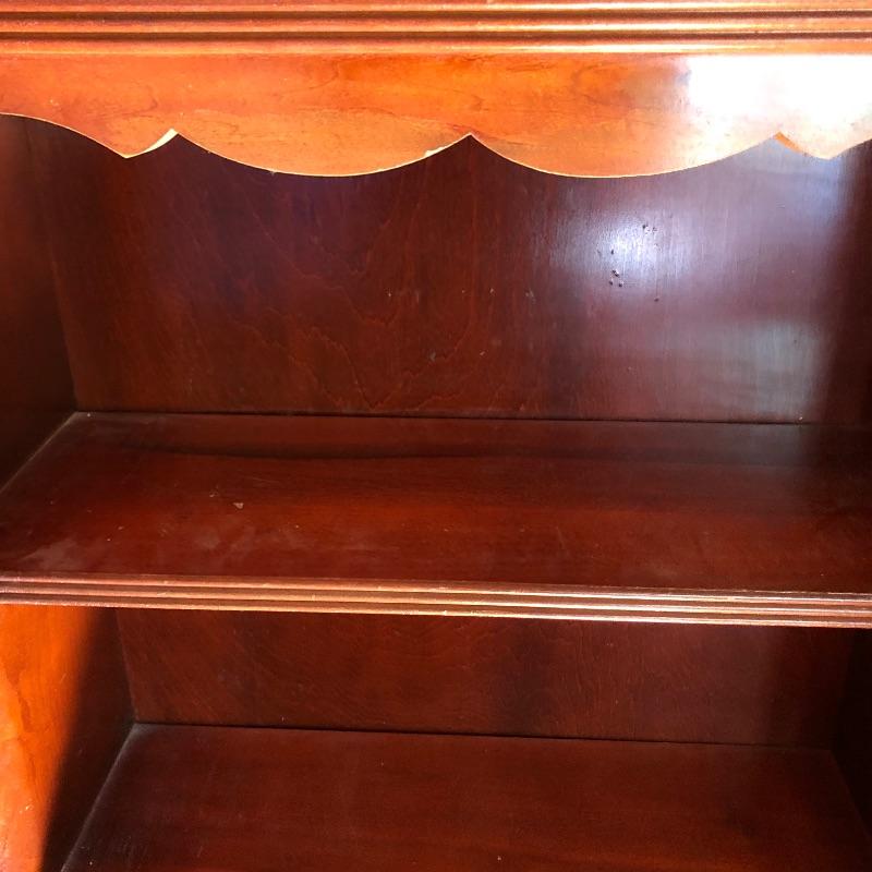 Add some valuable storage options to your home or office with these two sets of wooden shelves. The tallest measures 8.5” x 24” x 48” and is a reddish brown color with 4 shelves. The shorter unit is a lighter walnut colored wood with two shelves and measures 12” x 36” x 29”. Both units have some minor scuff marks that are shown in images.