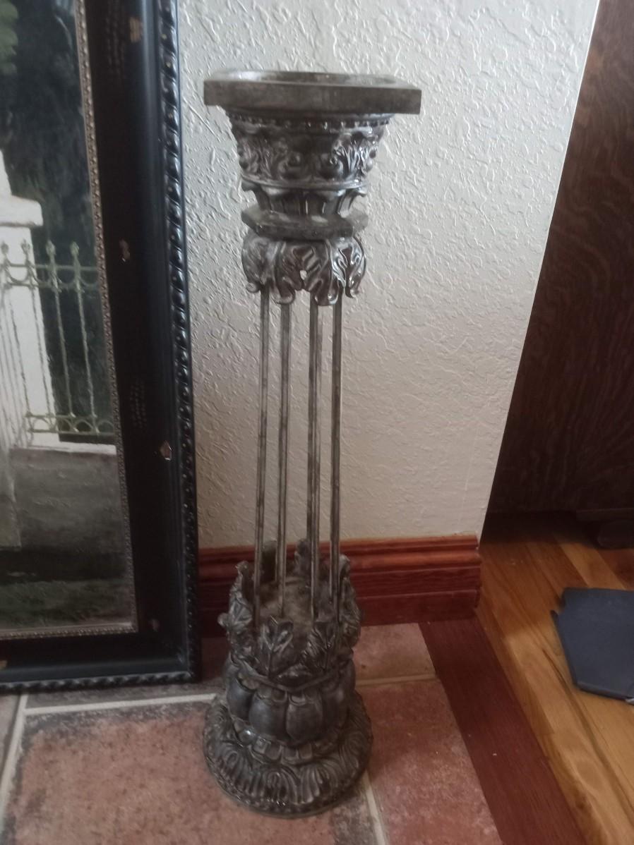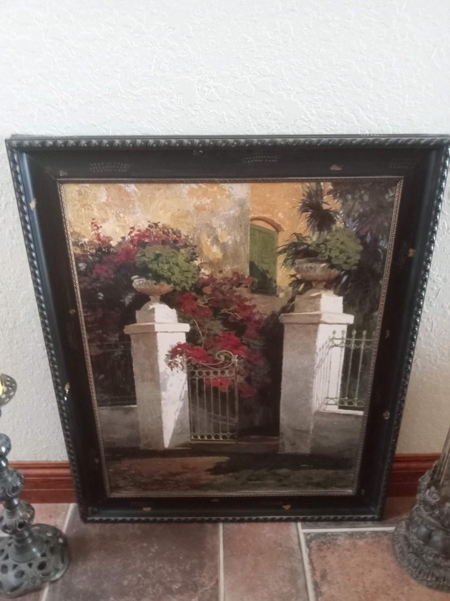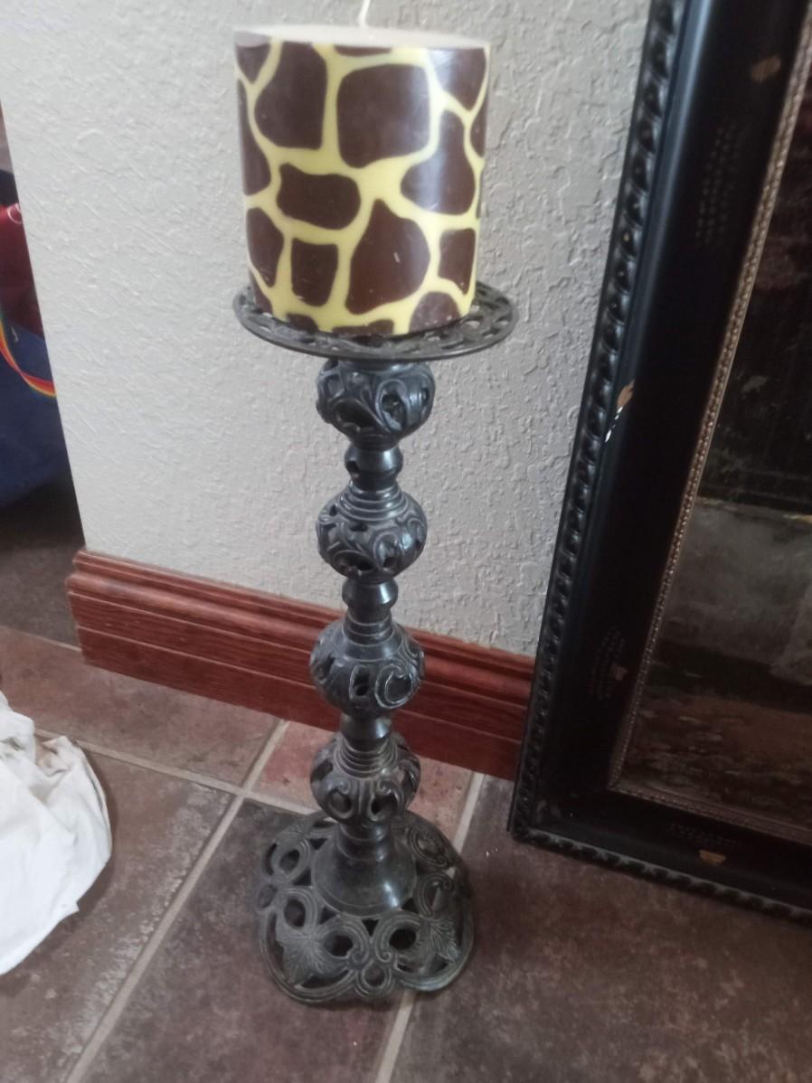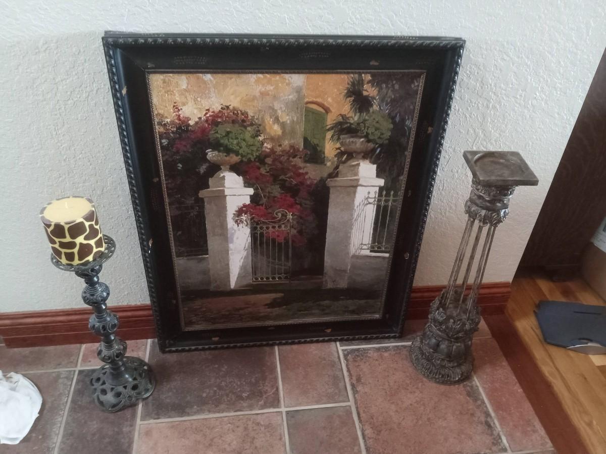 LOT 117 TWO TALL METAL CANDLE HOLDERS AND A LARGE PICTURE (HU)