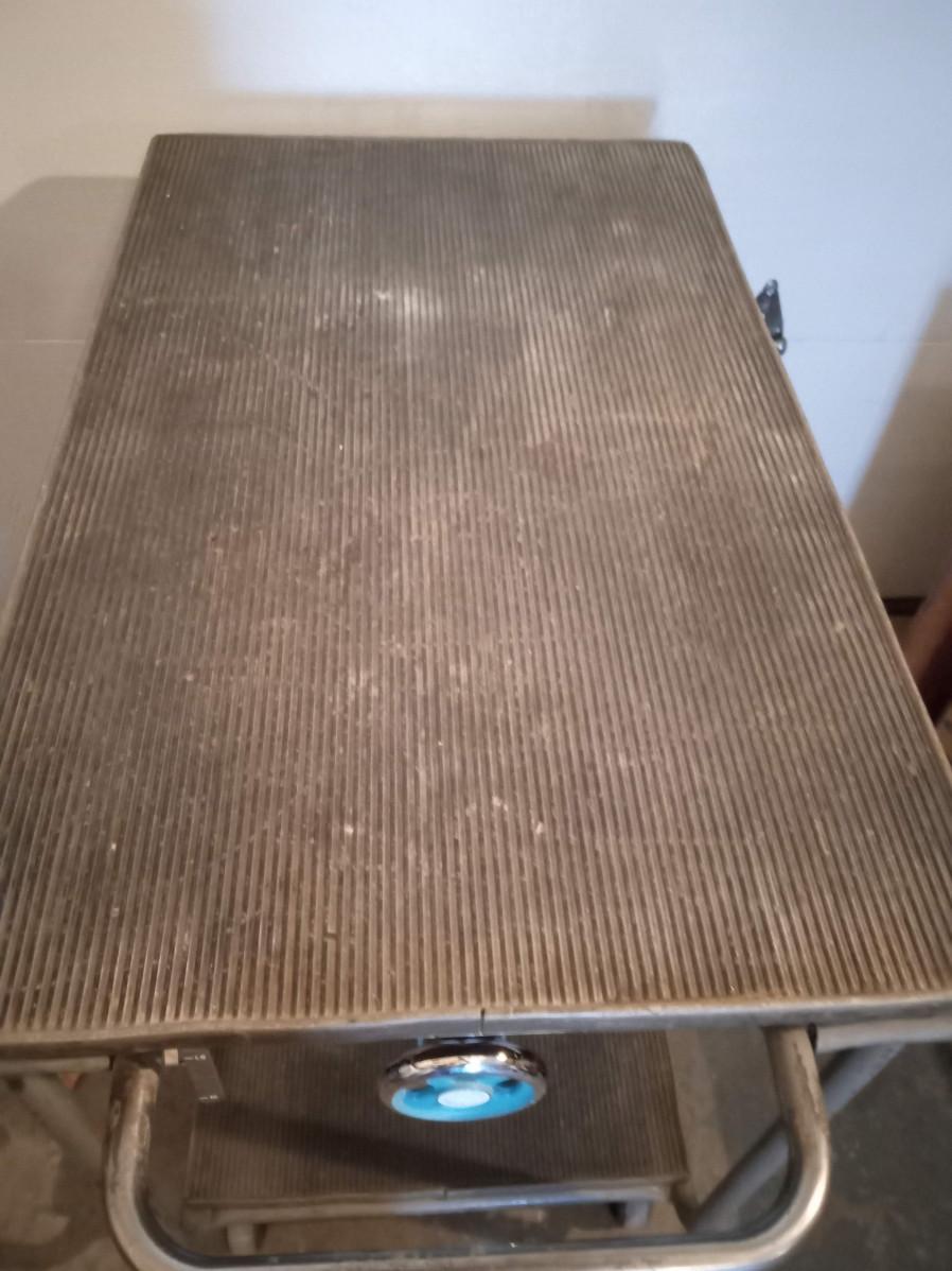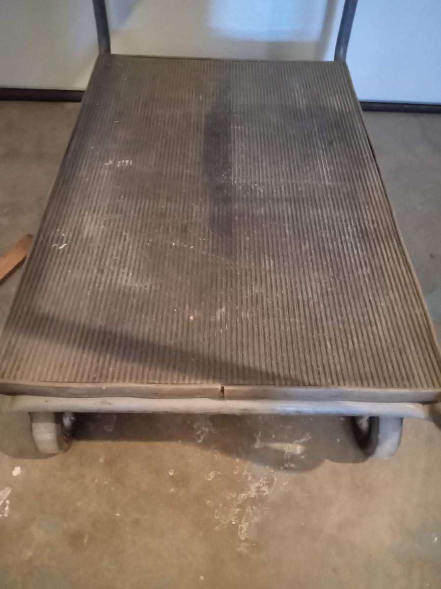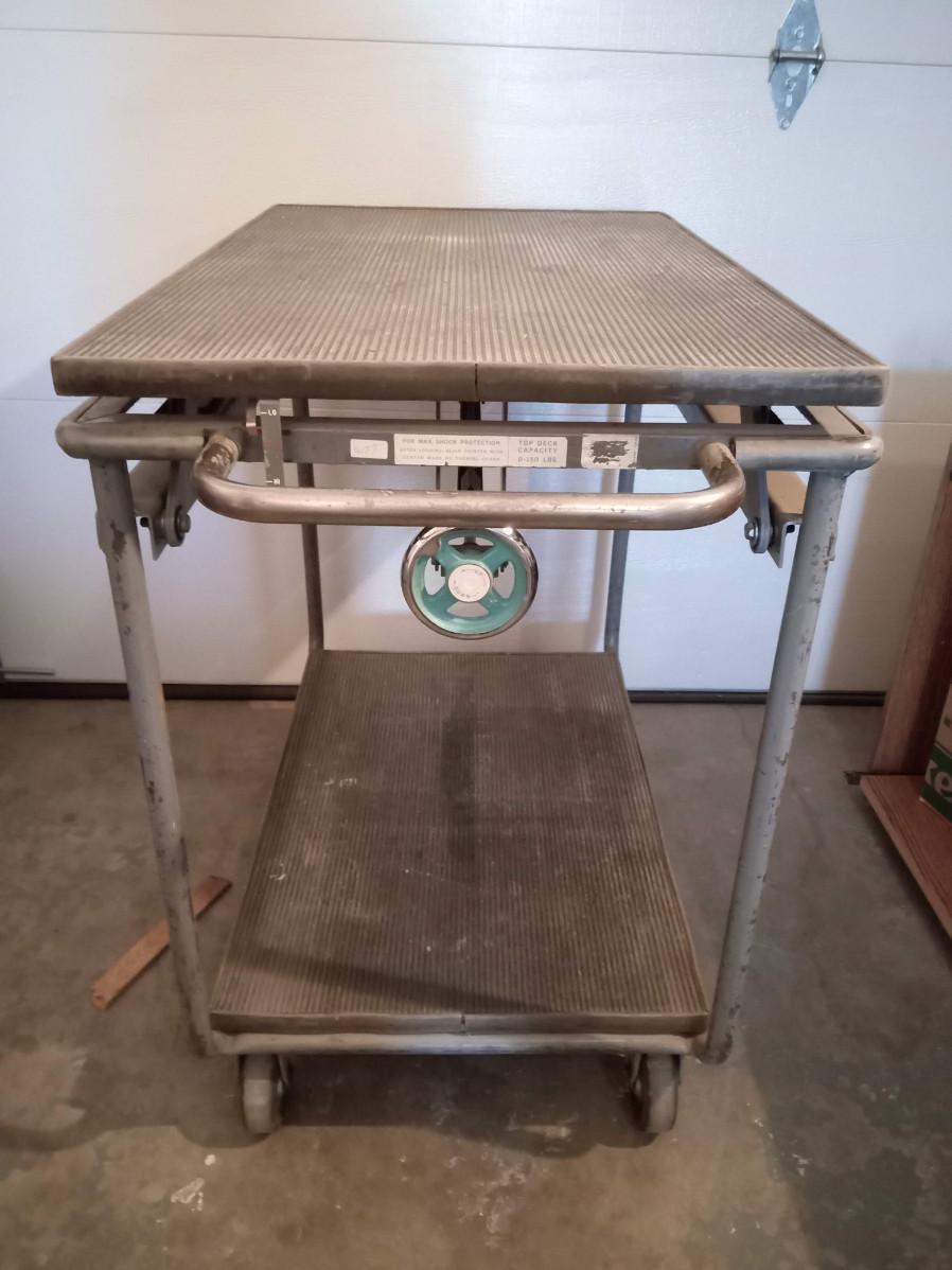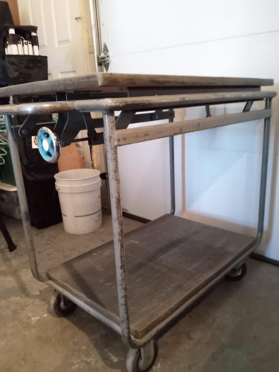 EACH TIER HAS A RIBBED RUBBER SURFACE, THE TOP CAN RAISE OR LOWER WITH A TURN OF A KNOB IT MEASURES 41" X 23" X 36"