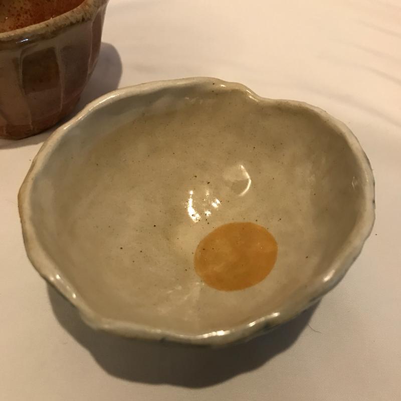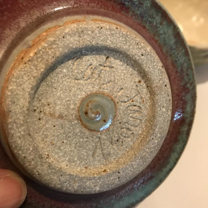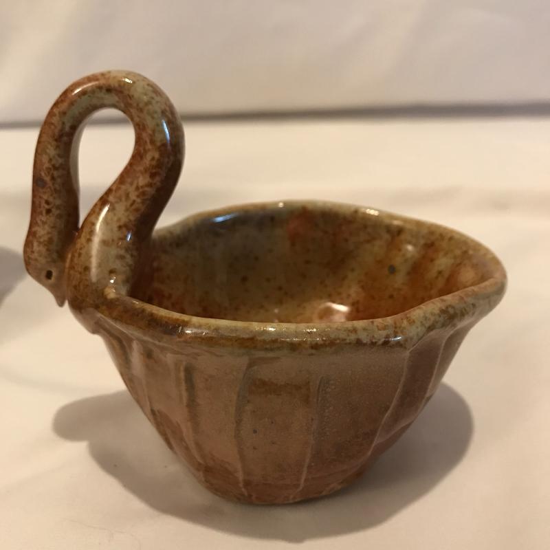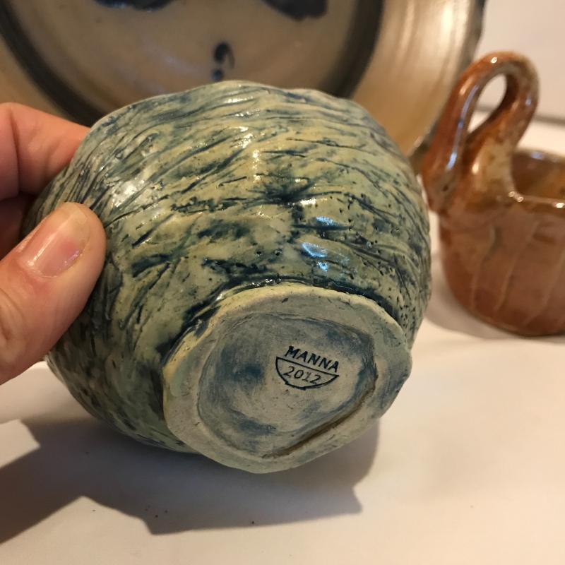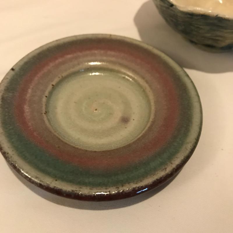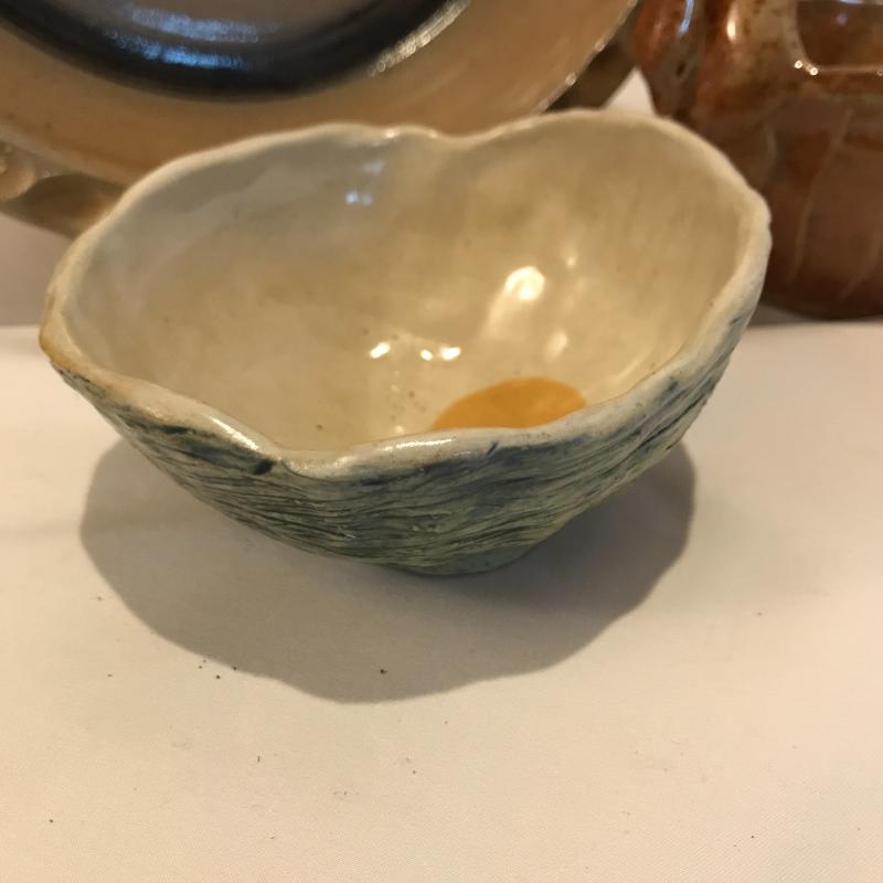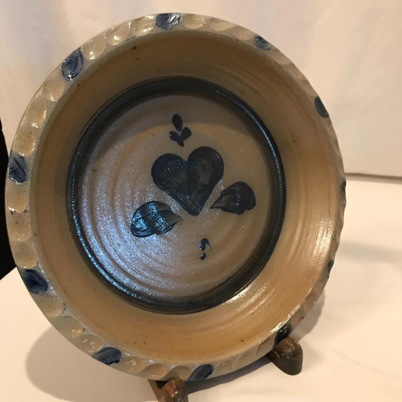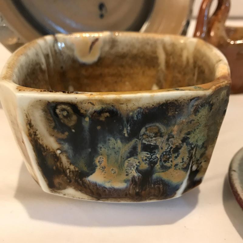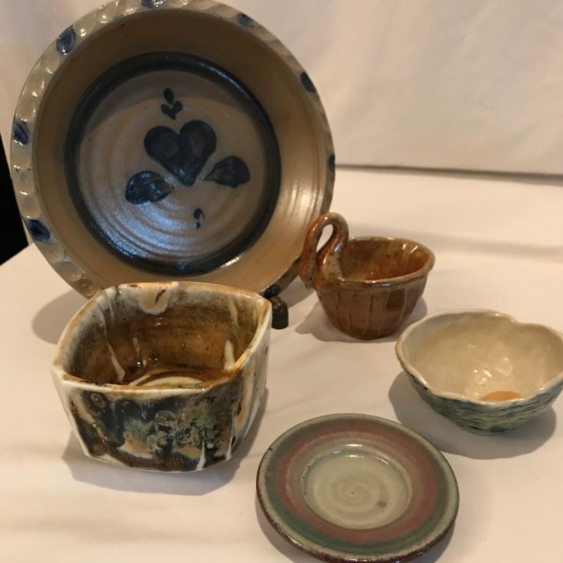 Pie plate by Rowe Pottery Works. Also includes colorful glazed square bowl (4.5”sq), small plate and fun egg and swan bowls. Shipping is available or local pick up in Asheville.
