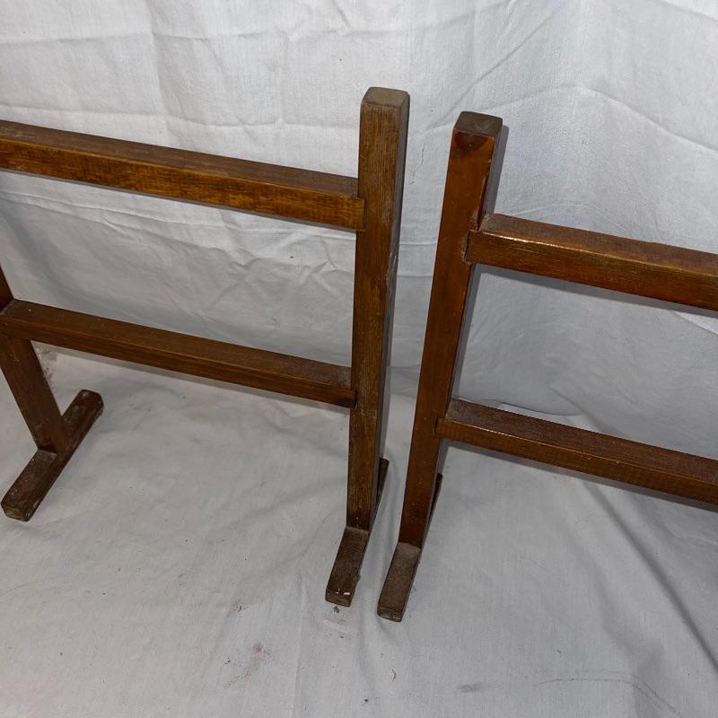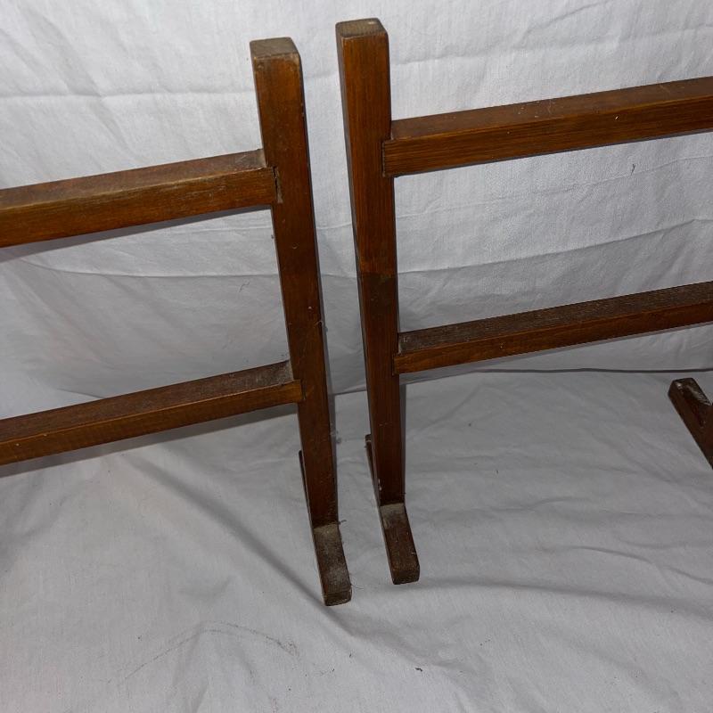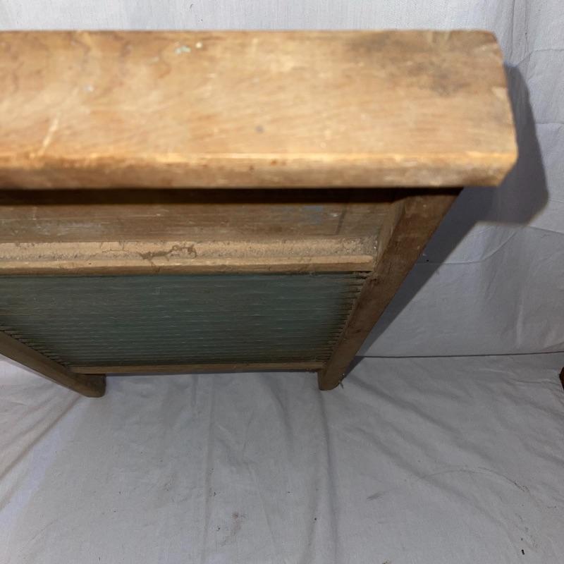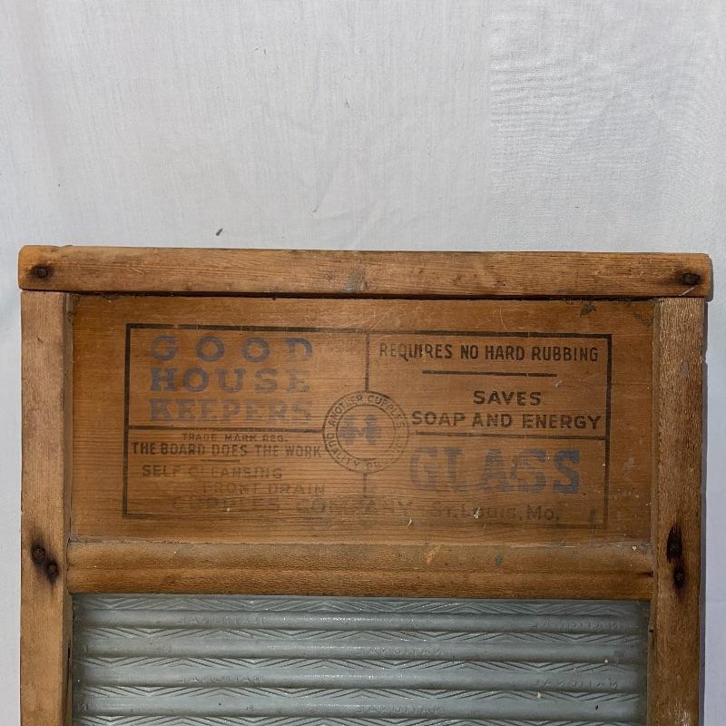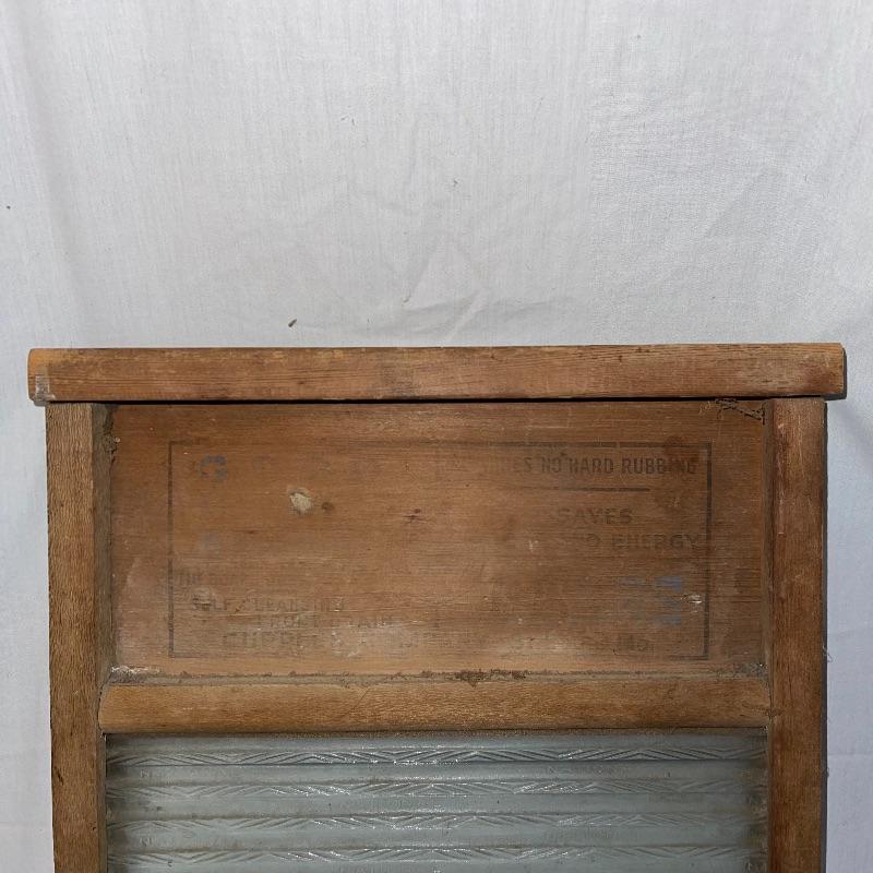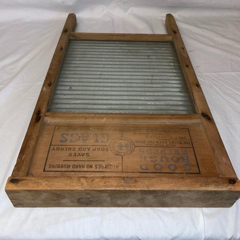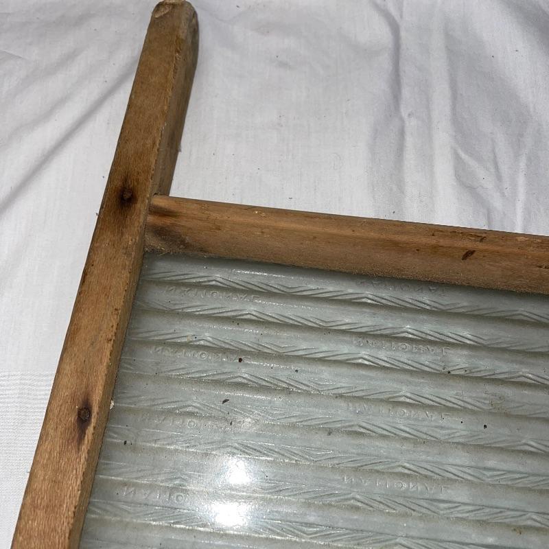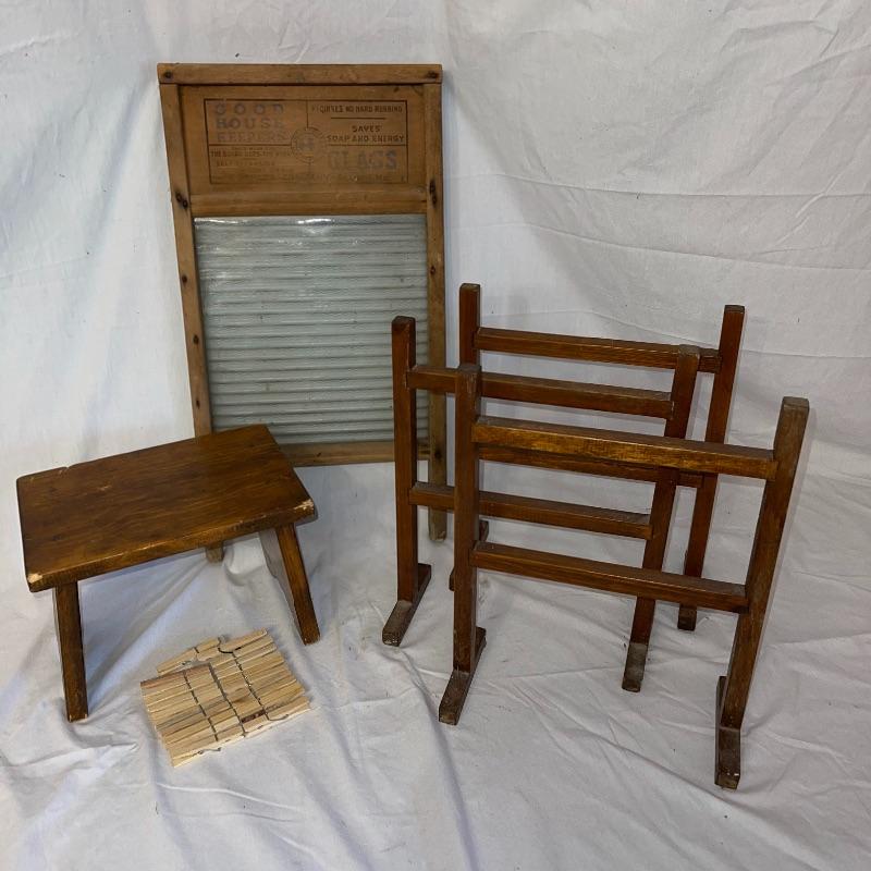 Vintage washboard, a tiny wooden stool, three small racks, and clothes pins. The washboard is glass and one side is grooved while the other has no grooves. Has “Good House Keepers”, “Requires no hard rubbing”, “Saves soap and energy”, “Trade mark reg”, “The board does the work”, “Self cleansing front drain”, and a few more various words on the top section. Washboard measures approx. 23.5x13.5