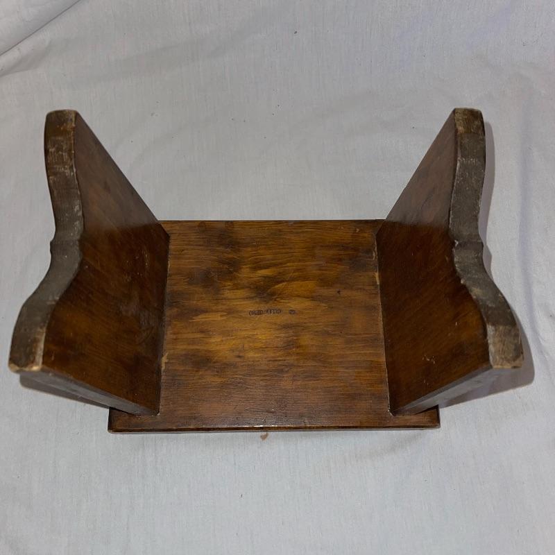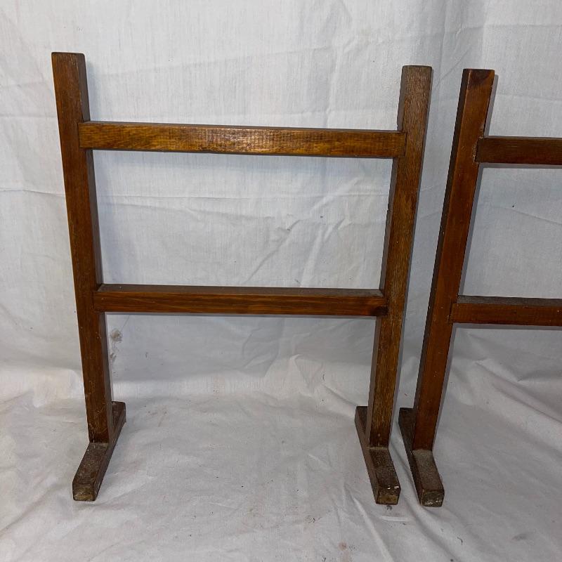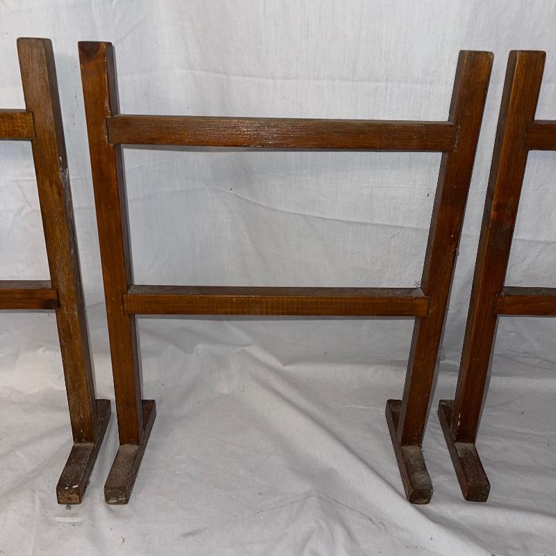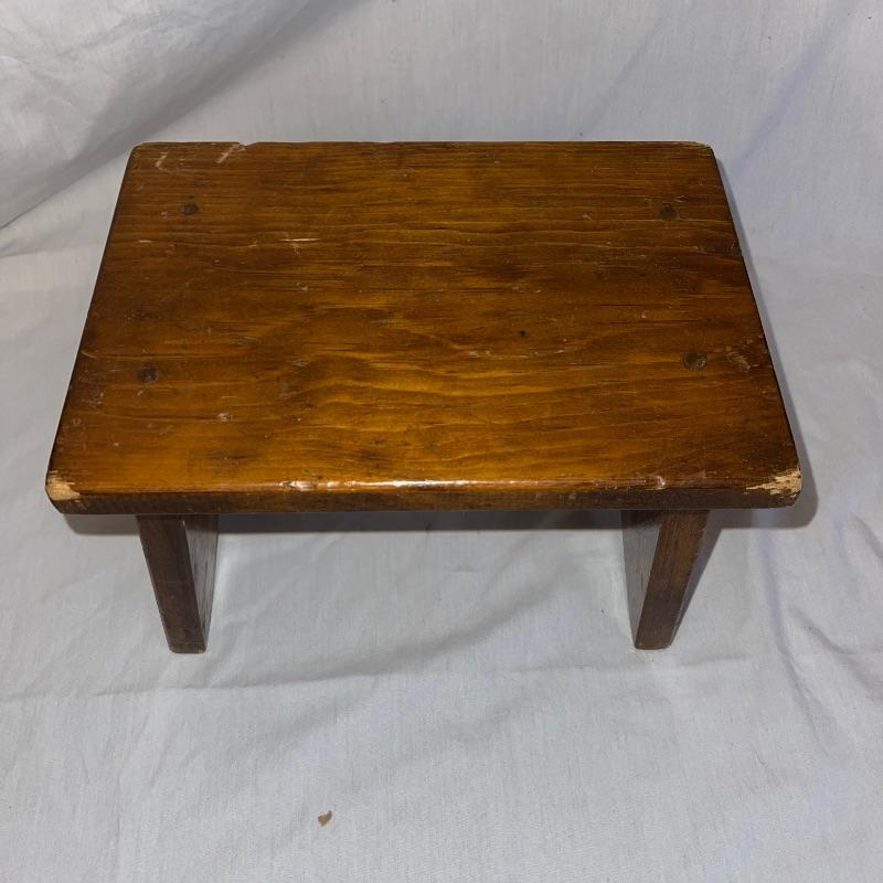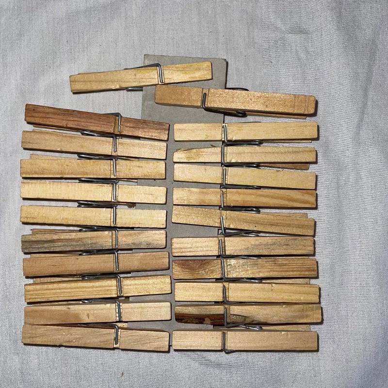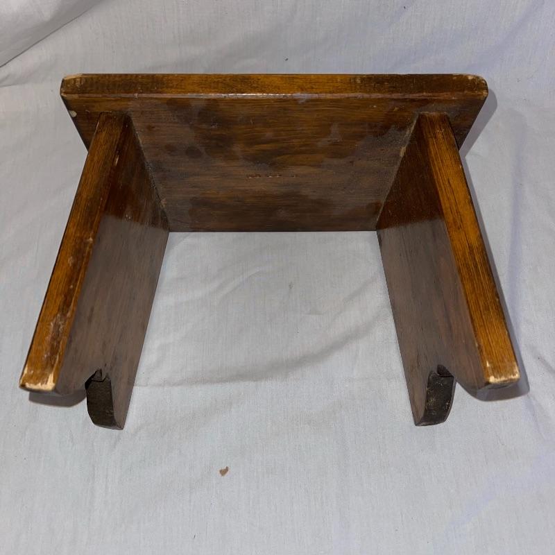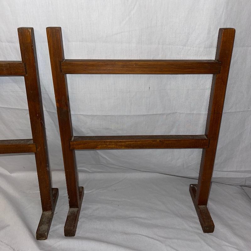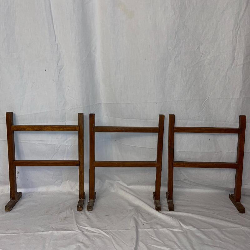 Vintage washboard, a tiny wooden stool, three small racks, and clothes pins. The washboard is glass and one side is grooved while the other has no grooves. Has “Good House Keepers”, “Requires no hard rubbing”, “Saves soap and energy”, “Trade mark reg”, “The board does the work”, “Self cleansing front drain”, and a few more various words on the top section. Washboard measures approx. 23.5x13.5
