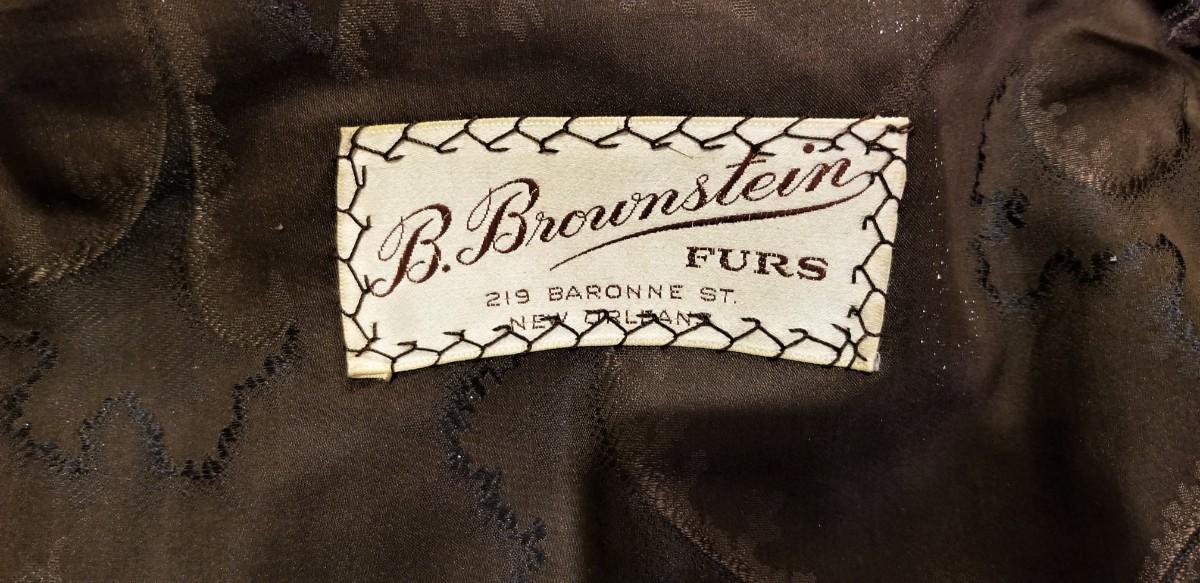 This vintage mink came from B. Brownstein Furs of New Orleans (ain't dere no more). Would fit up to a size 16 or so. Chocolate-colored pelts - clean - lining in good condition. Note: There is a rip along the seam line behind one of the arms. This is actually an easy repair (a needle and thread will do it), as the pelts are not affected. Rip about 5 inches long.