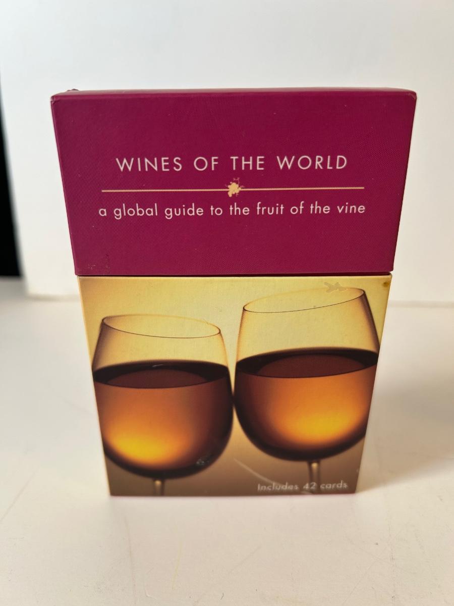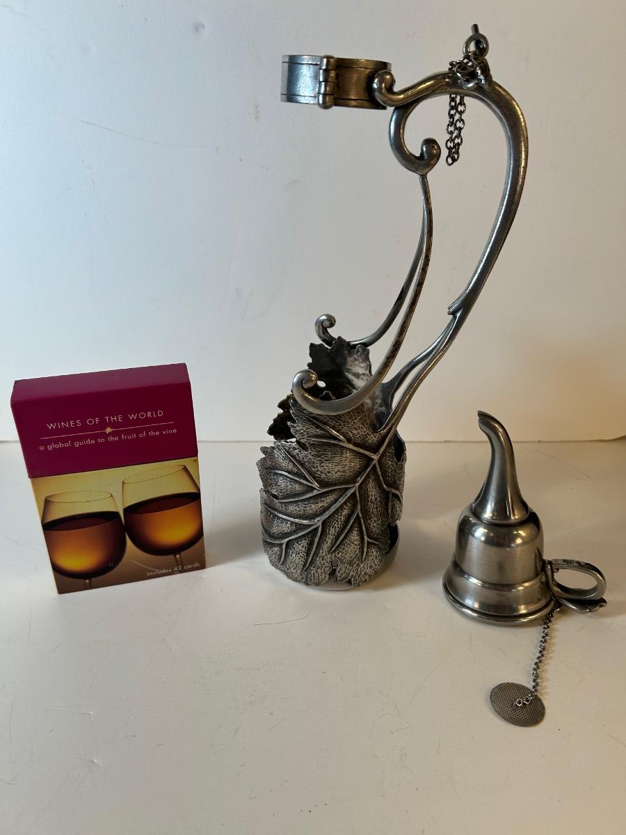 Leaf decorated wine bottle holder with aerator and a box of 42 "Wine of the World" cards