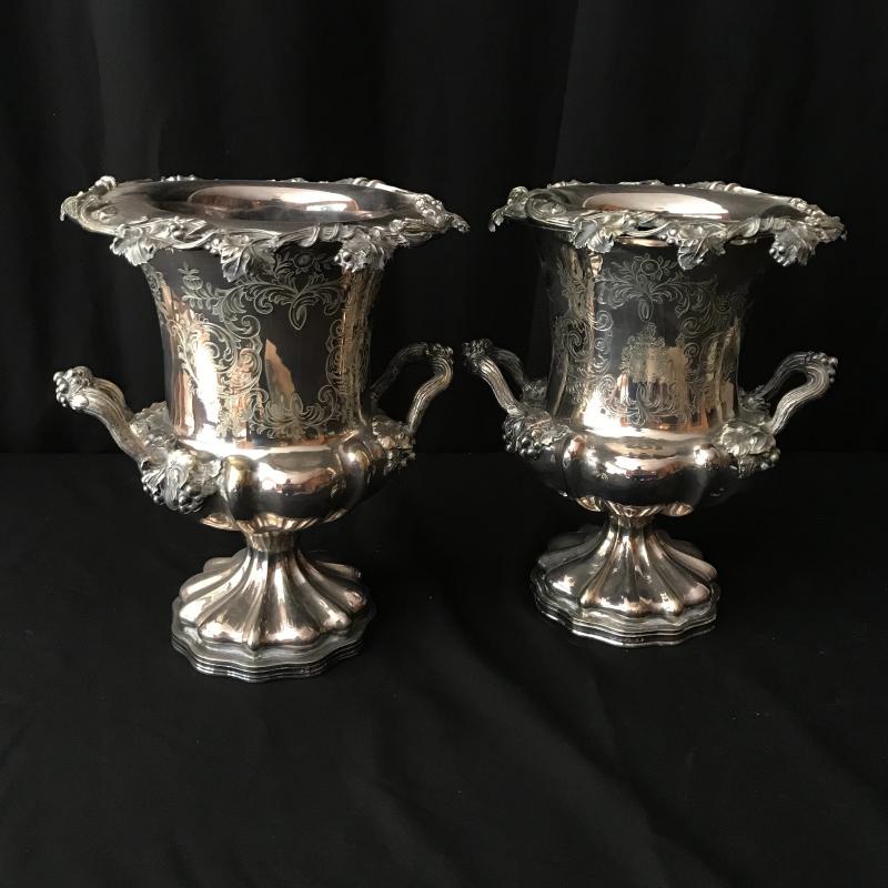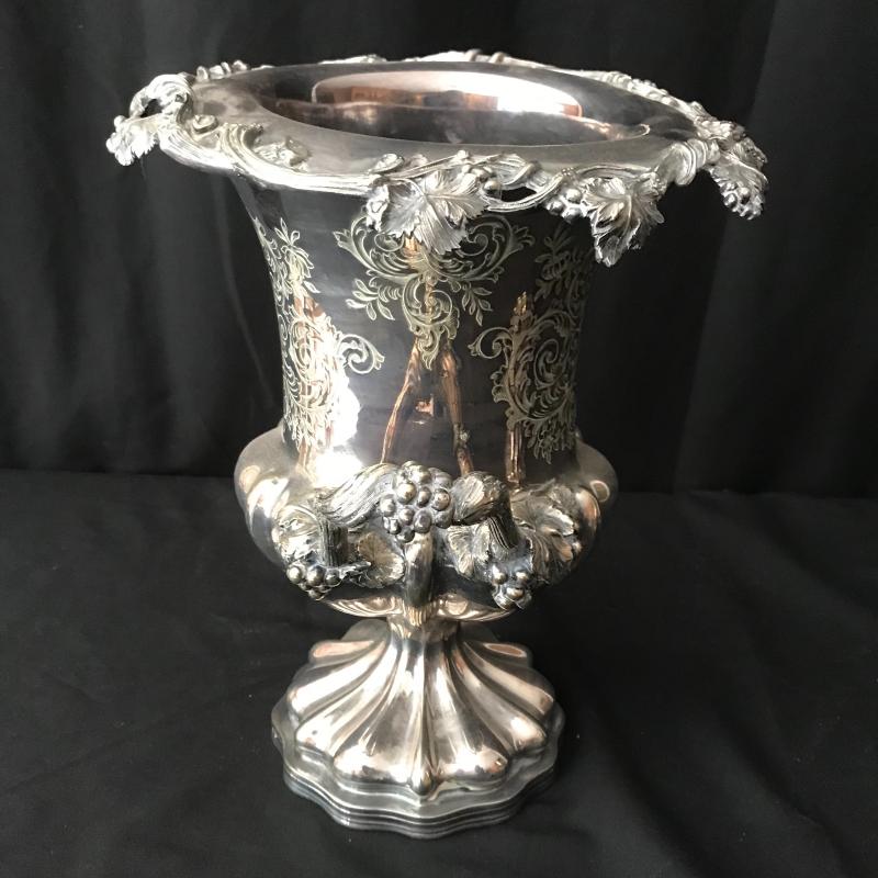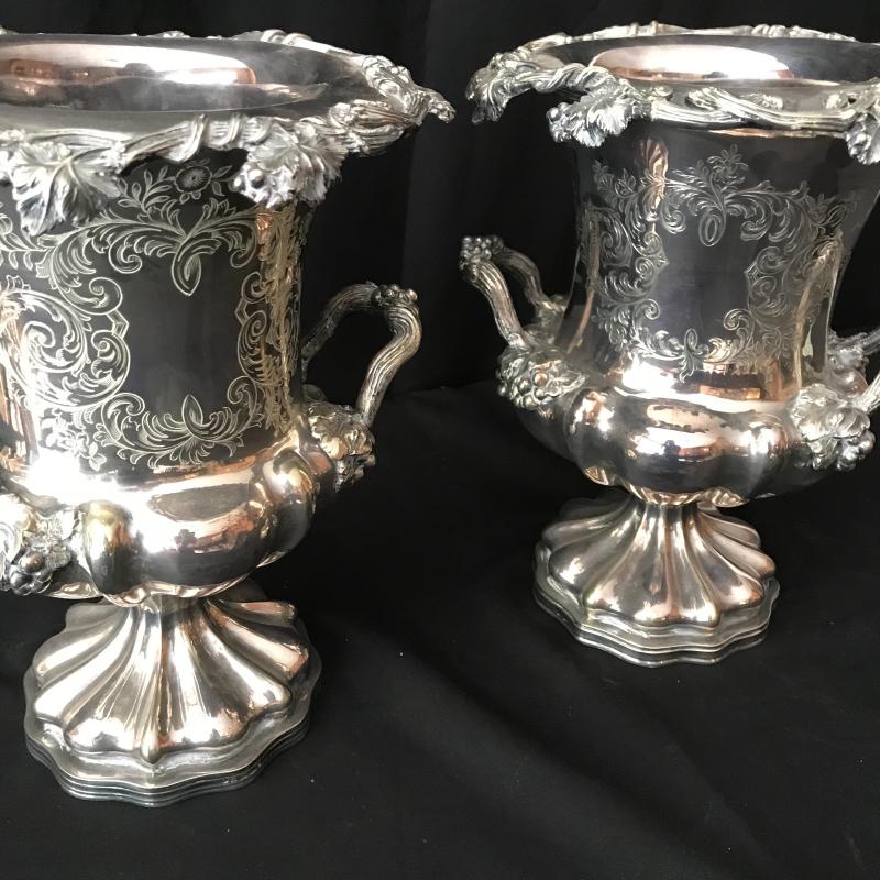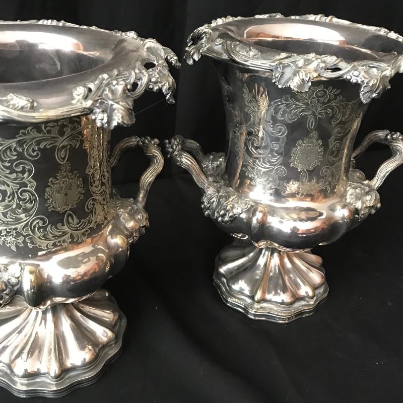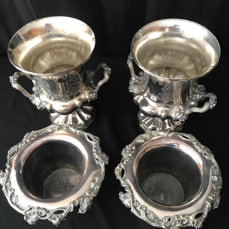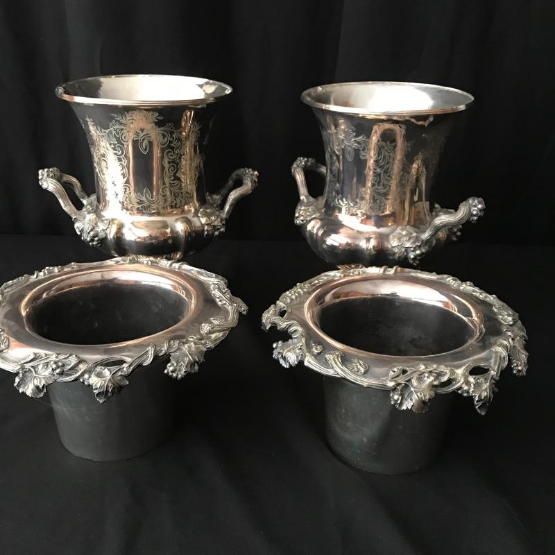 Add elegance to your next dinner with these matching silver plated wine/champagne chillers. Complete with removeable inserts to keep your bottles out of the ice water. Each chiller has a space to add a personal engraving. See photos. Measures approx. 10x12”. Shipping available.