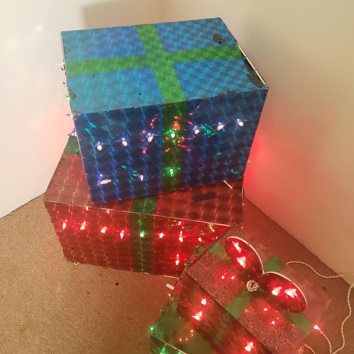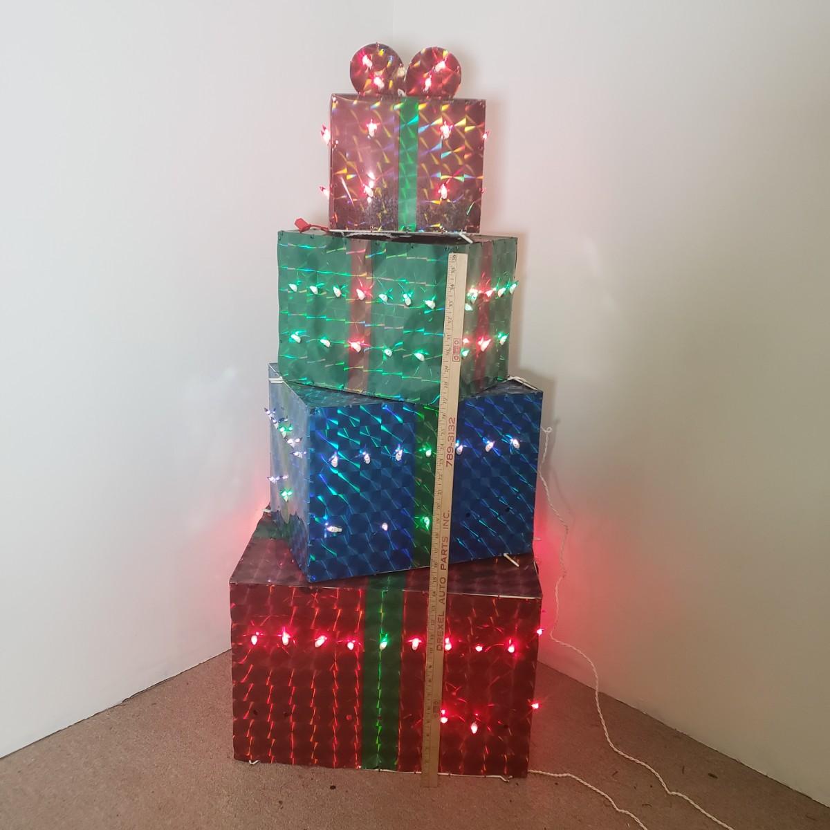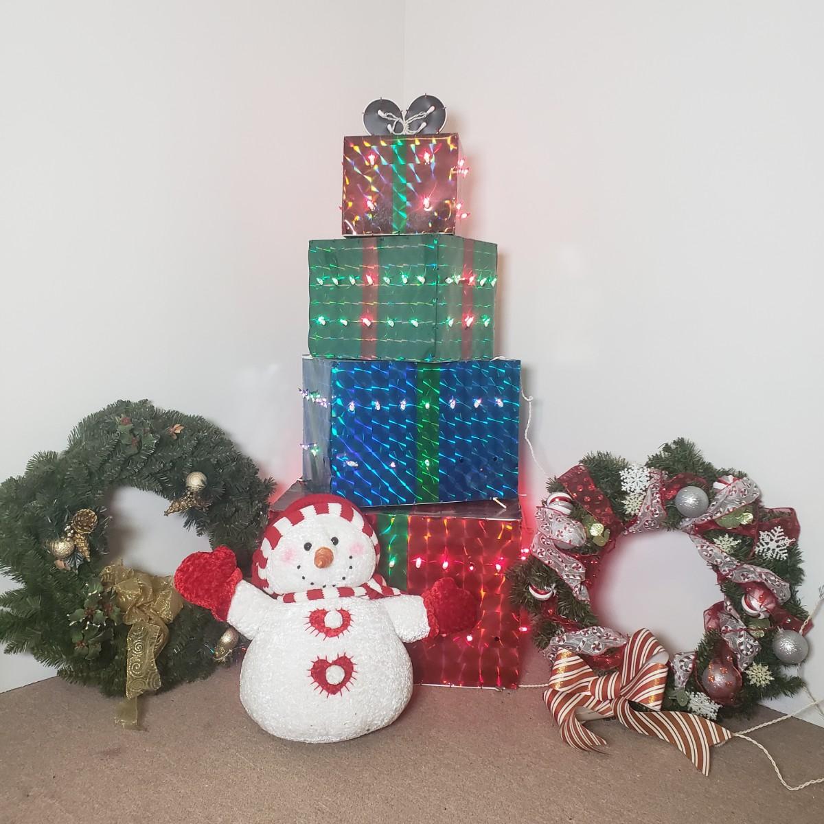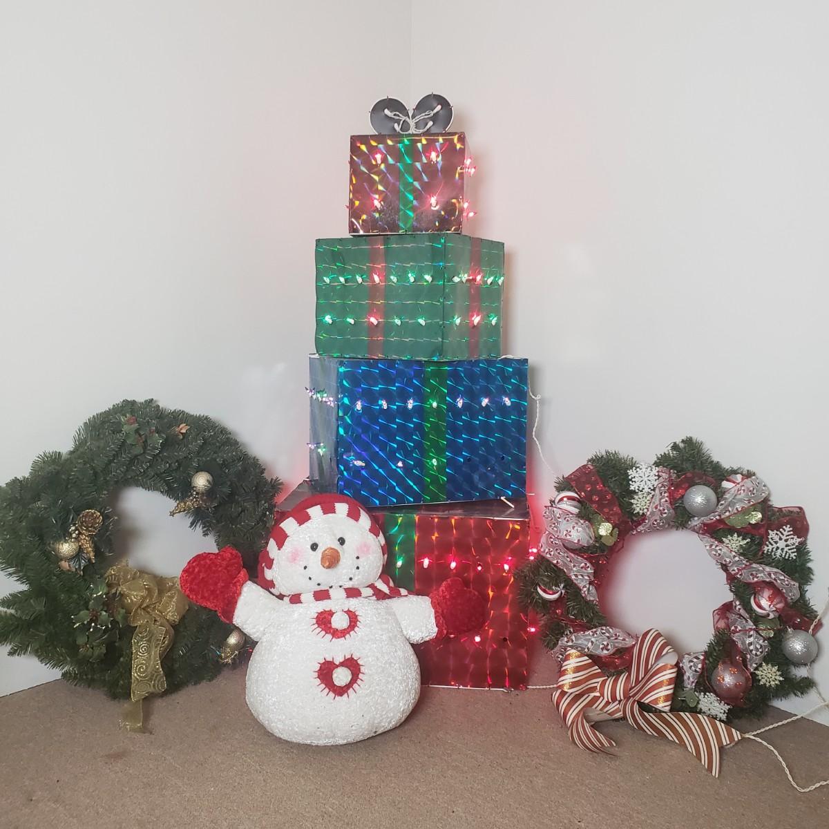 LOT 2B: Lighted Christmas Stack of Gifts with Two Wreaths & Large Plush Snowman