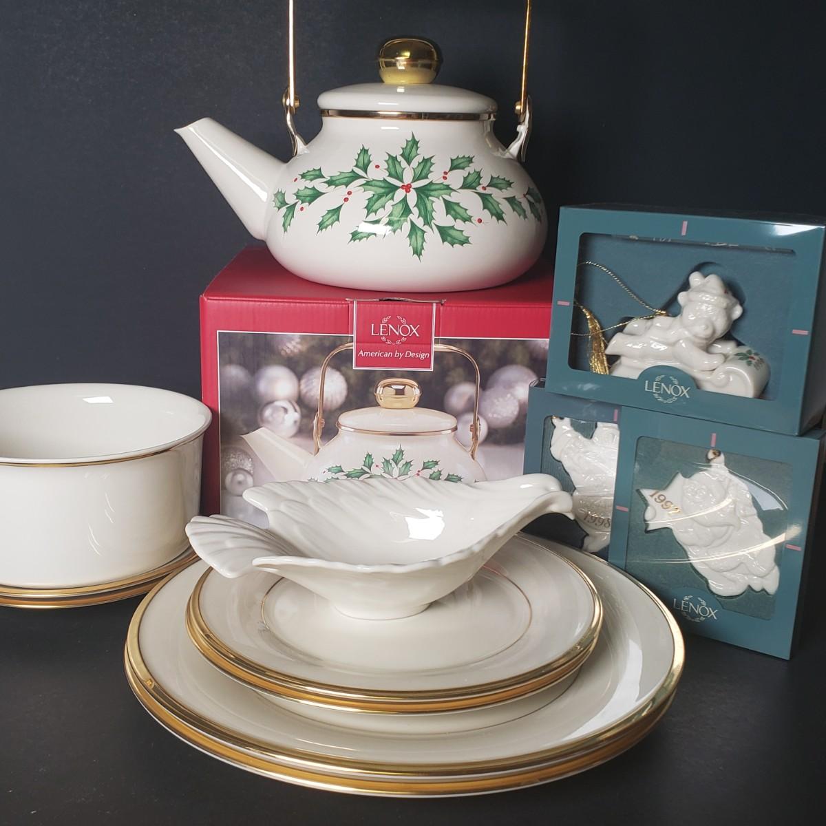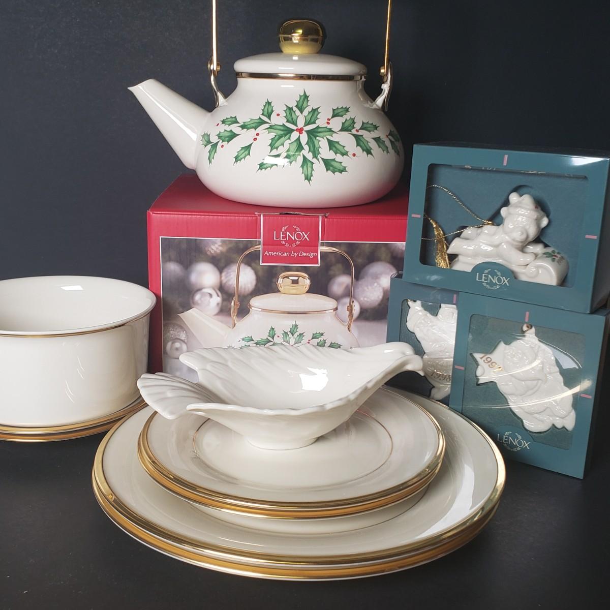 LOT 16B: Lenox Eternal Dishes, Ornaments & Enamel Teapot New in Box