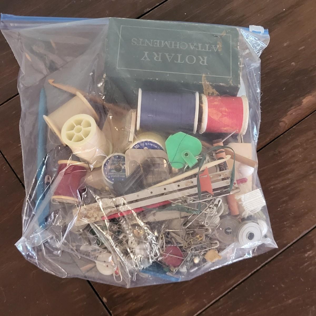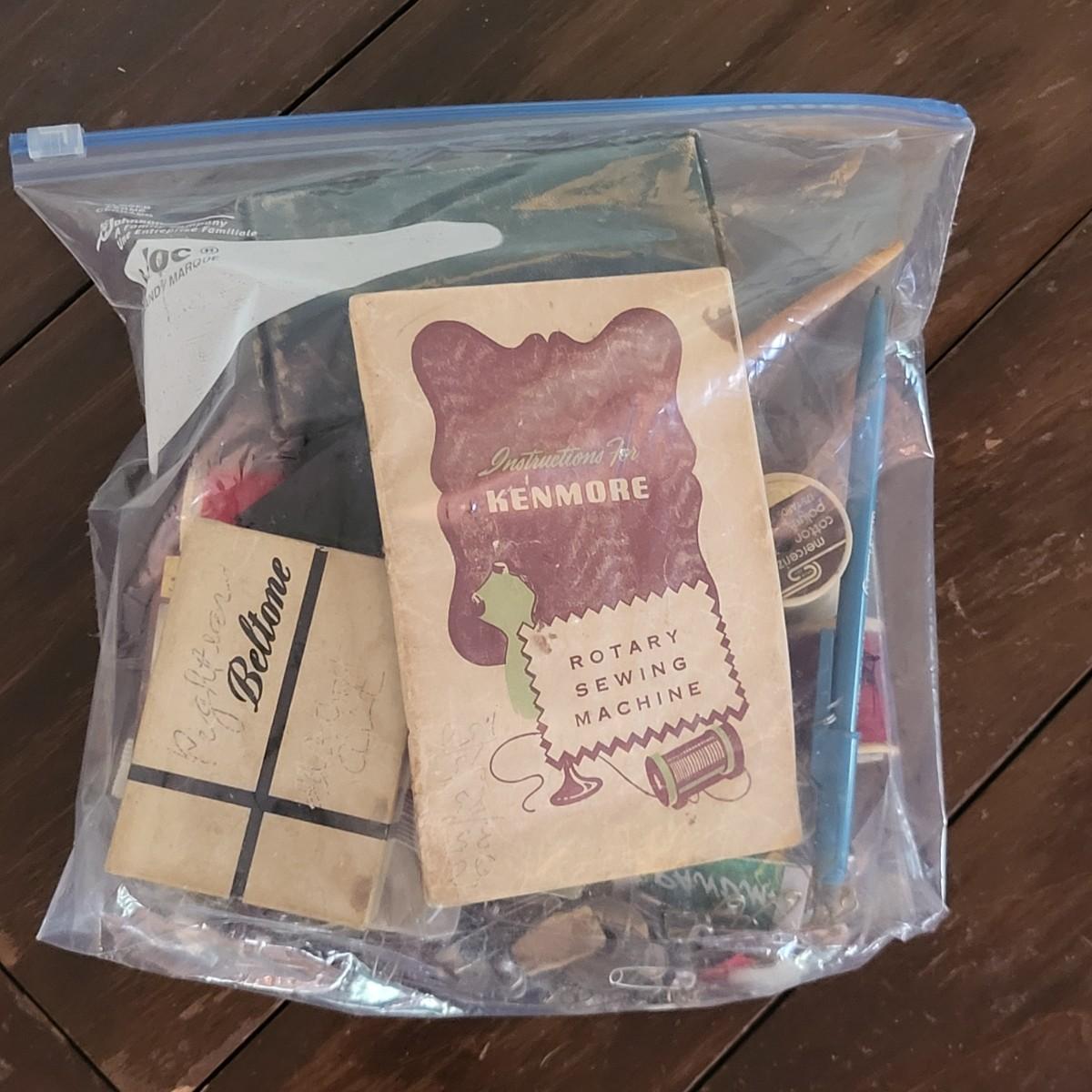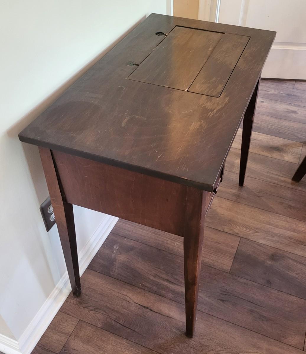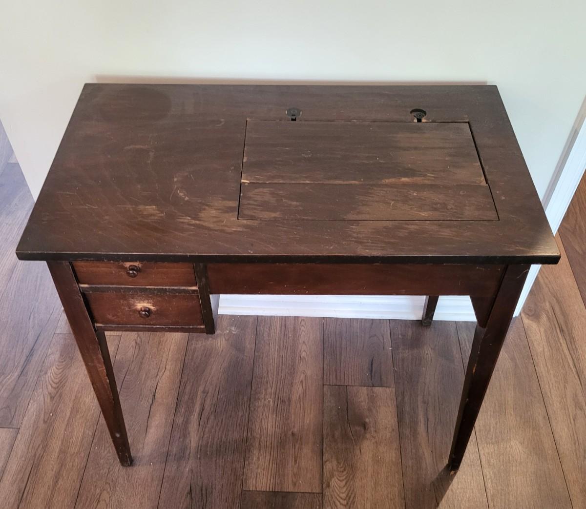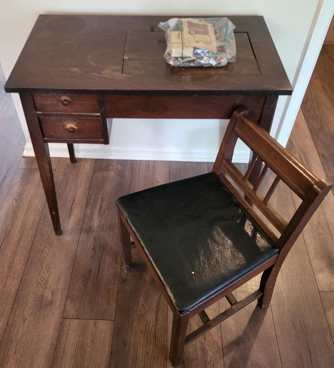 LOT 28L: Antique Singer Wooden Sewing Table and Chair with Vintage Sewing Machine and Various Sewing Supplies