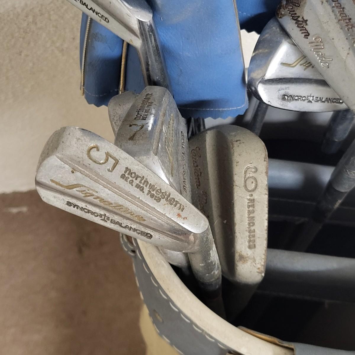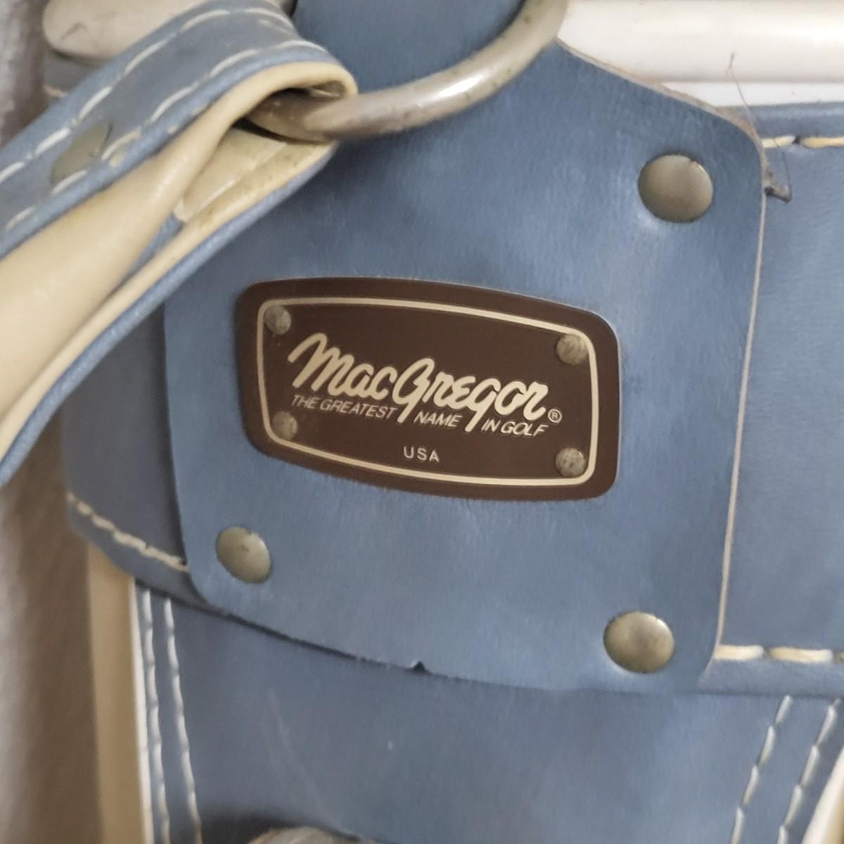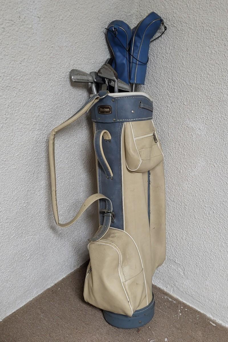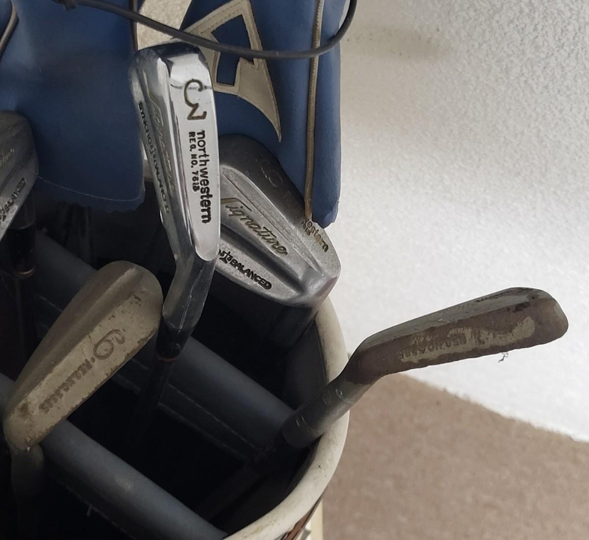 LOT 30B: Vintage Tan & Blue MacGregor Golf Bag with Set of Northwestern Golf Clubs