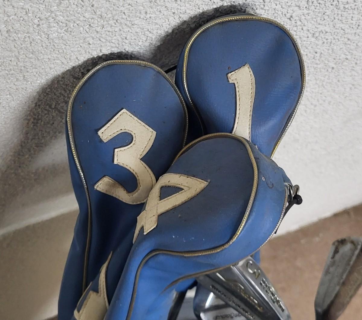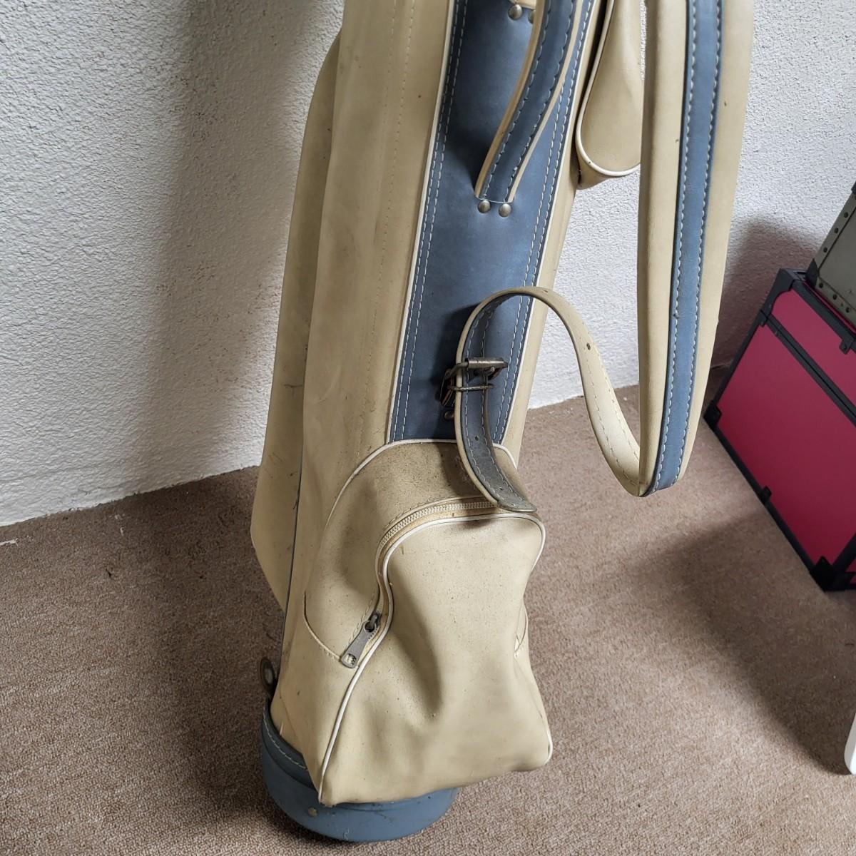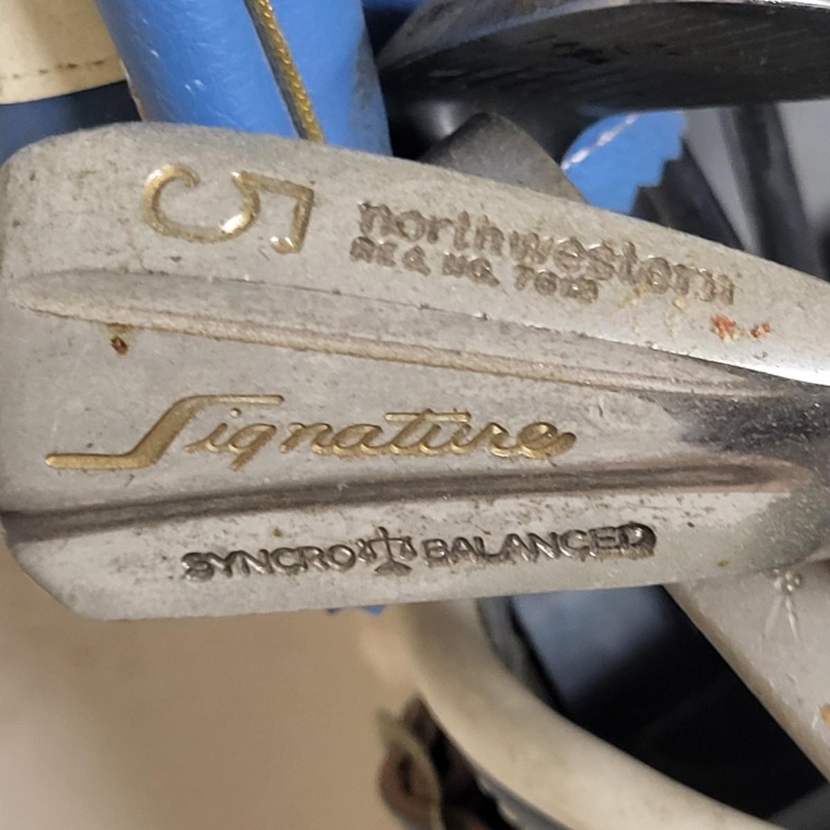 LOT 30B: Vintage Tan & Blue MacGregor Golf Bag with Set of Northwestern Golf Clubs
