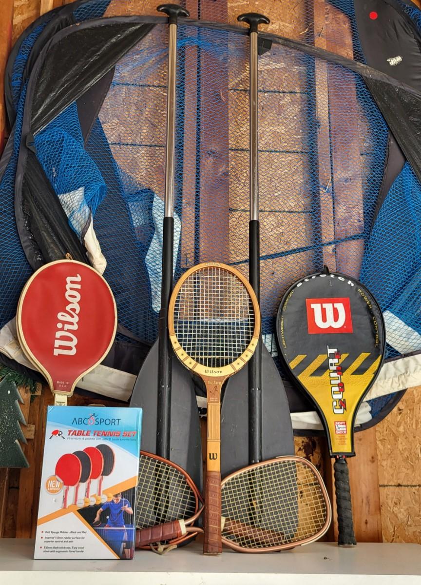 LOT 77G: Sport Equipment Lot Featuring Vintage Wilson Tennis Rackets, Soccer Nets & More