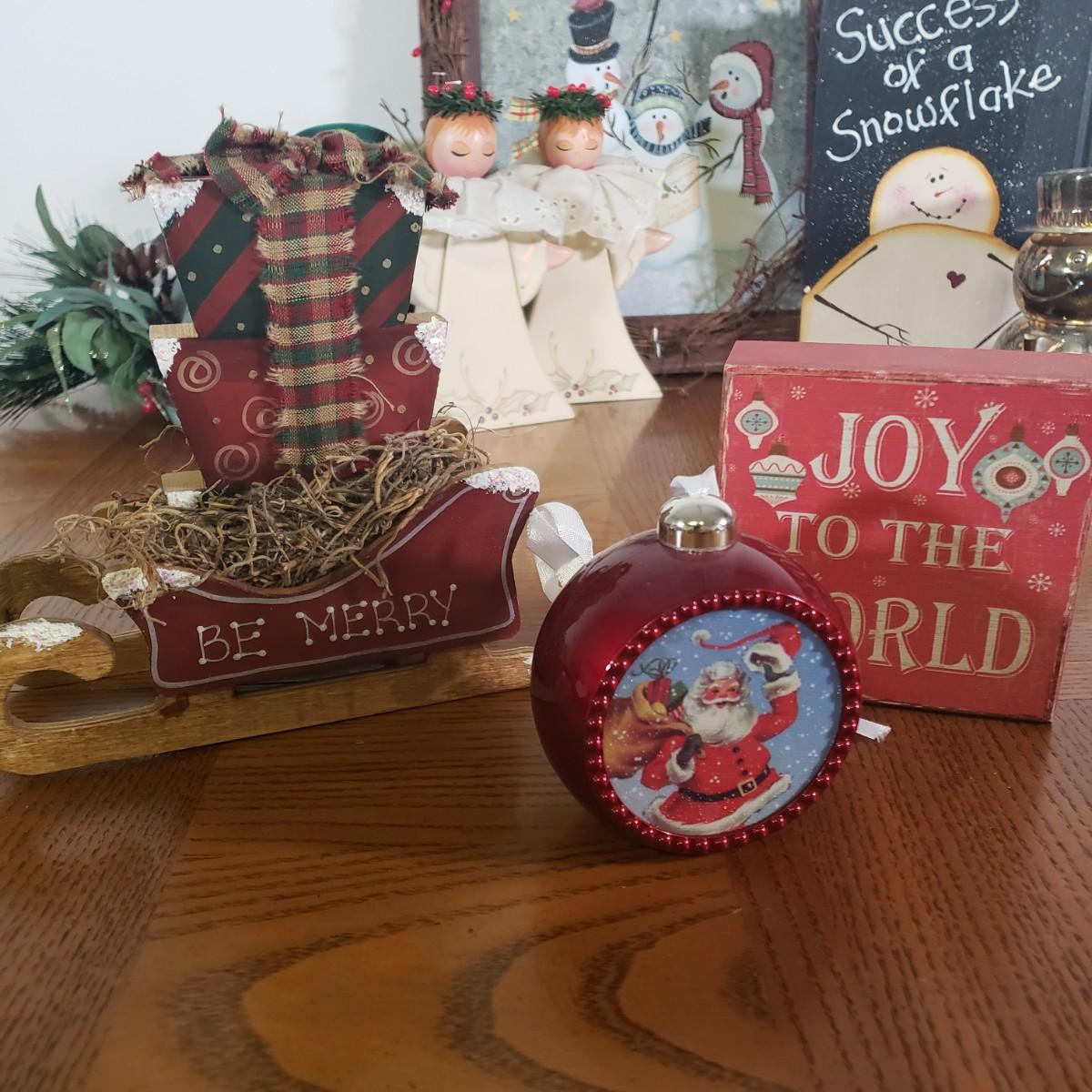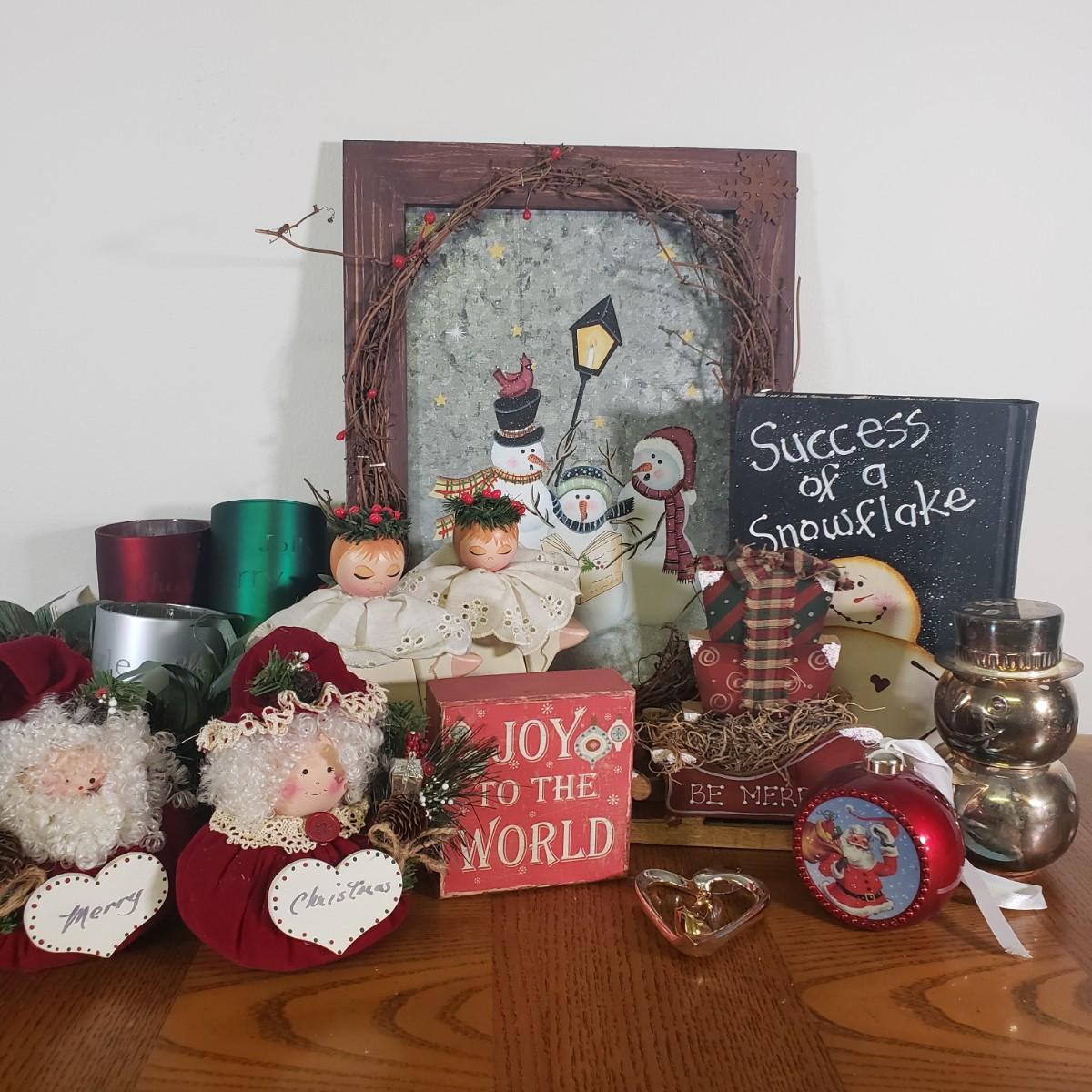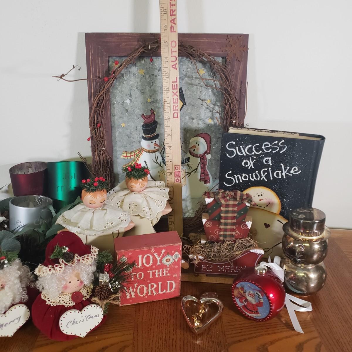 LOT 148B: Assorted Christmas & Rustic Holiday Decor with Adorable Snowman Sugar & Creamer Set