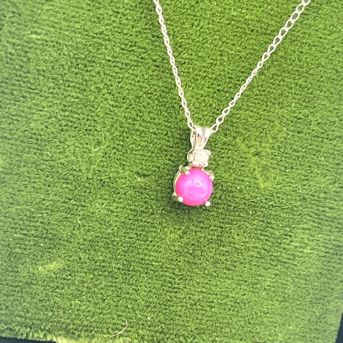 LOT 48: 14K White Gold Pink Cat's Eye and Diamond Pendant on 17" Necklace - 1.2 GTW