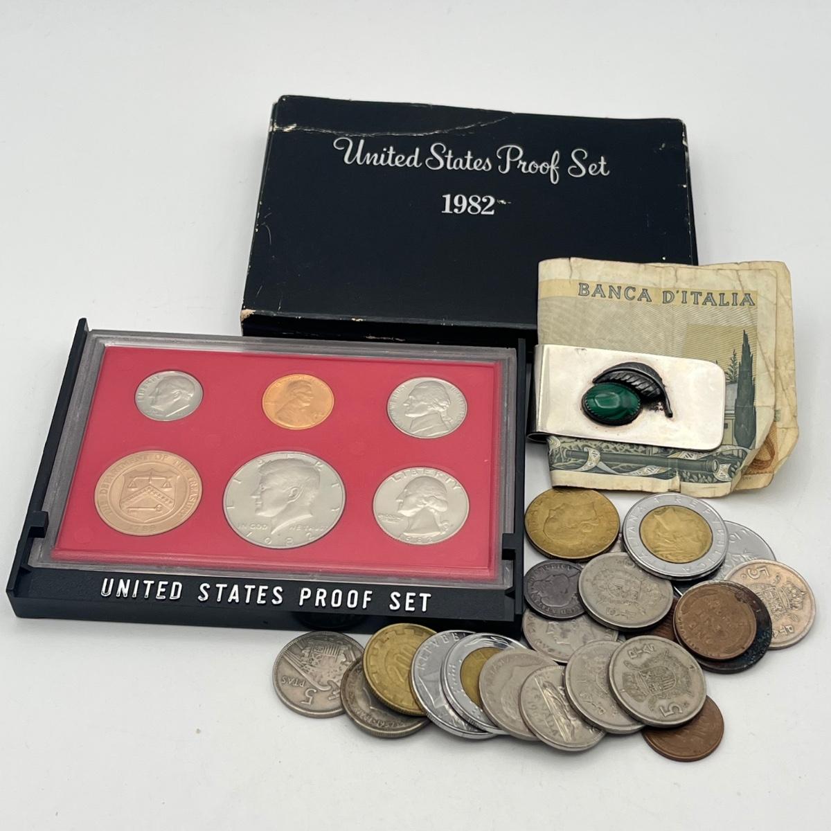 LOT 56: 1982 US Coin Proof Set, Miscellaneous Coins, Malachite Money Clip and Italian Paper Currency