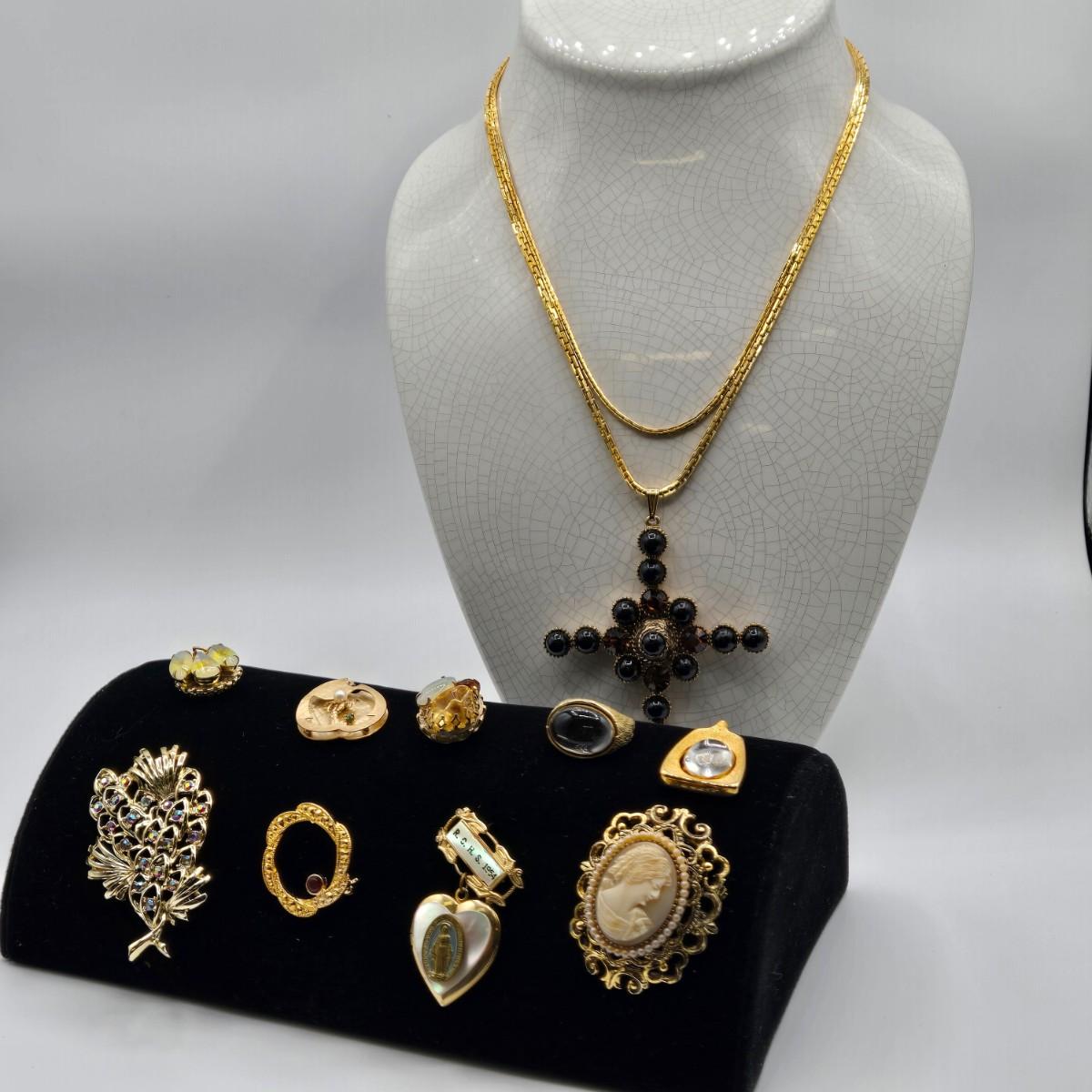 LOT 85: Vintage Jewelry Including Brooches, Necklace with Multiple Charms, and More