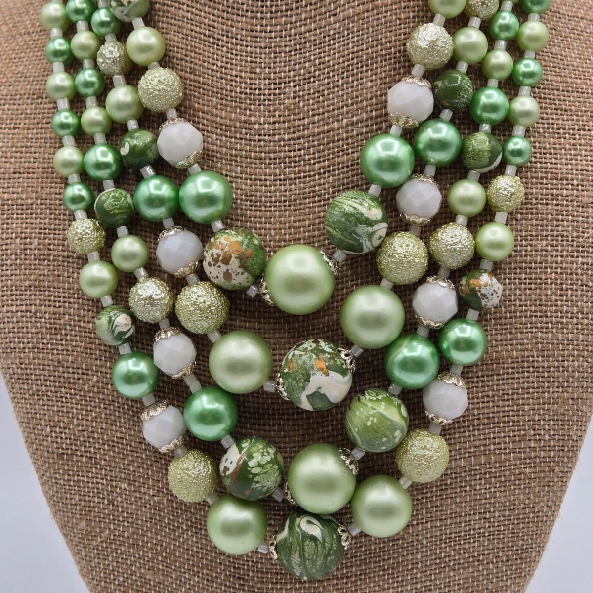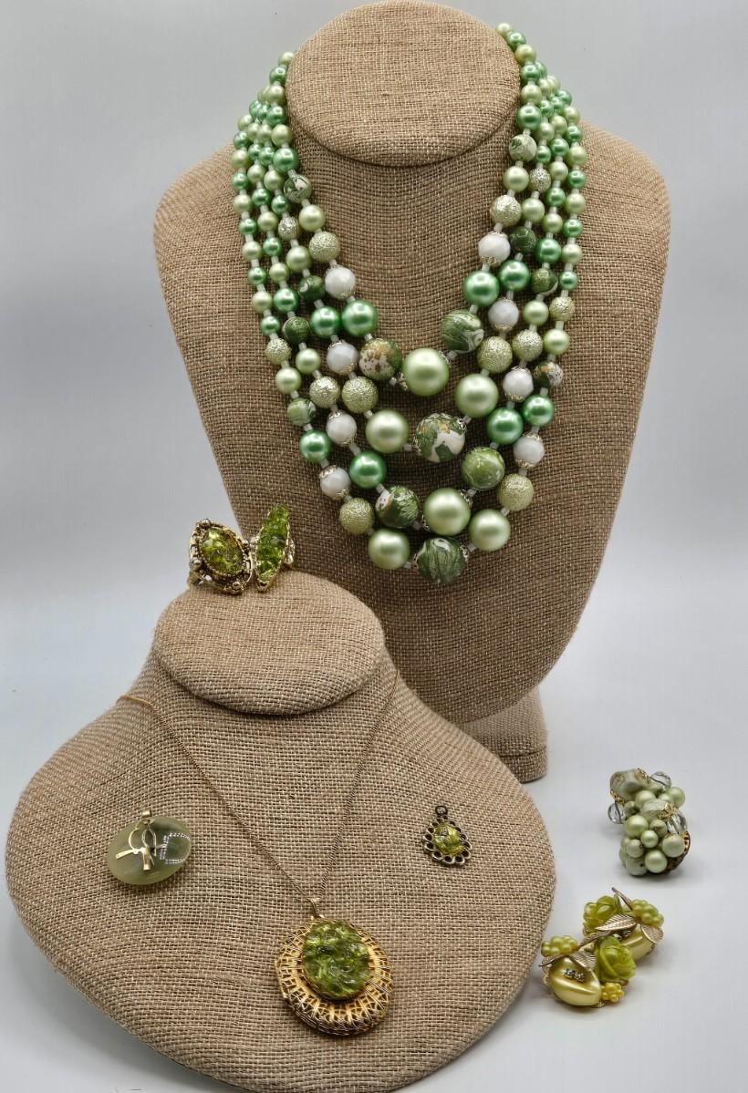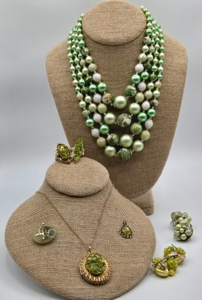 LOT 91: Beautiful Vintage Green Bead Necklace, Gold-tone Chain with Multiple Charms, Clip Earrings, and More