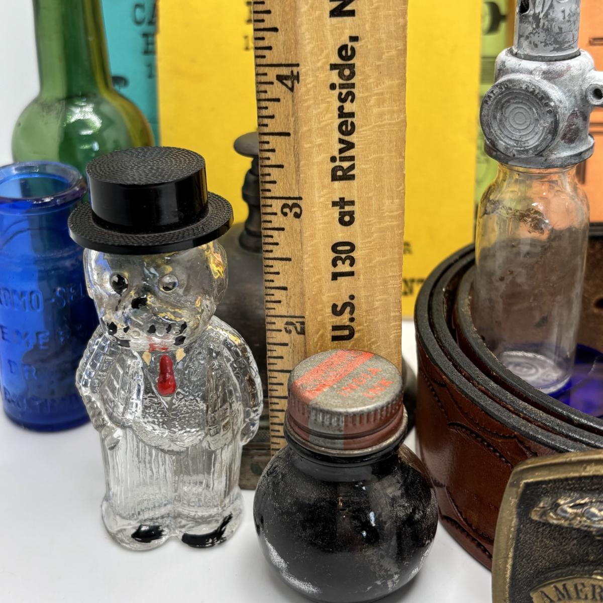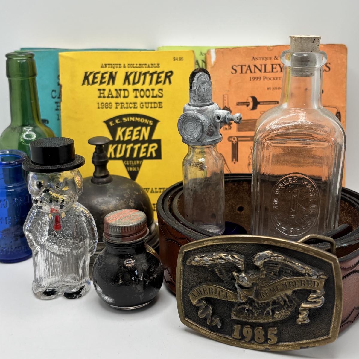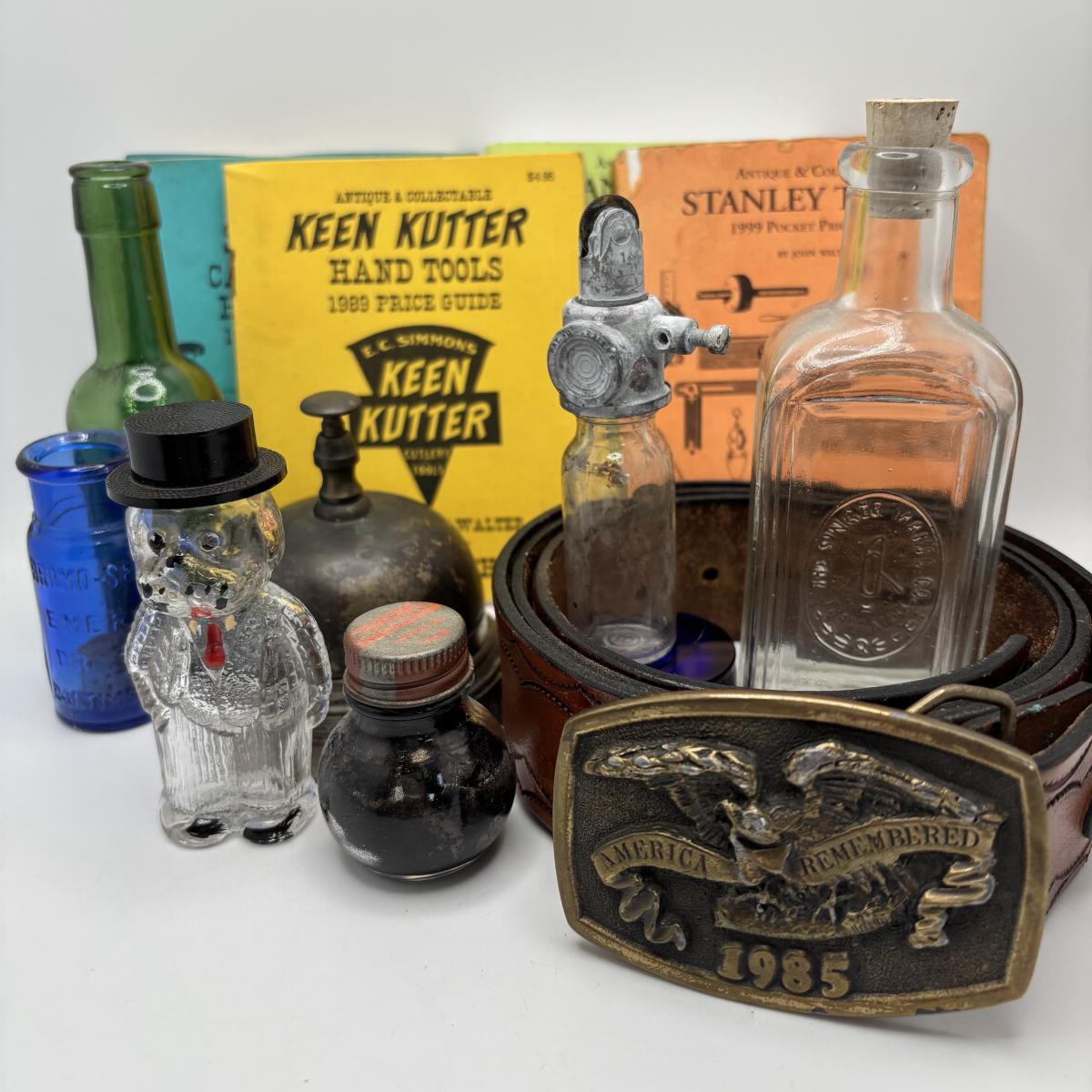 LOT 248: America Remembered 1985 Park City Belt Buckle, Pin Striping Tool, Glass Dog Perfume Bottle & More