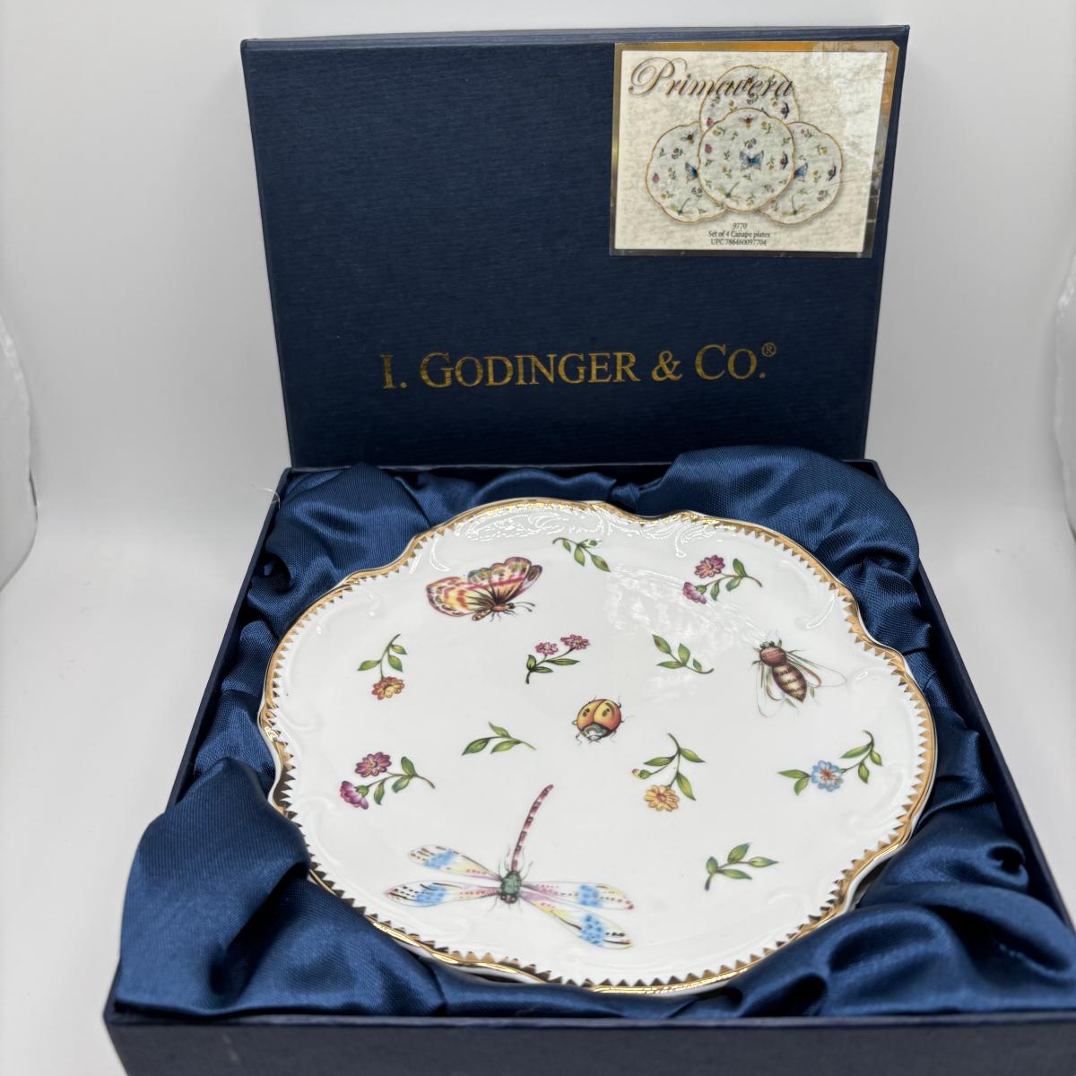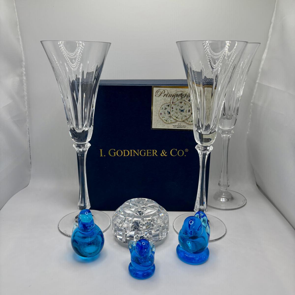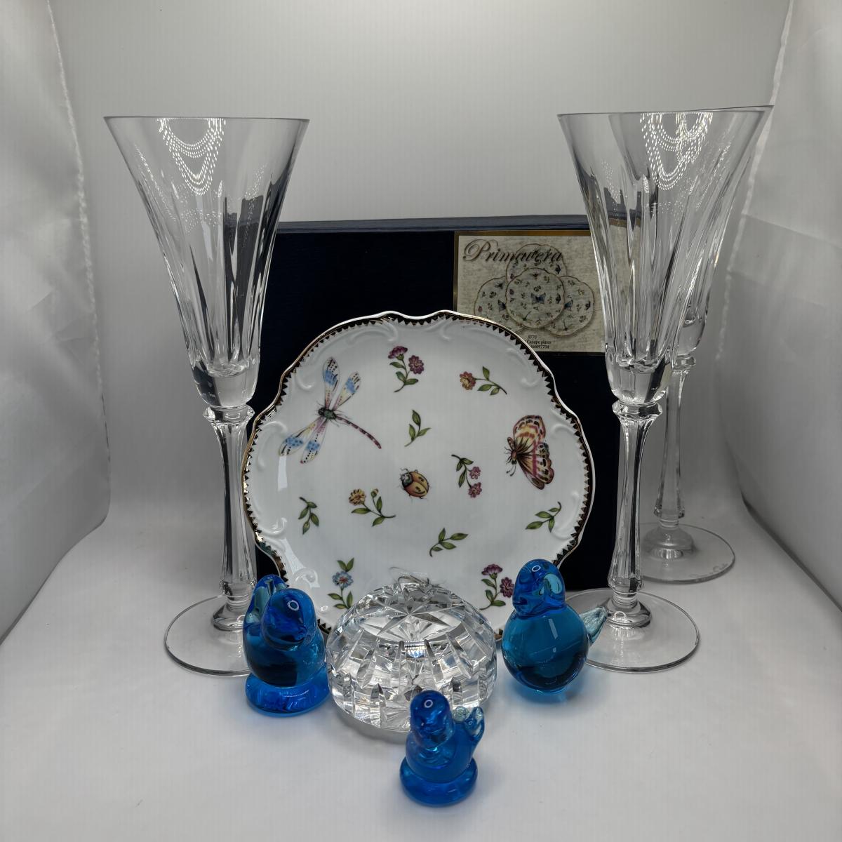 LOT 252 Signed Oscar de la Renta Champagne Glasses, I. Godinger & Co Primavera Canapés Plates, Waterford Crystal Paperweight & More