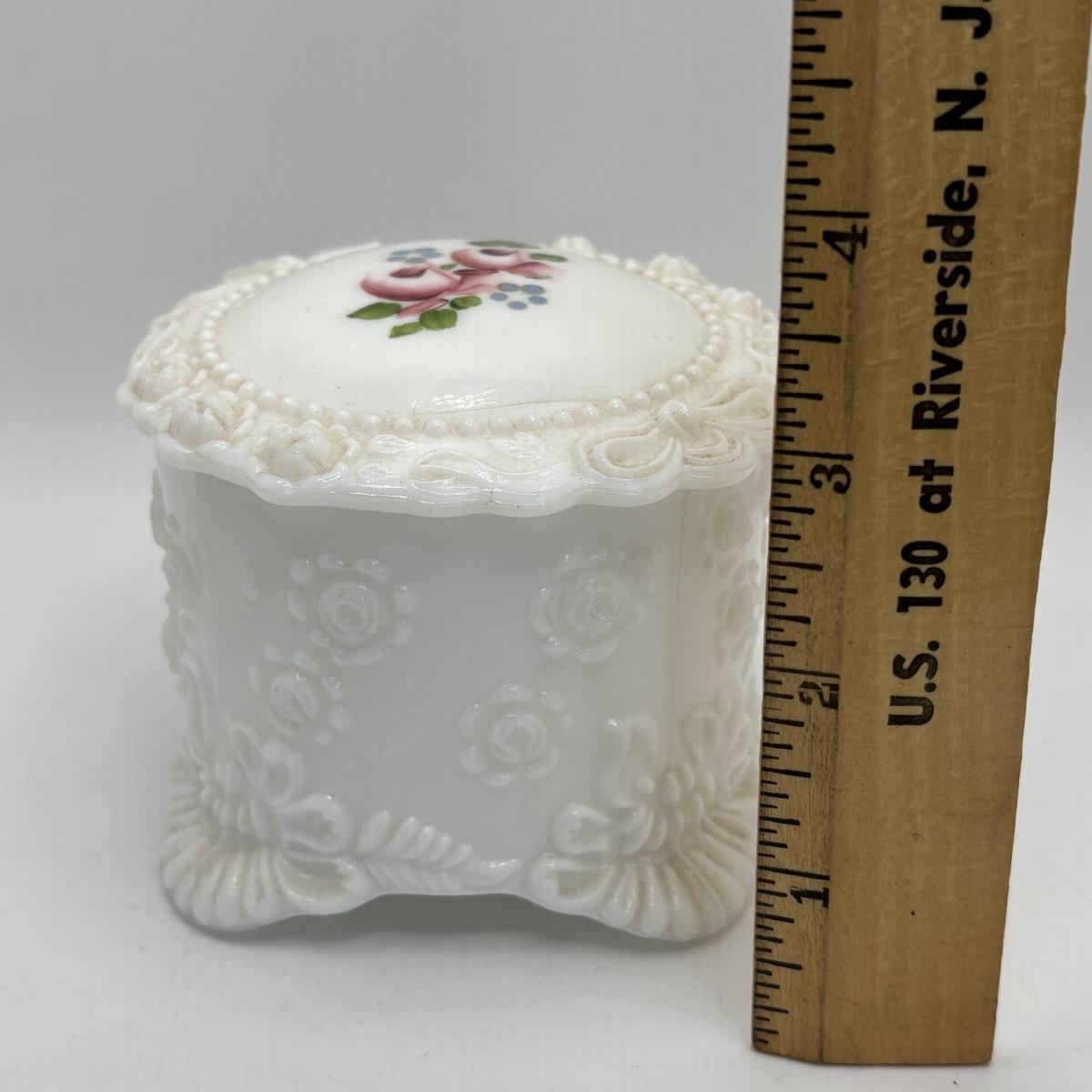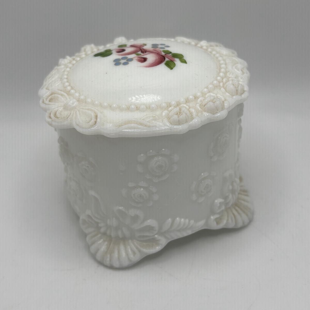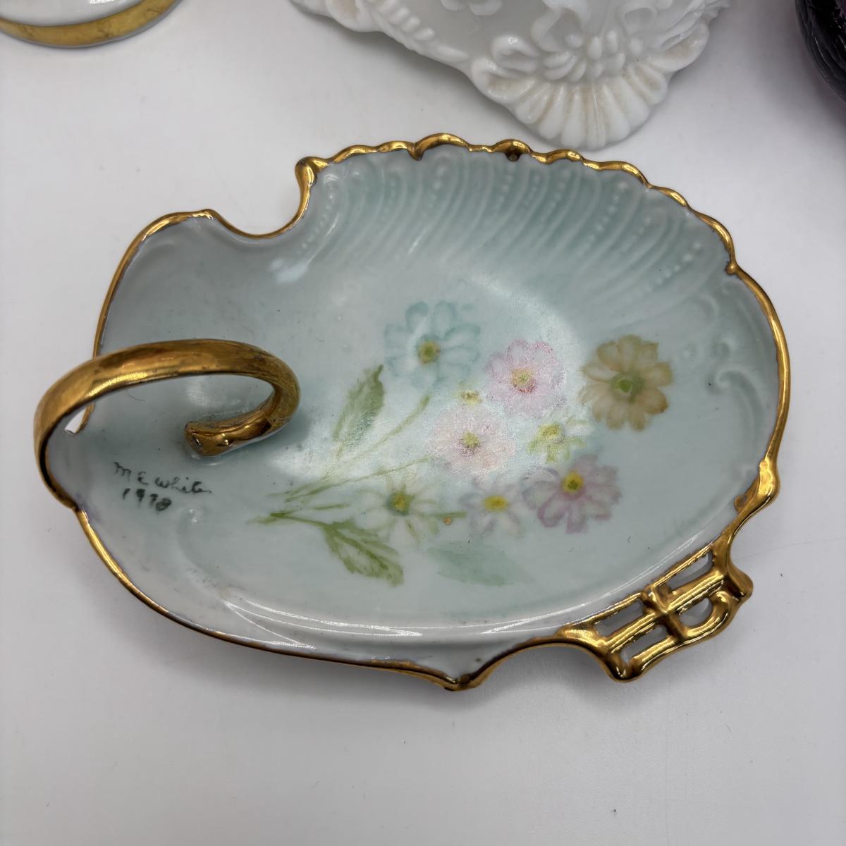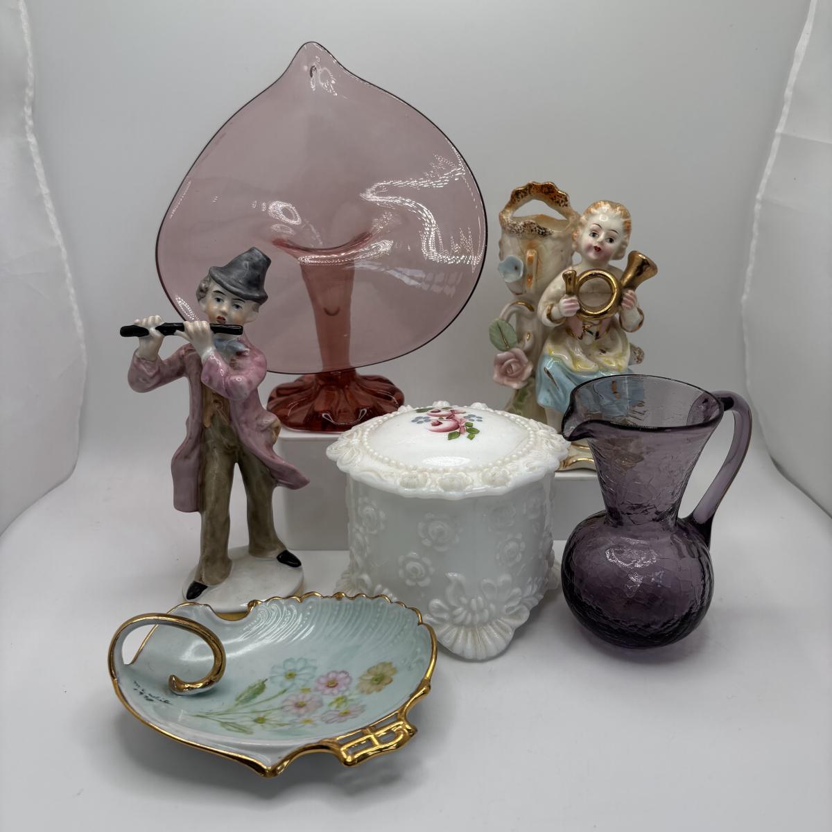 LOT 253: Hand Painted Trinket Dish, Purple Pitcher Plant Vase, Painted Milk Glass Trinket Box & More