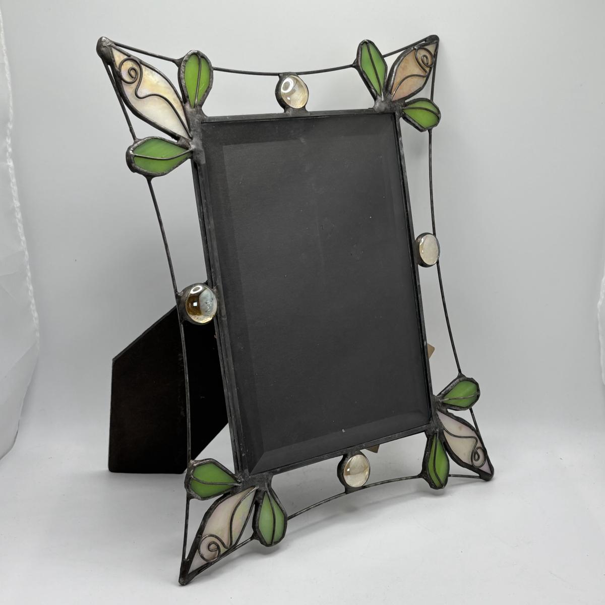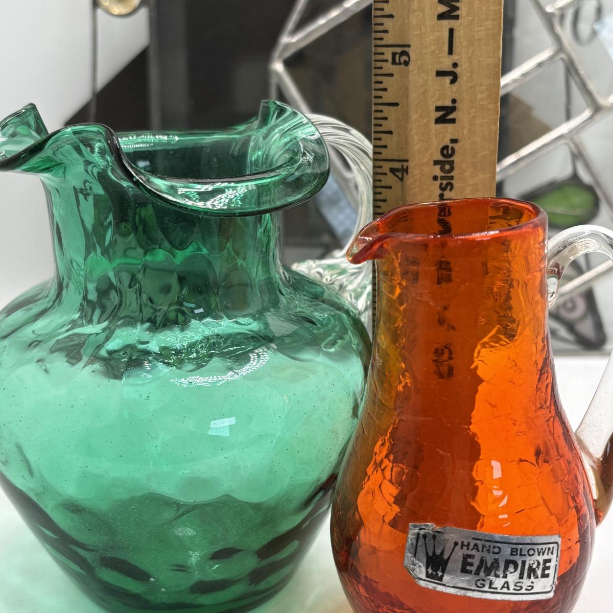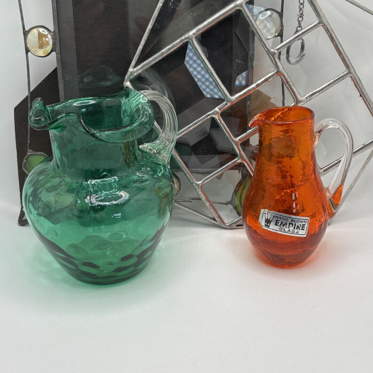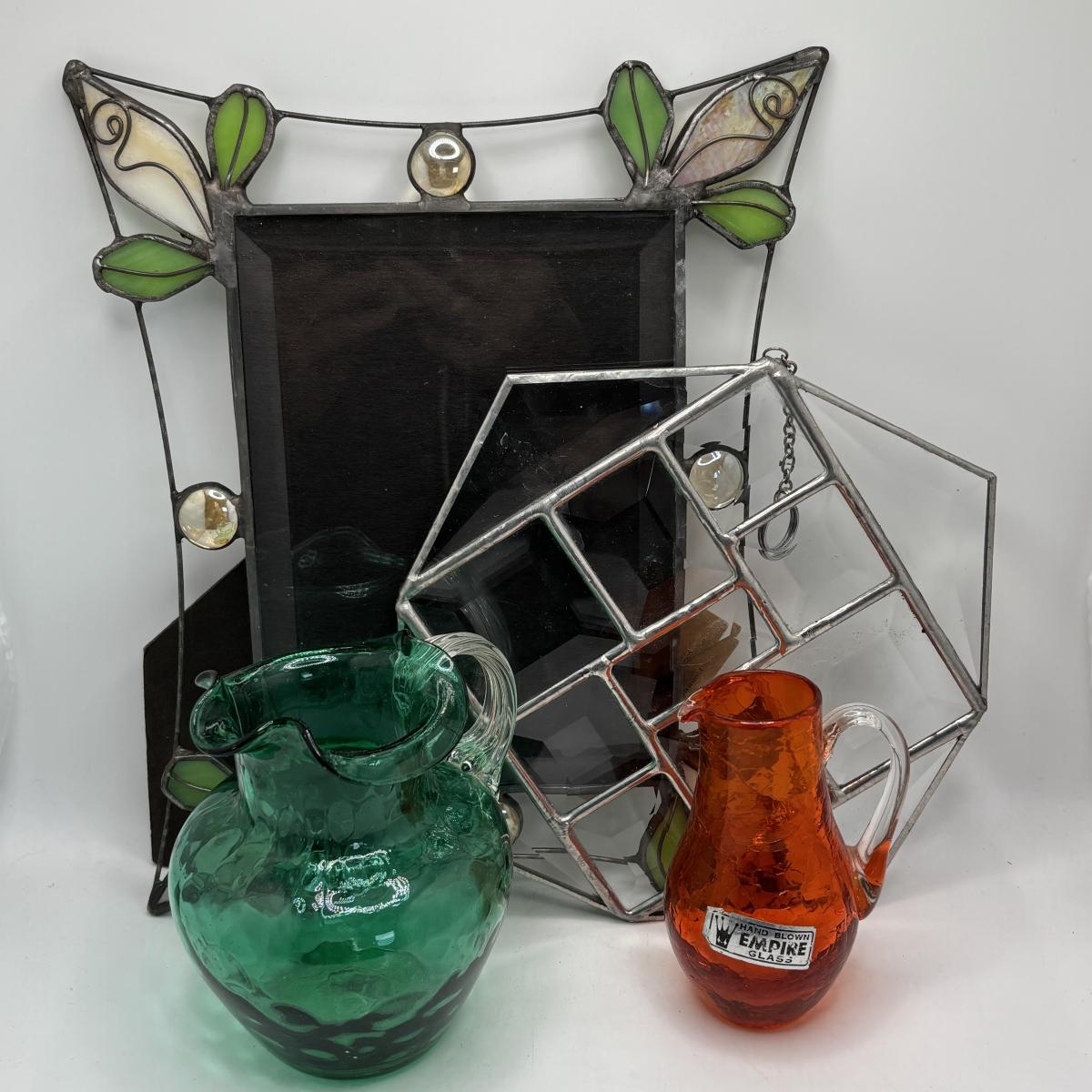 LOT 255: Art Glass Collection: Stained Glassed Diane Markin Picture Frame, Beveled Diamond Cluster-Stained Glass Panel, Green Teal Pitcher & Orange Empire Glass Pitcher