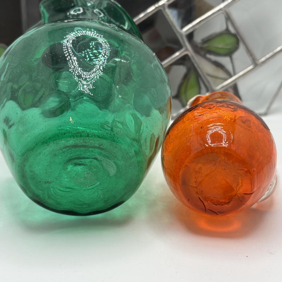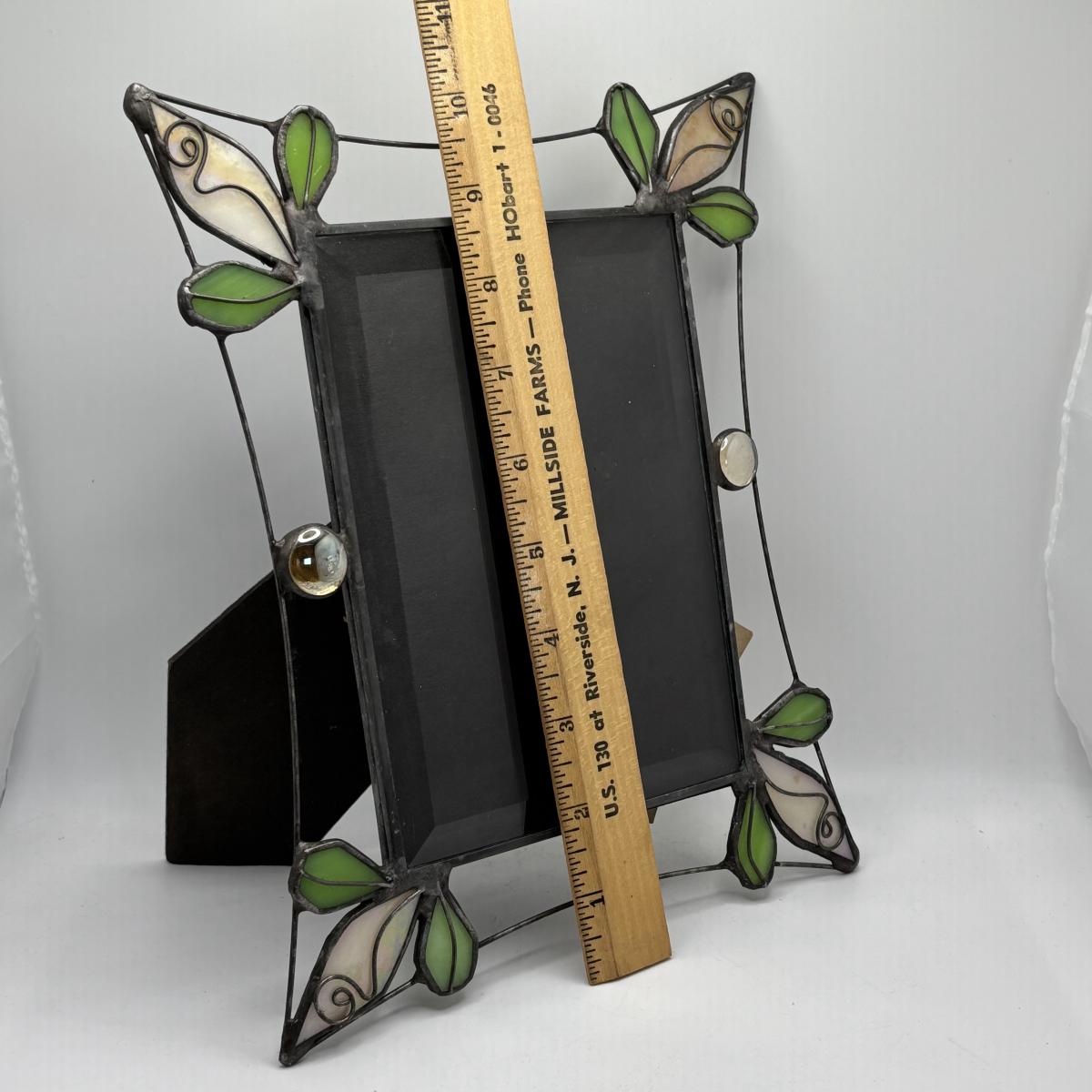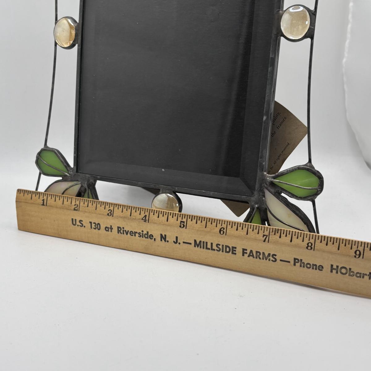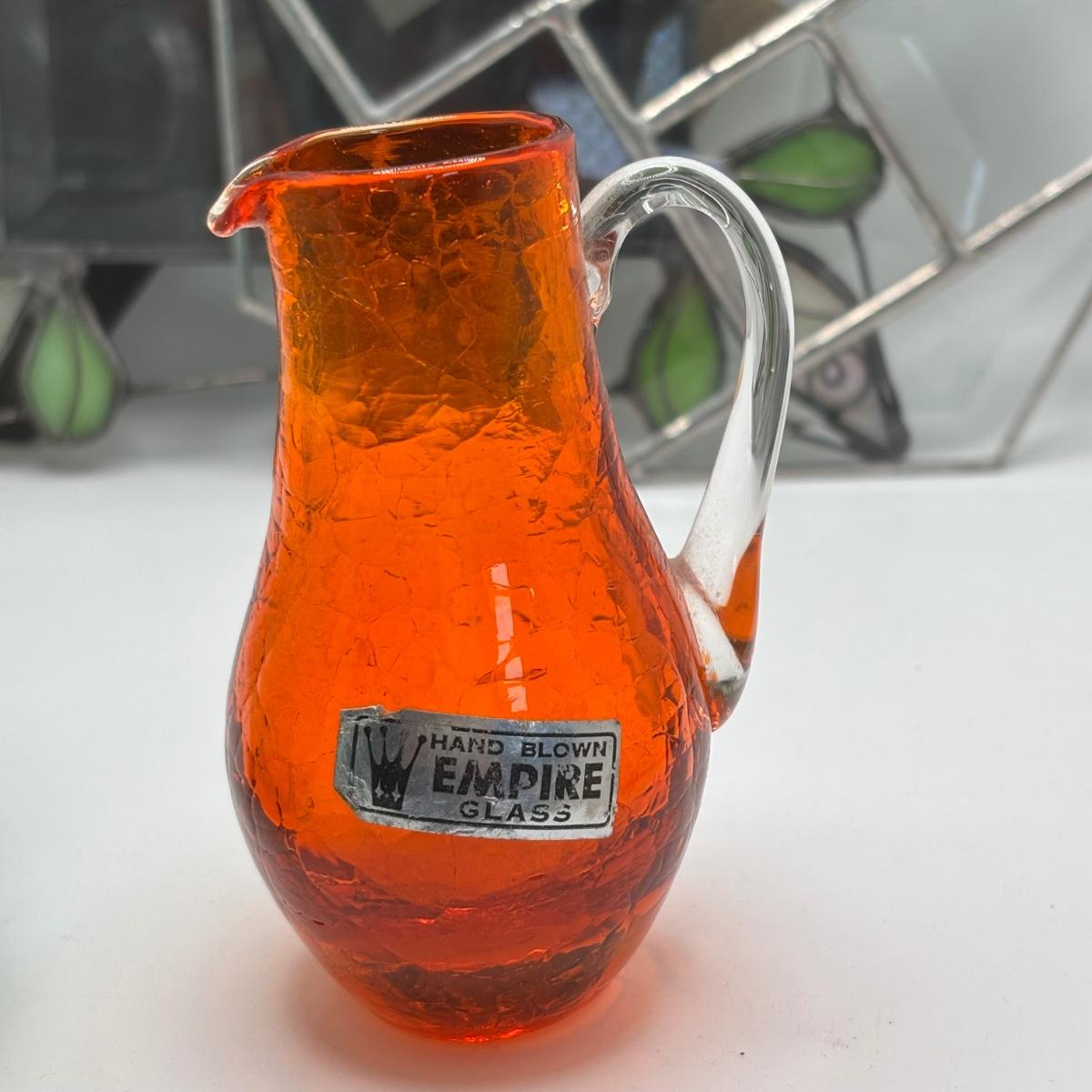 LOT 255: Art Glass Collection: Stained Glassed Diane Markin Picture Frame, Beveled Diamond Cluster-Stained Glass Panel, Green Teal Pitcher & Orange Empire Glass Pitcher