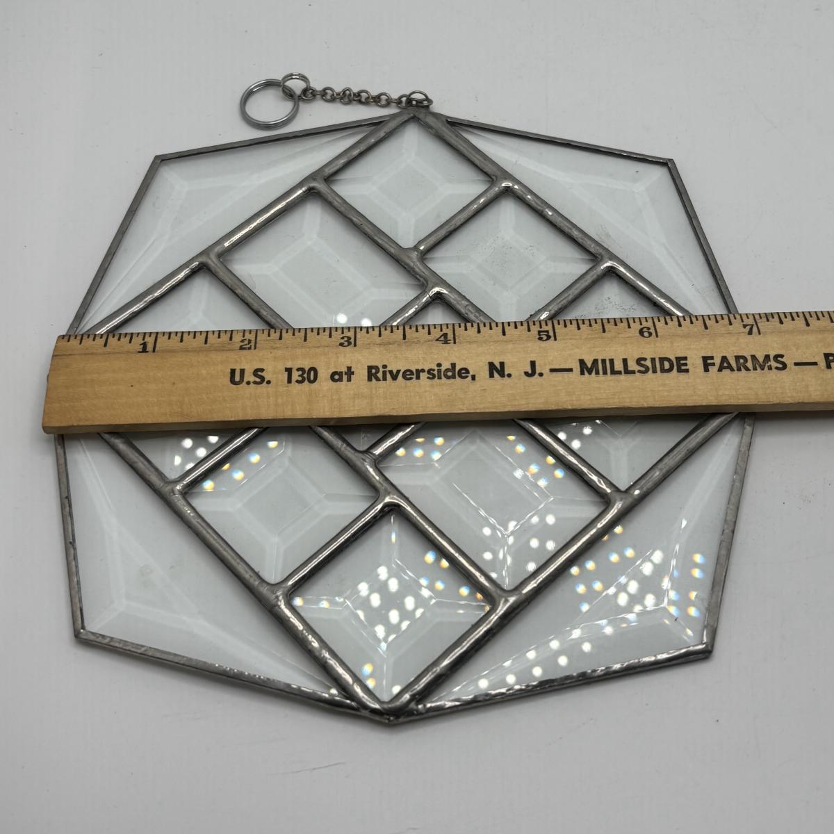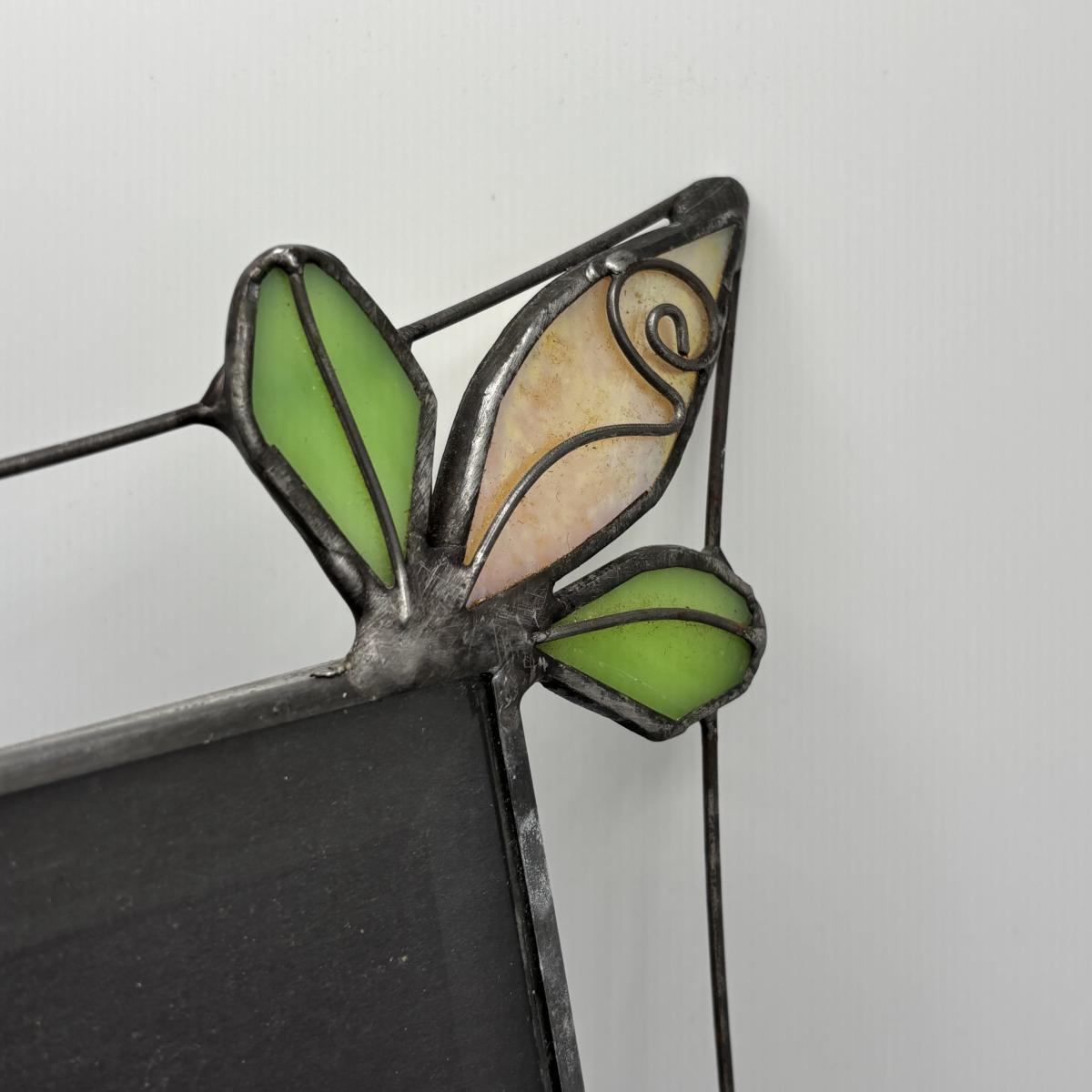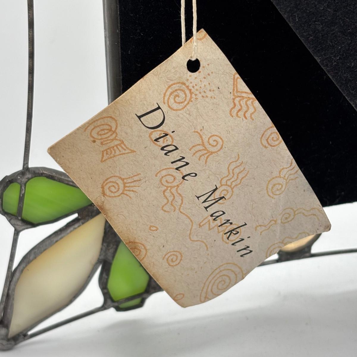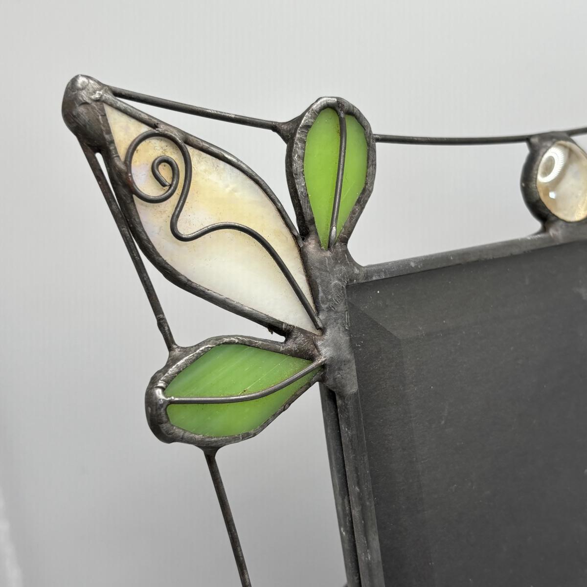 LOT 255: Art Glass Collection: Stained Glassed Diane Markin Picture Frame, Beveled Diamond Cluster-Stained Glass Panel, Green Teal Pitcher & Orange Empire Glass Pitcher