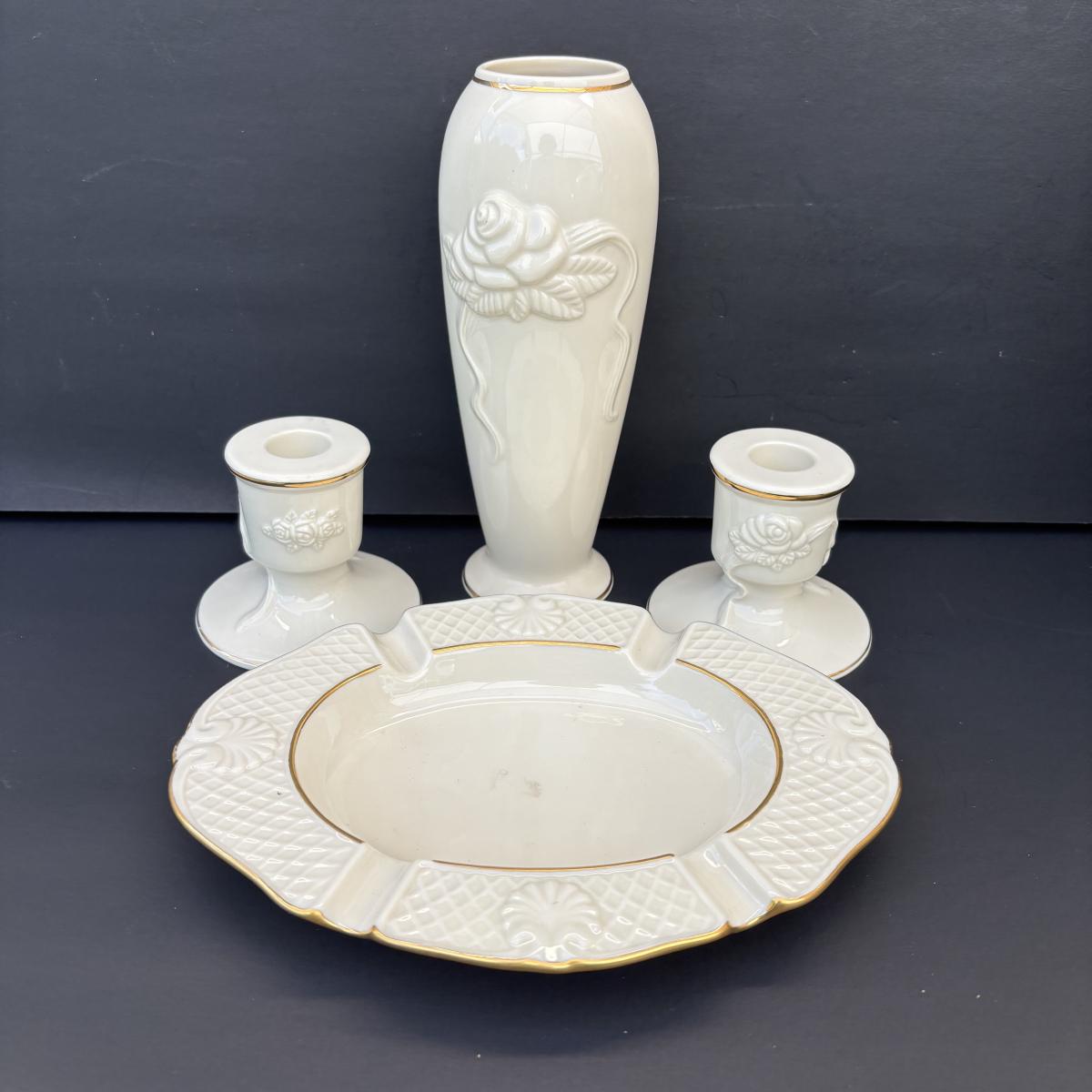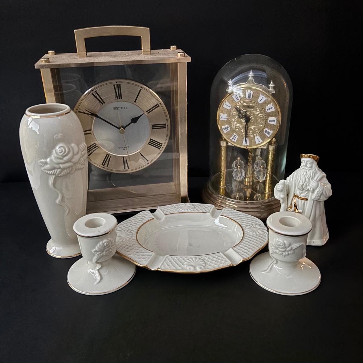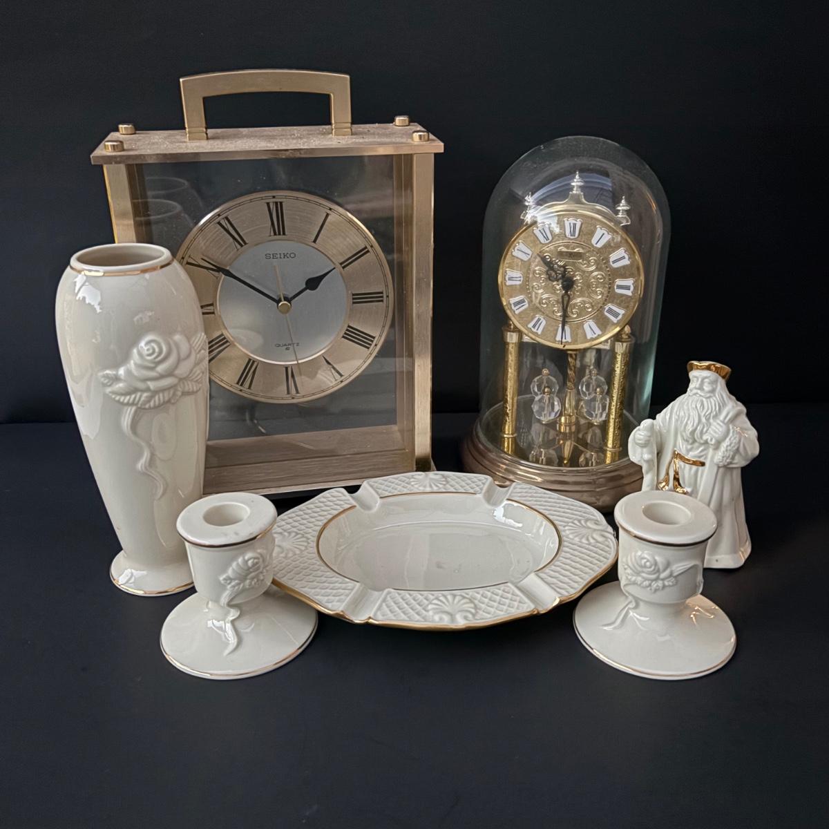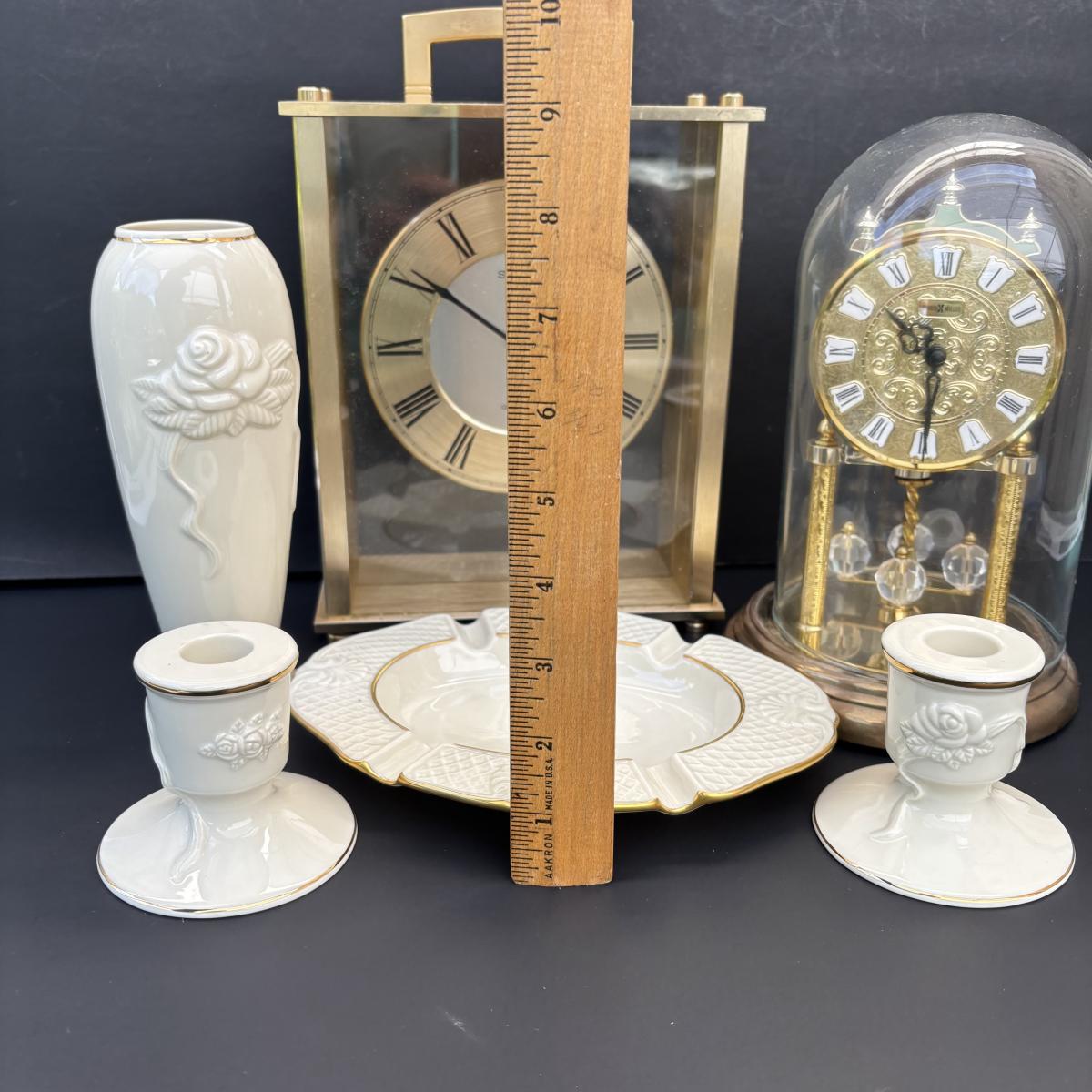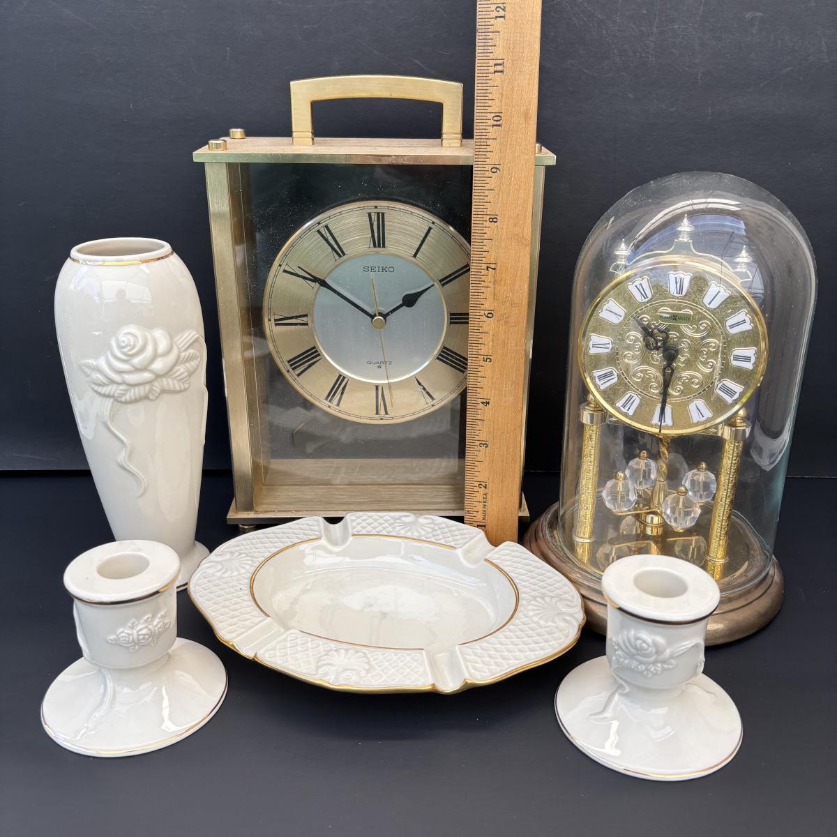 LOT 257: Seiko & Howard Miller Anniversary Clock Battery Operated Clocks and Lenox Vase, Candle Sticks, Ashtray