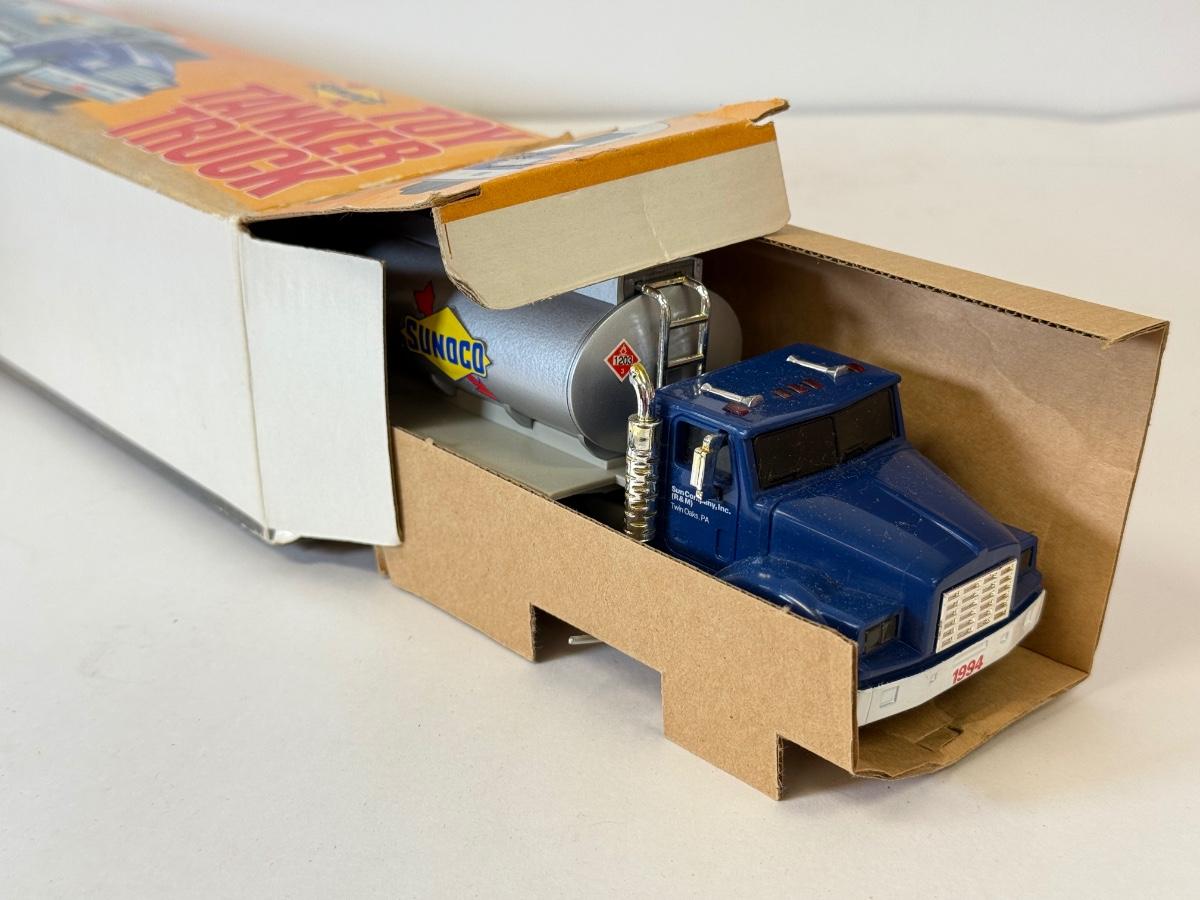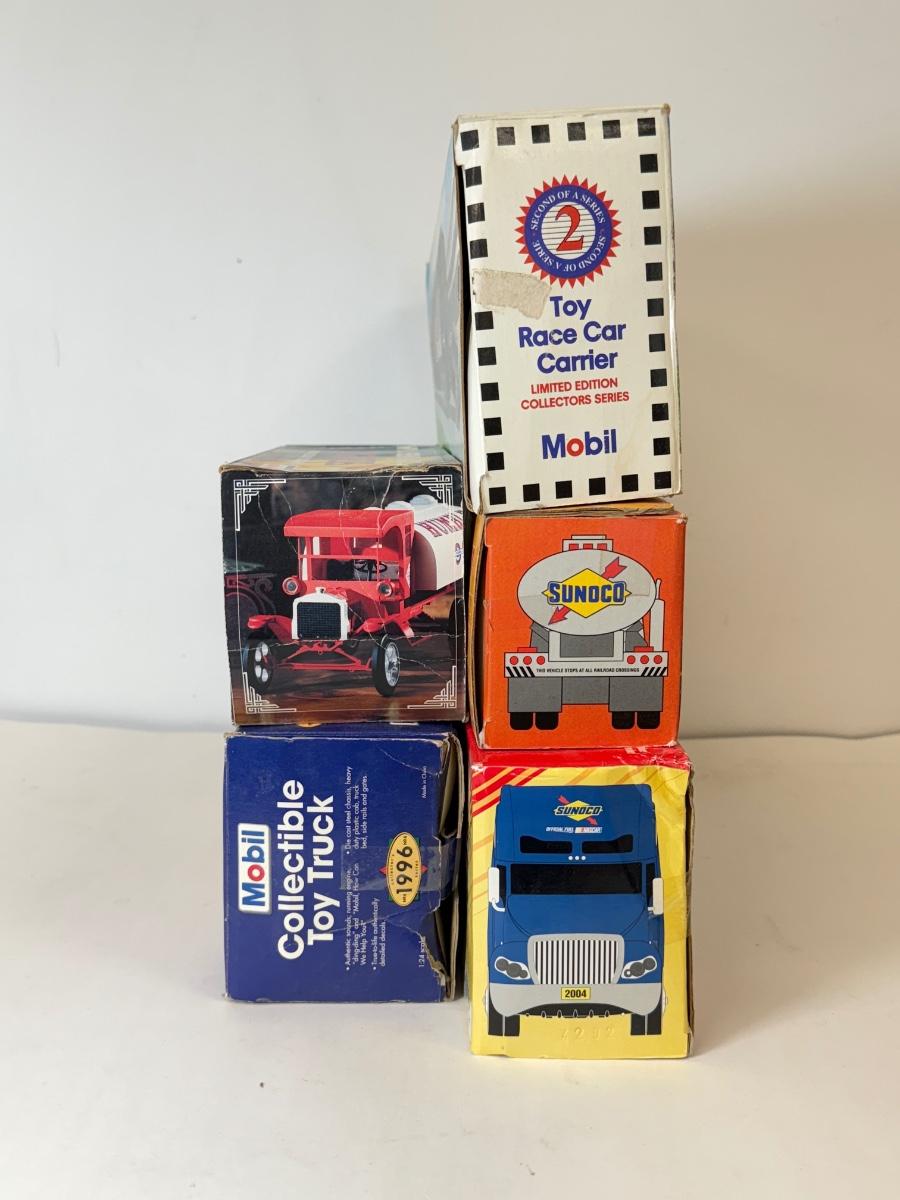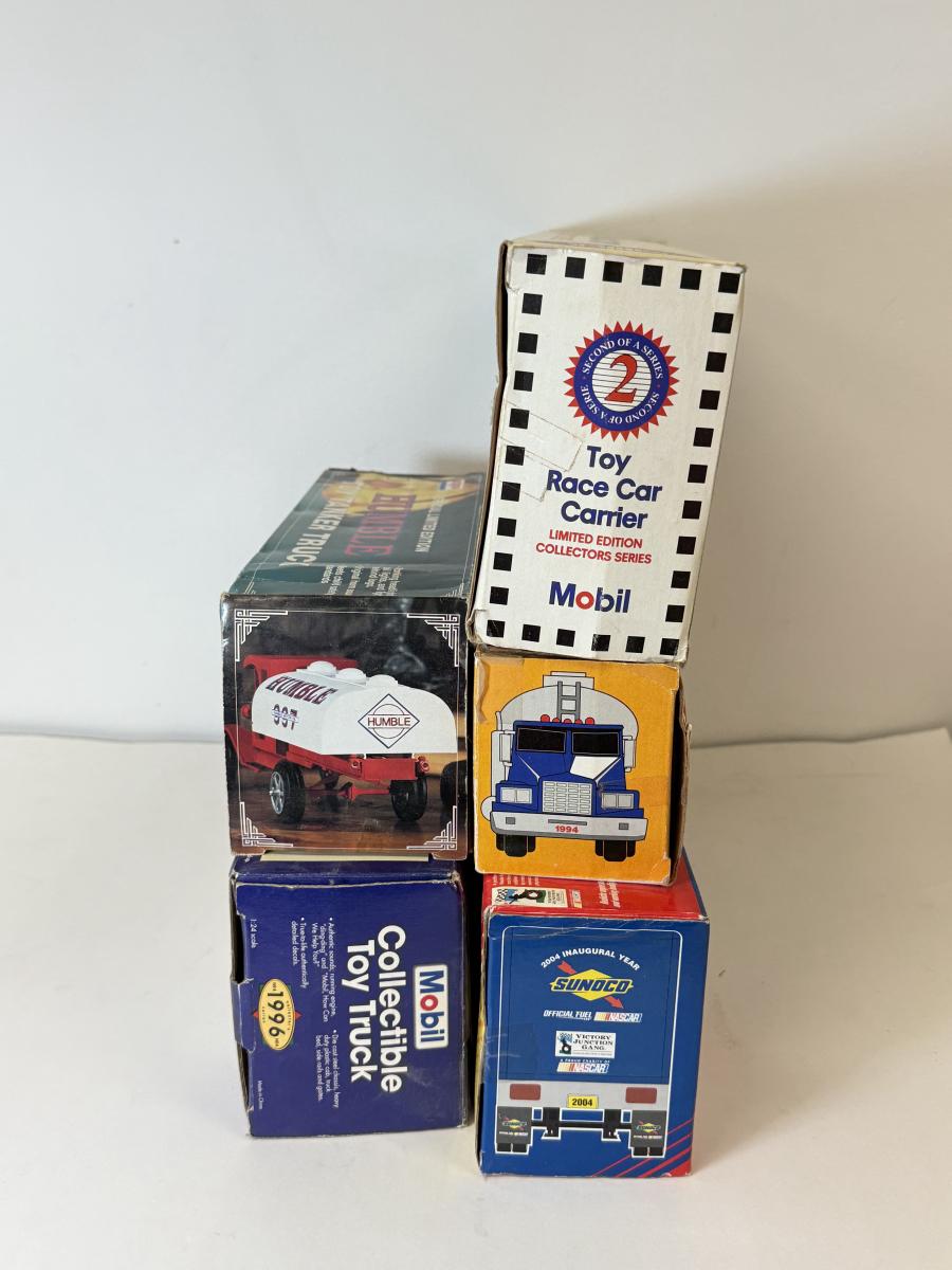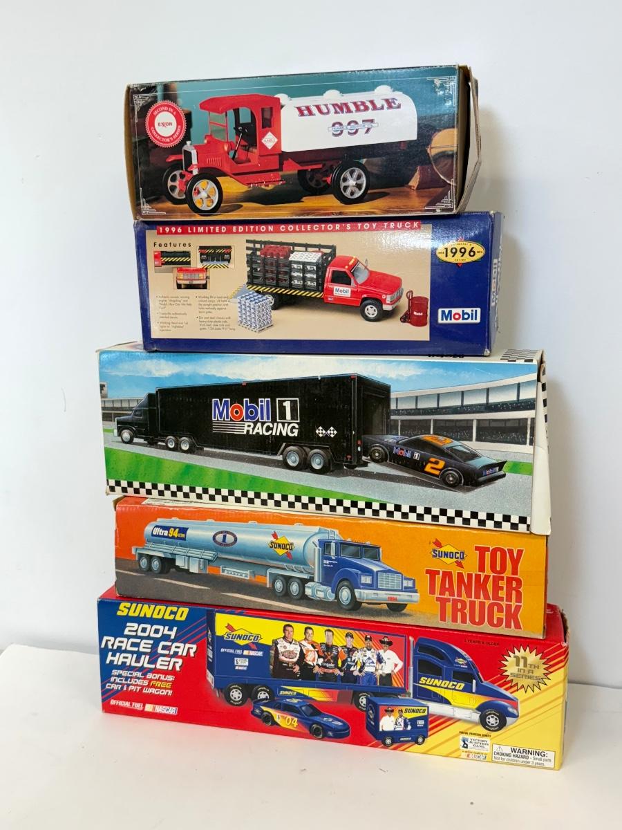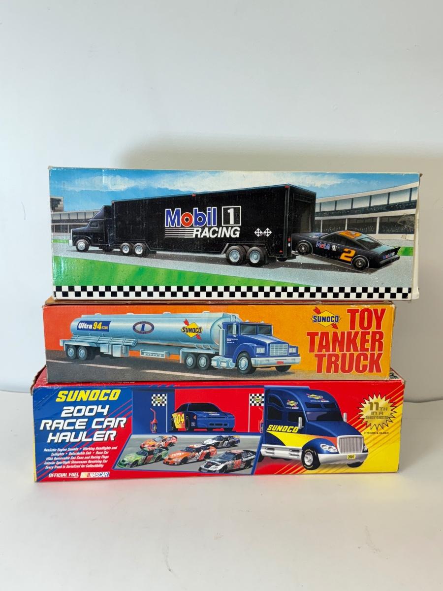 LOT 107: Sunoco Toy Tanker Truck, 2004 Race Car Hauler, Mobile Racing Truck, Humble Toy Tanker Truck & Mobil Collectible Toy Truck