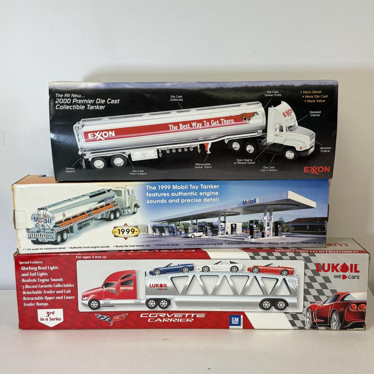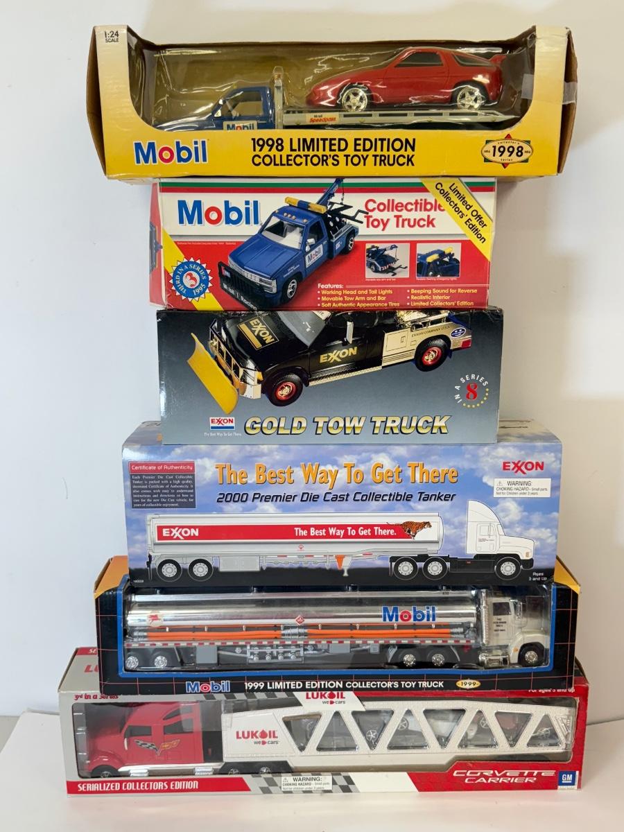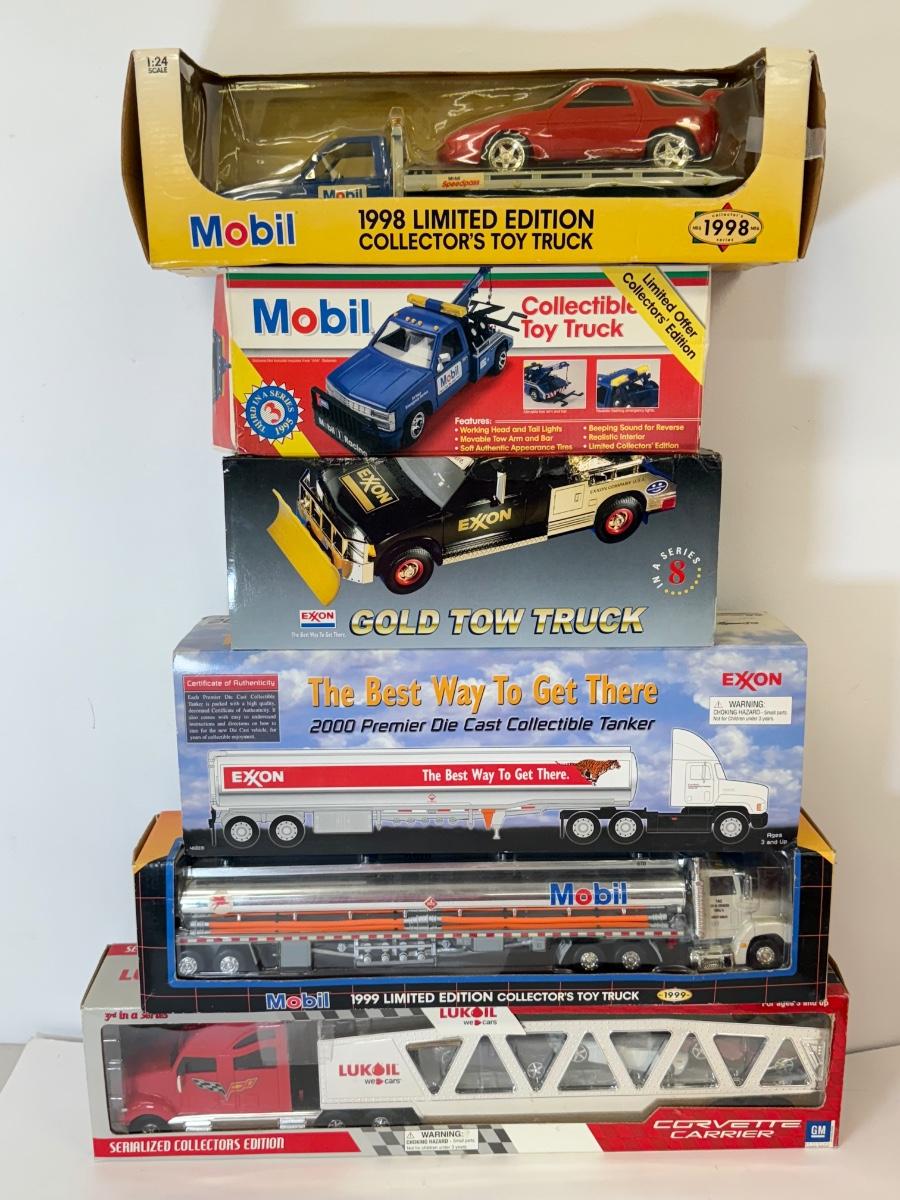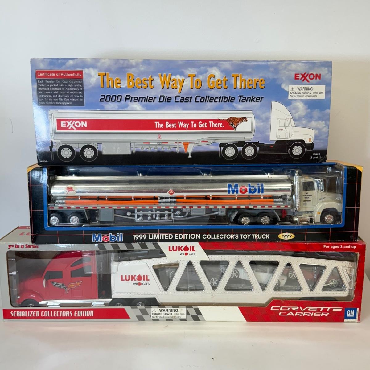 LOT 108: Exxon Diesel Cast Tanker Truck, Lukoil Corvette Carrier, 1999 Mobil LE Collector Toy Truck & More
